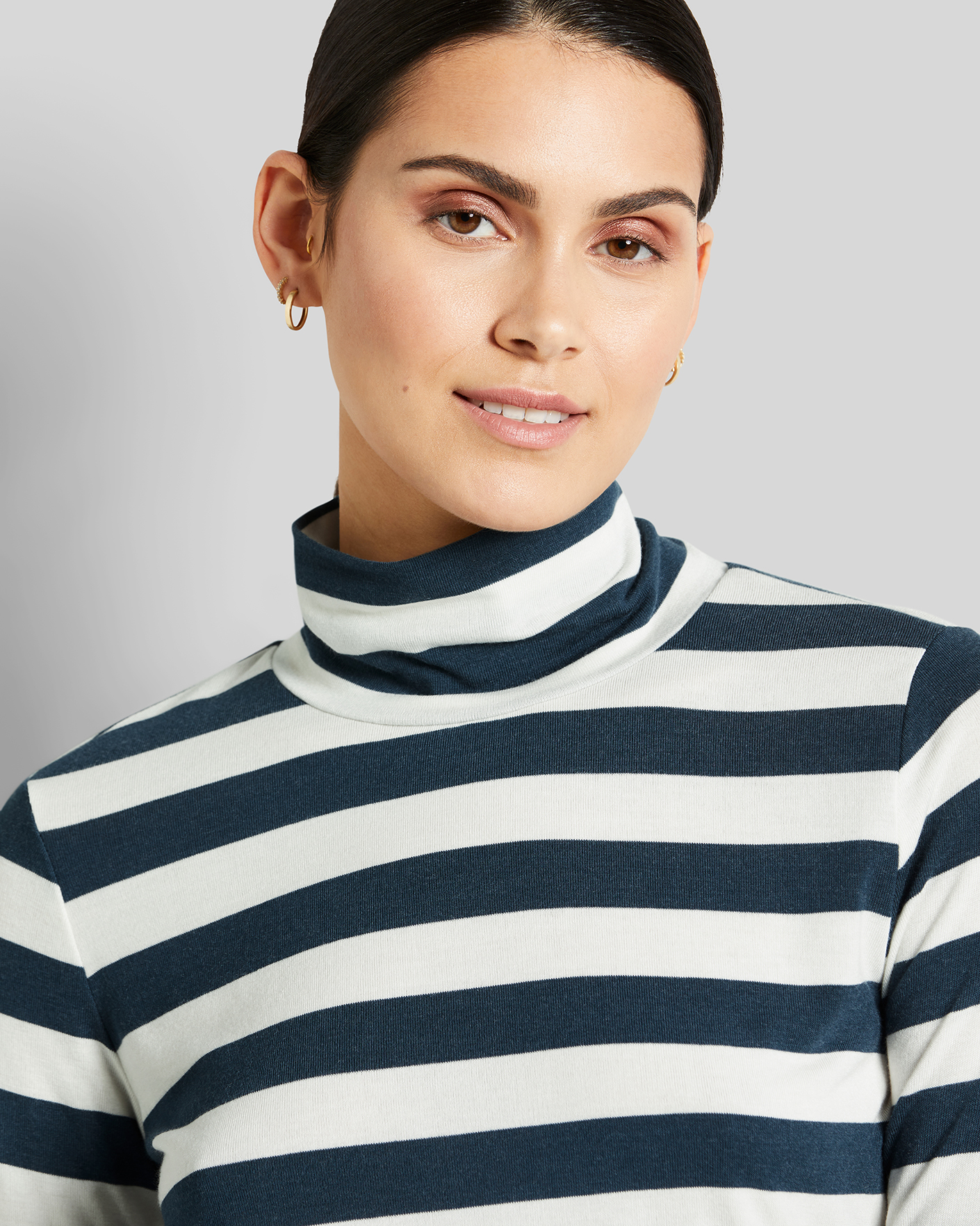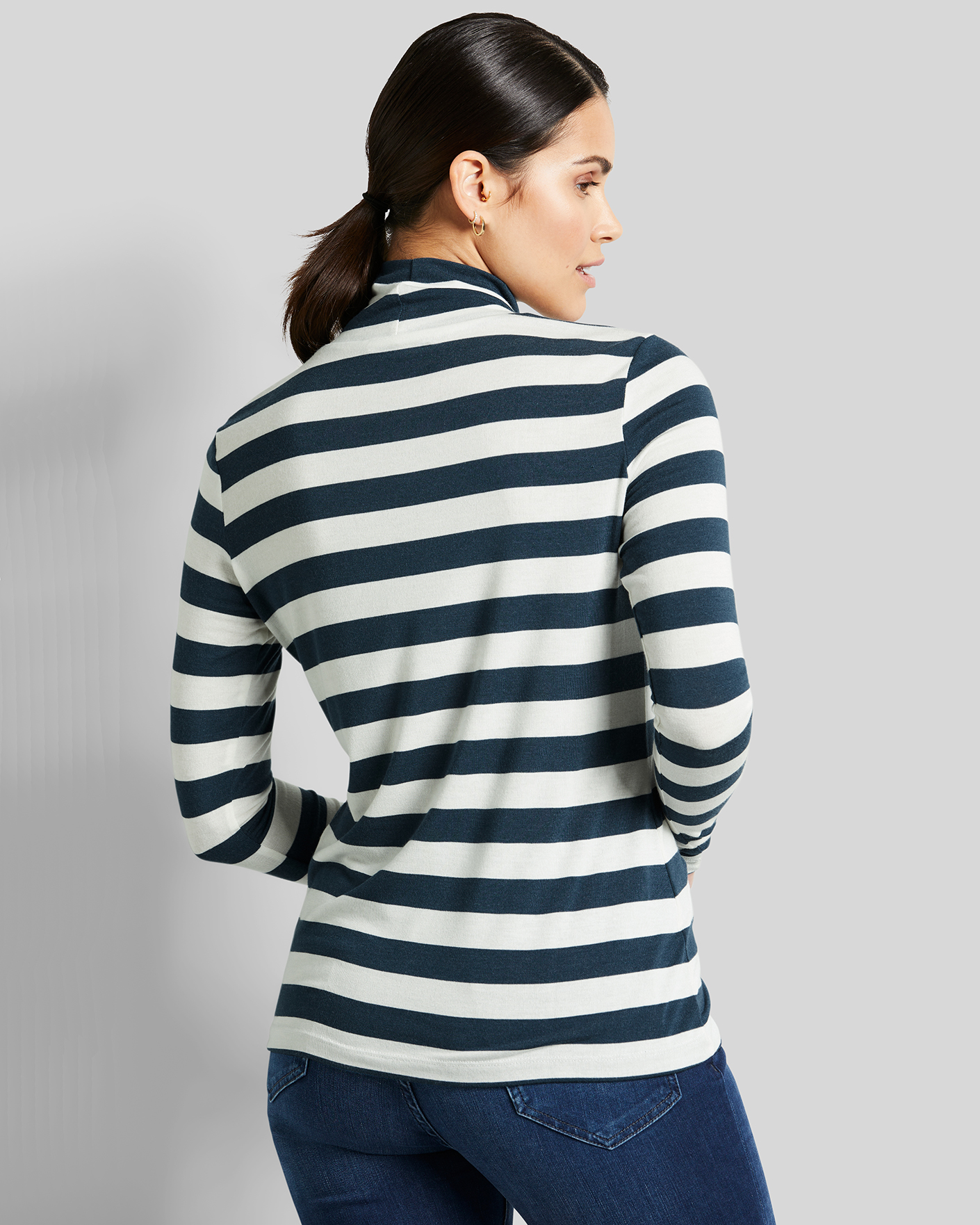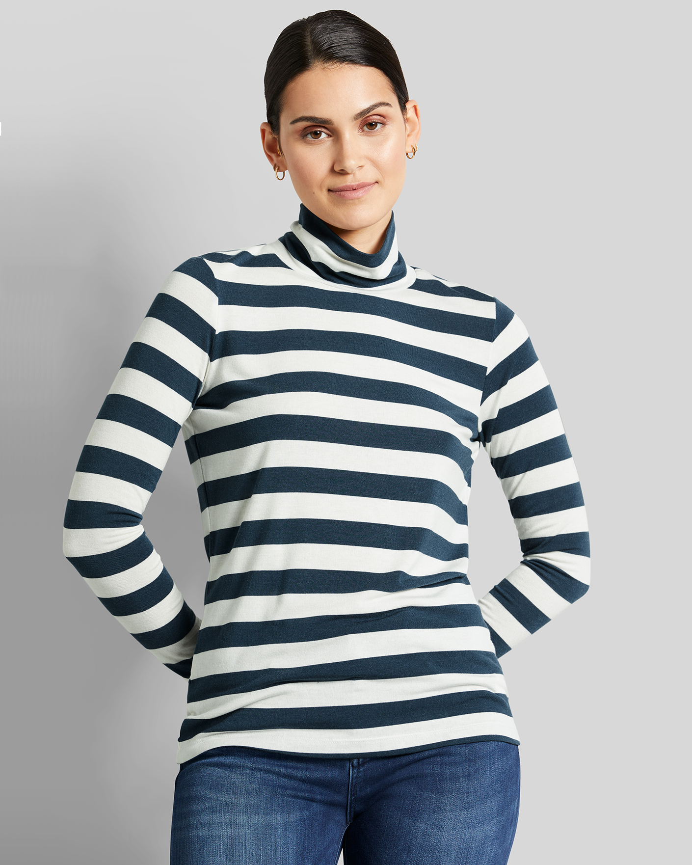 Приталення водолазка Bugatti бело-синего цвета в горизонтальную полосу. Модель с воротником-стойка и длинными рукавами. Водолазку можно носить с любым повседневным гардеробом.