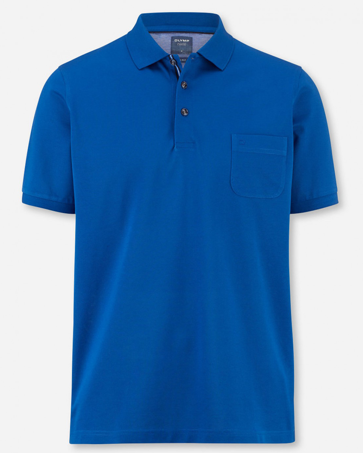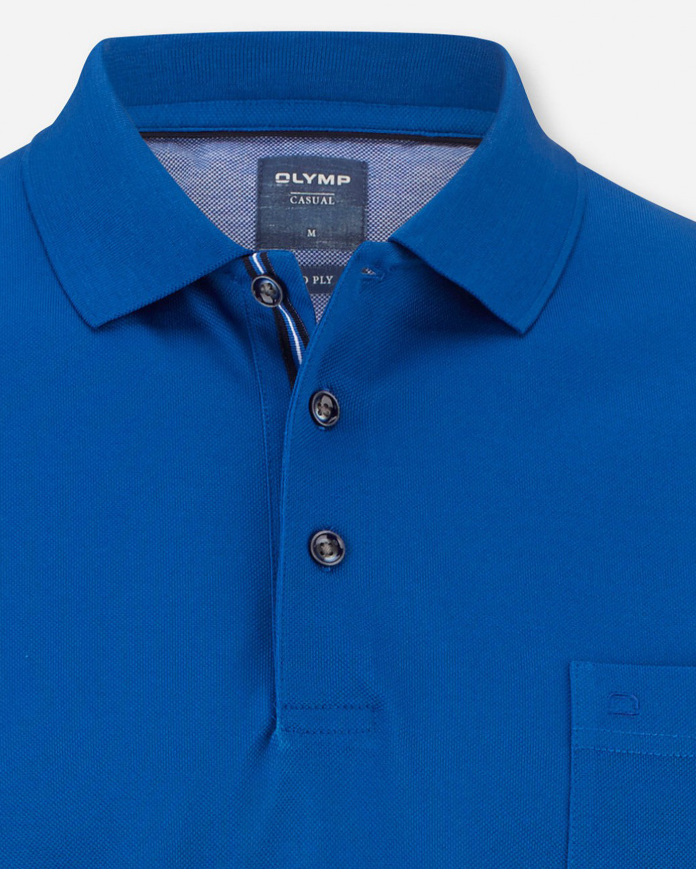 Футболка-поло Olymp Casual ярко-синего цвета, приталенного кроя. Модель выполнена из 100% хлопка, имеет отложной воротник и планку на три пуговицы с внутренним рисунком в полоску. Футболка-поло станет незаменимой вещью вашего гардероба.