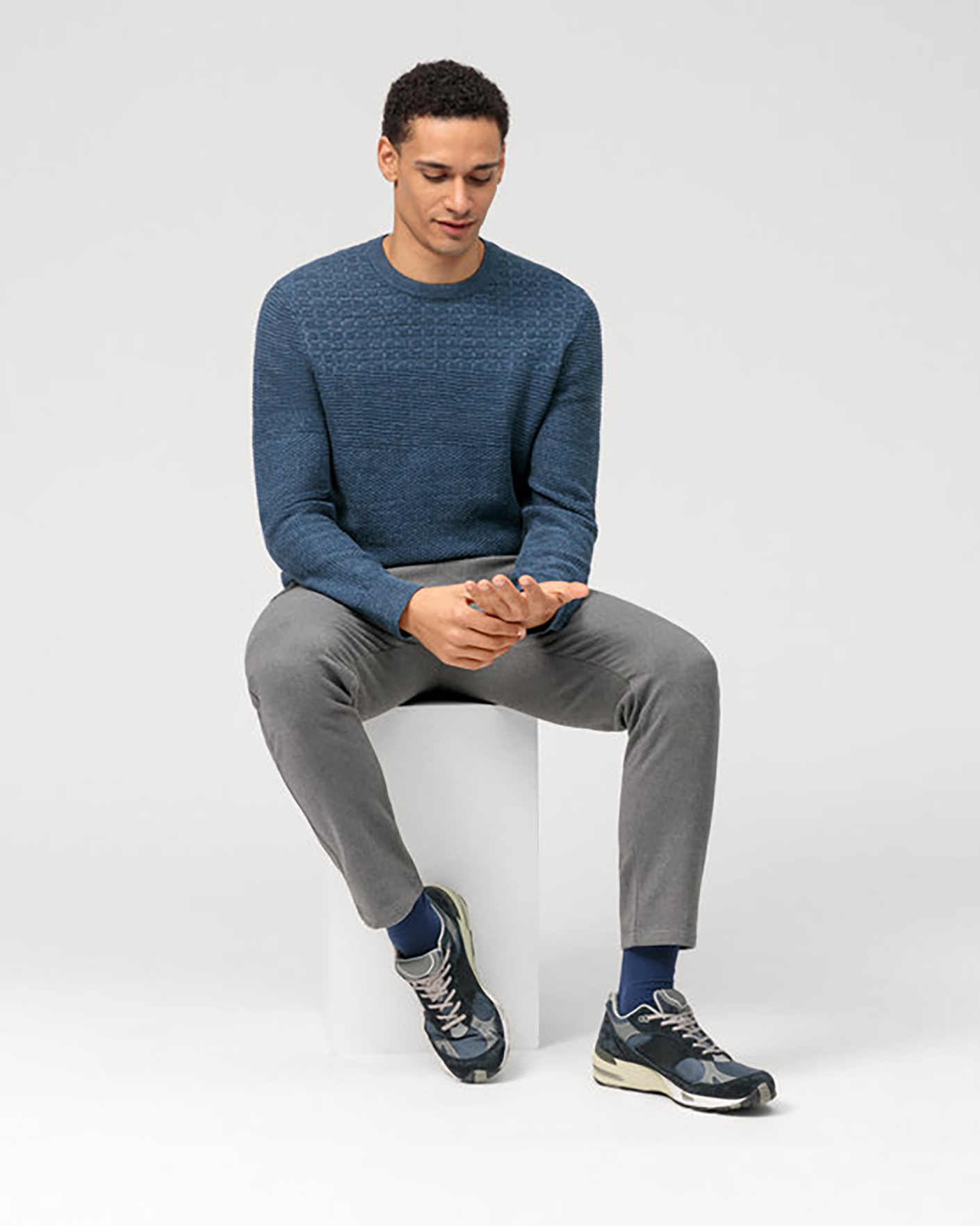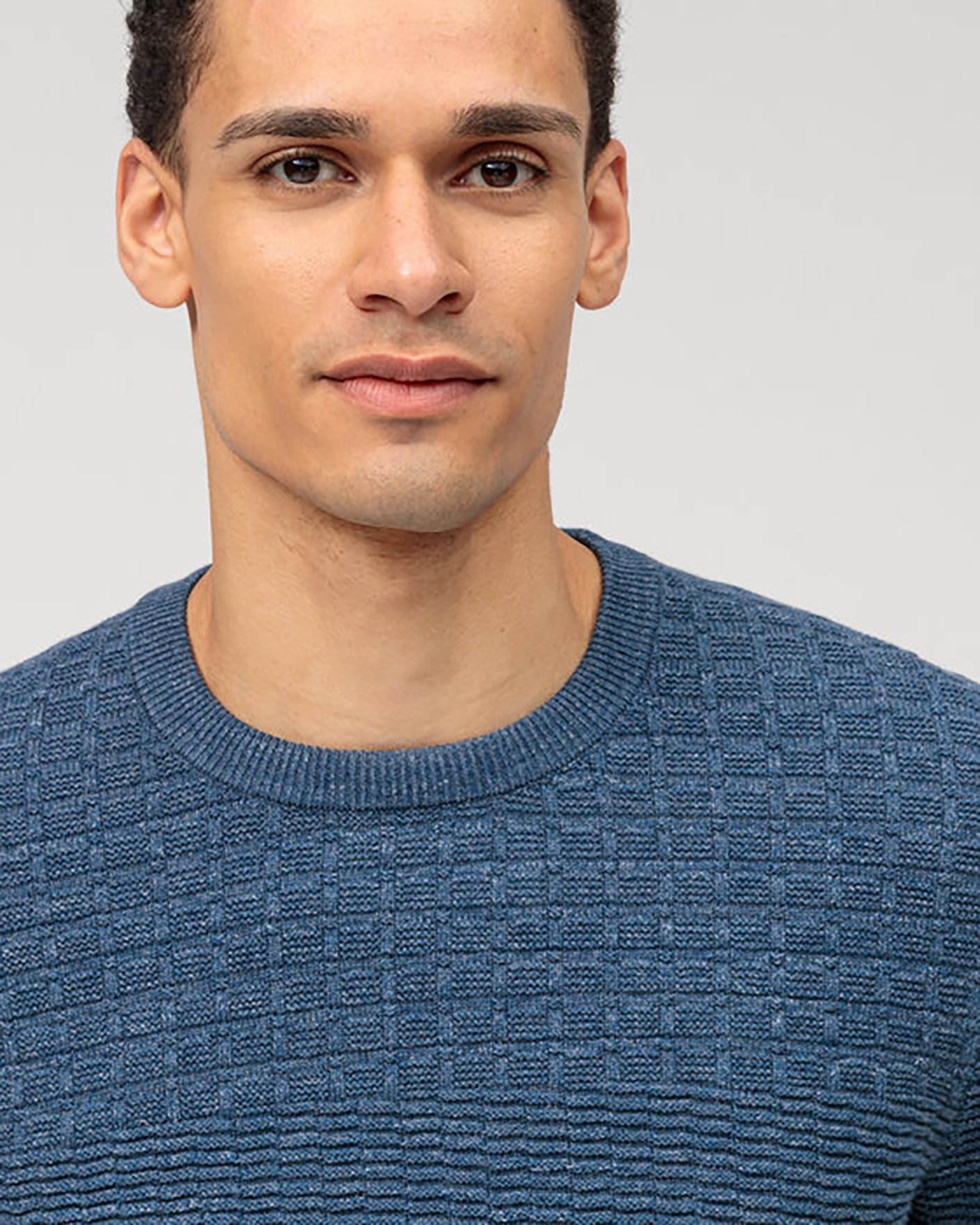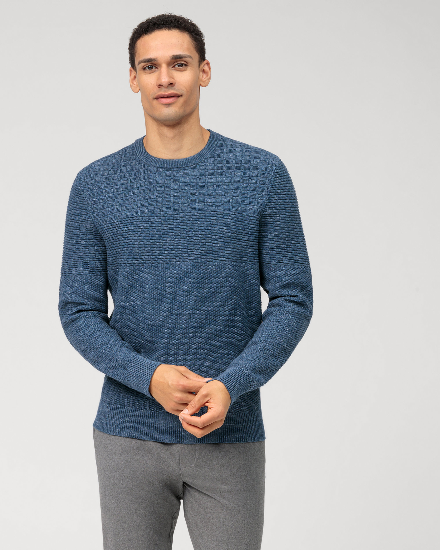 Джемпер Olymp Casual серо-синего цвета в текстурную вязку. Модель из 100% хлопка, круглый вырез, манжеты и низ на тонкой резинке. Джемпер - универсальная вещь на каждый день.