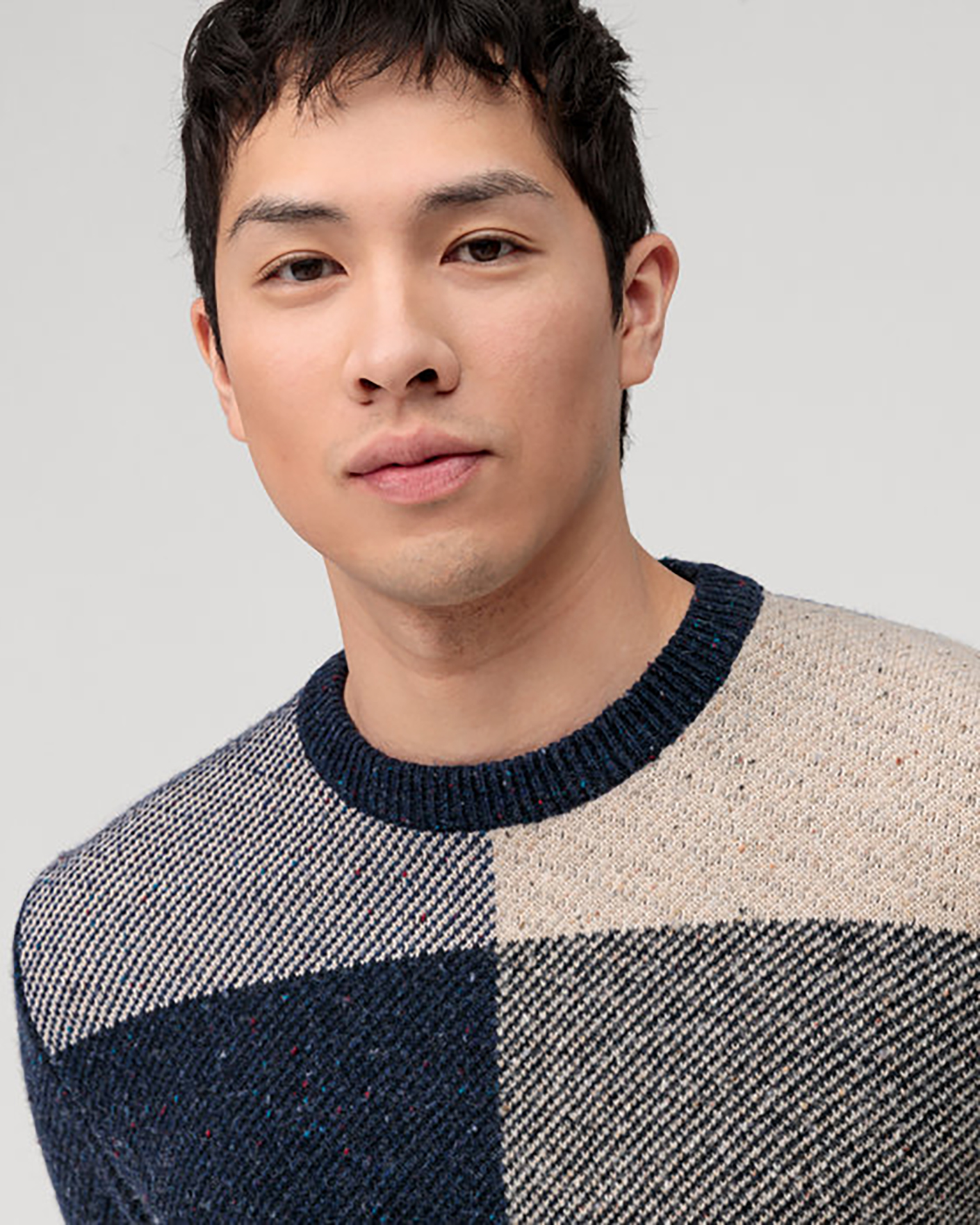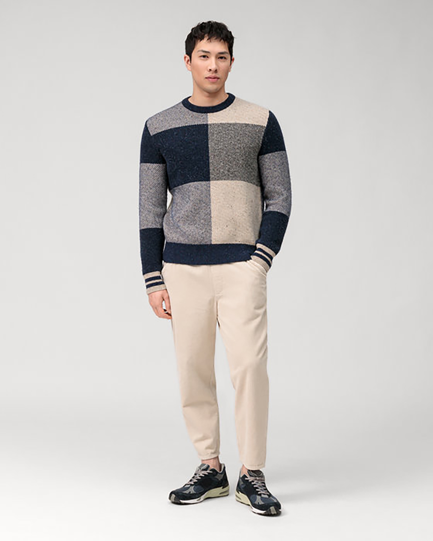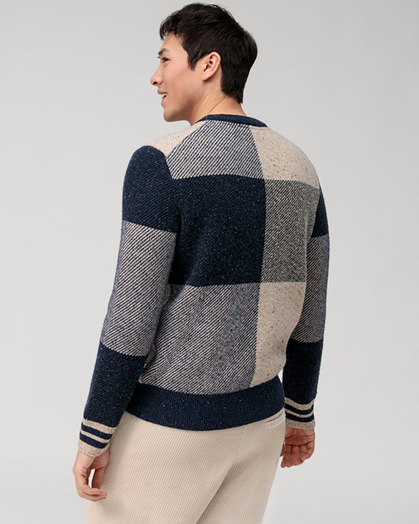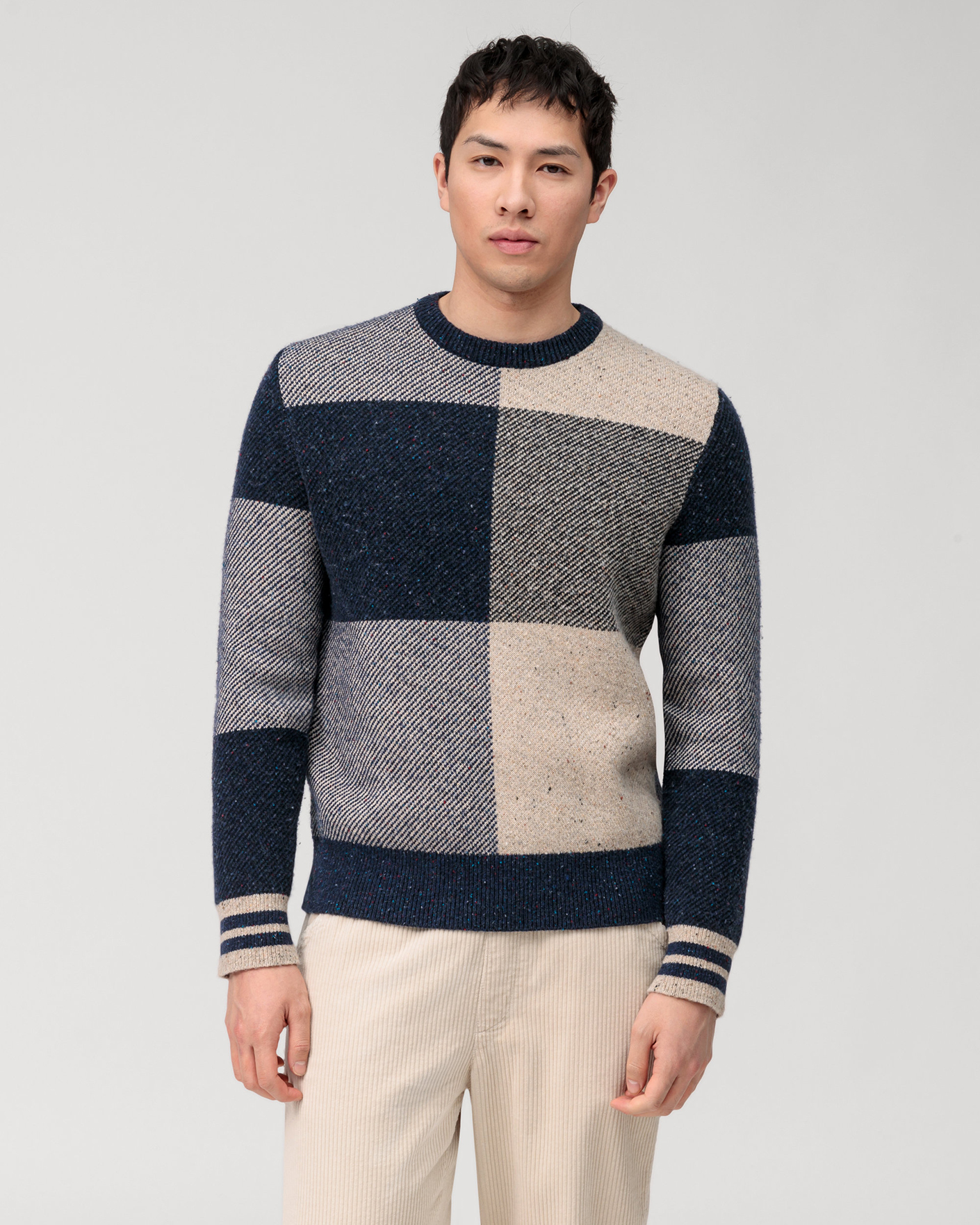 Теплый джемпер Olymp сине-бежевого цвета в диагональную структуру. Модель с круглым вырезом и длинными рукавами. В дополнение к крупному клетчатому дизайну полосатые манжеты придают модный стиль ретро. Джемпер станет фаворитом на каждый день.