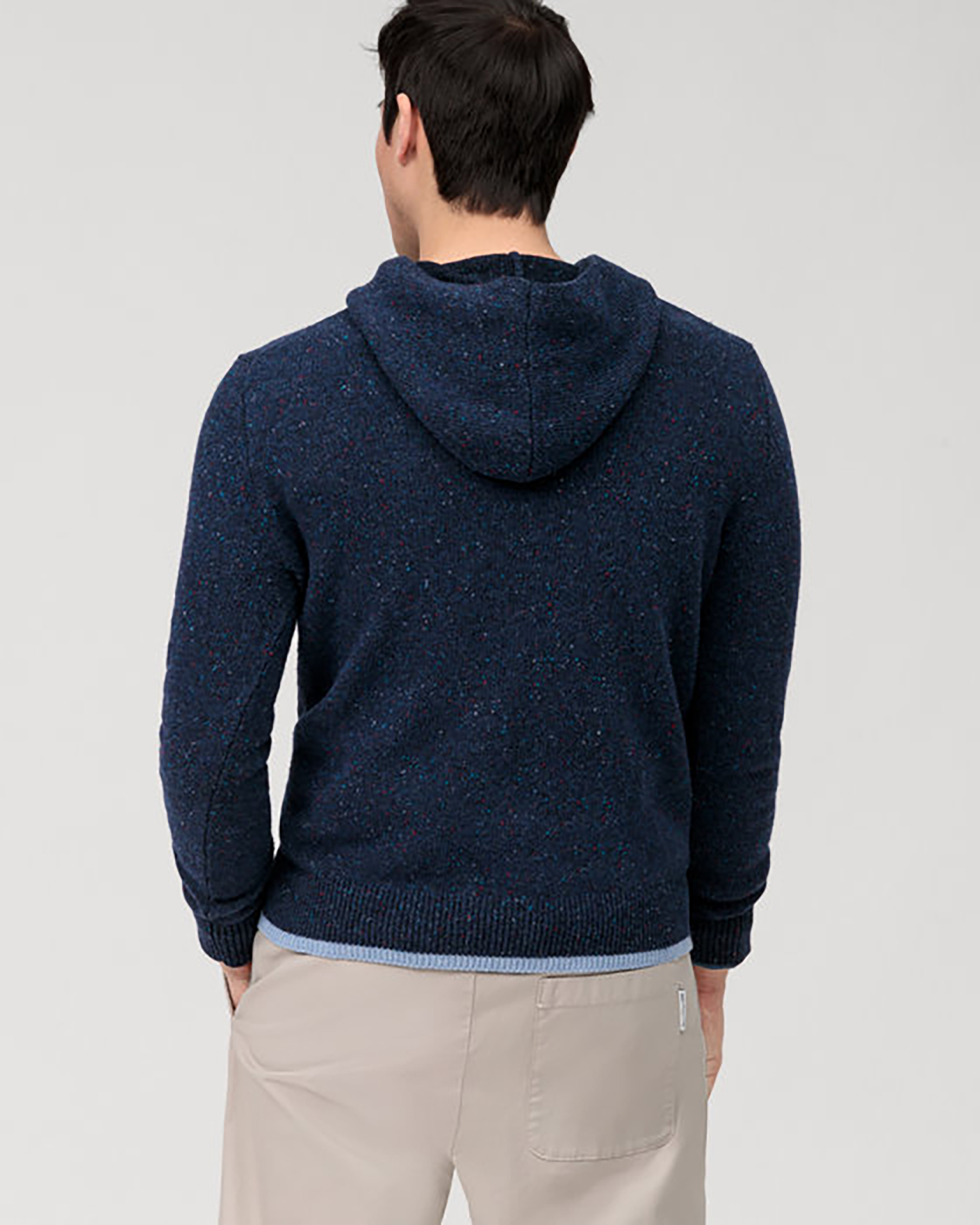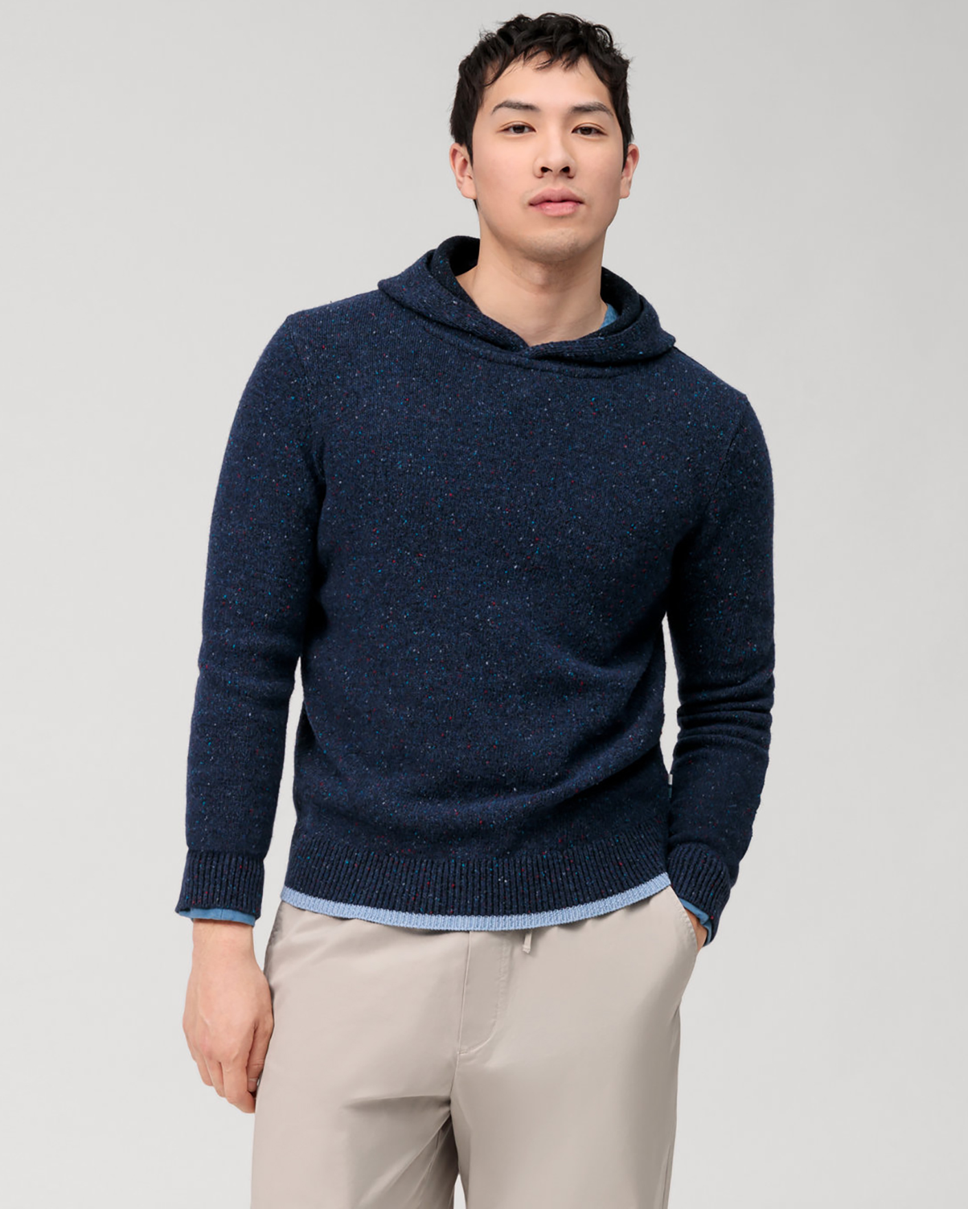 Мягкий джемпер Olymp Casual темно-синего цвета в строчный каплевидный рисунок. Модель с круглым вырезом и фиксированным капюшоном. Манжеты и низ на тонкой ребристой резинке. Джемпер отлично впишется в повседневный гардероб.