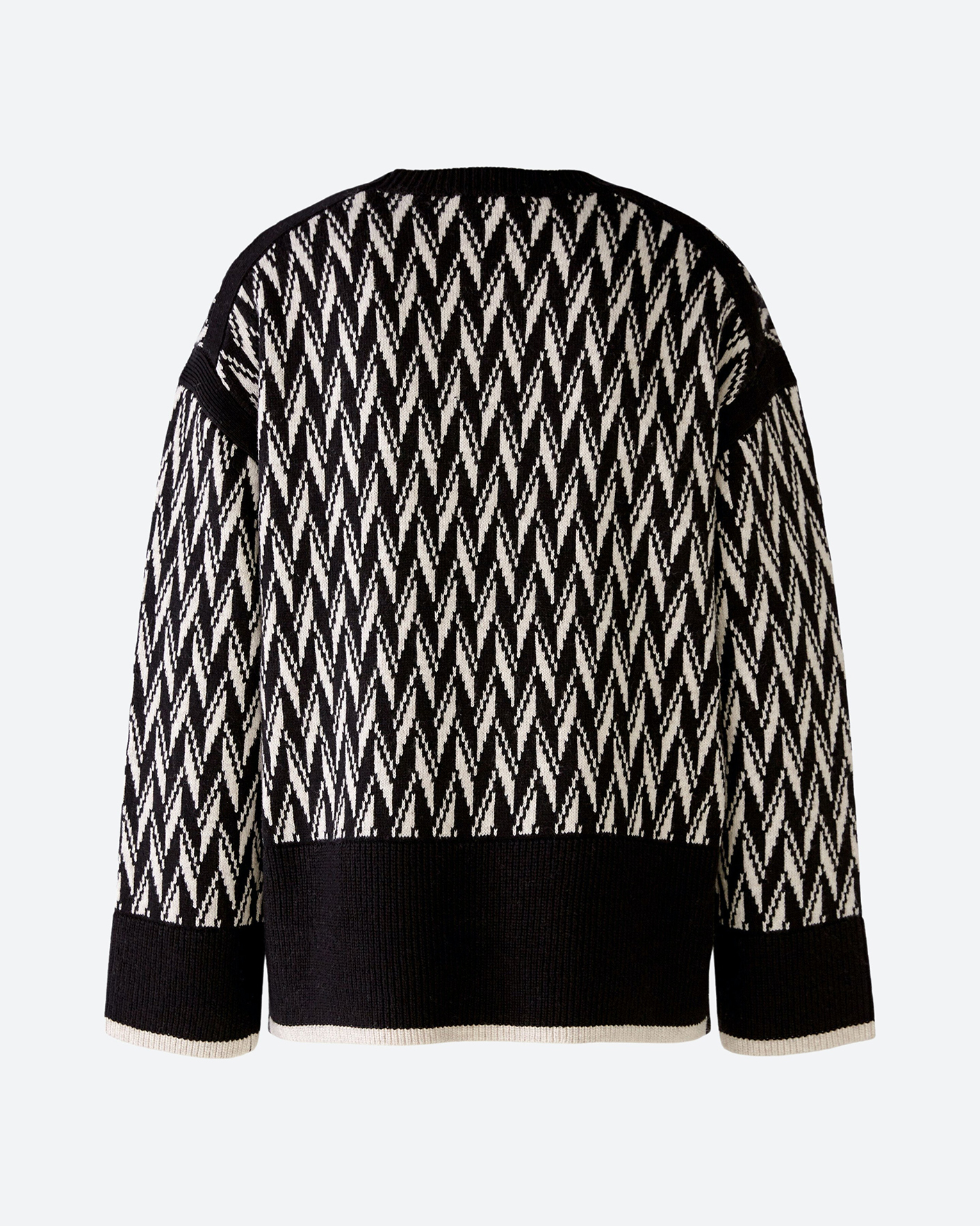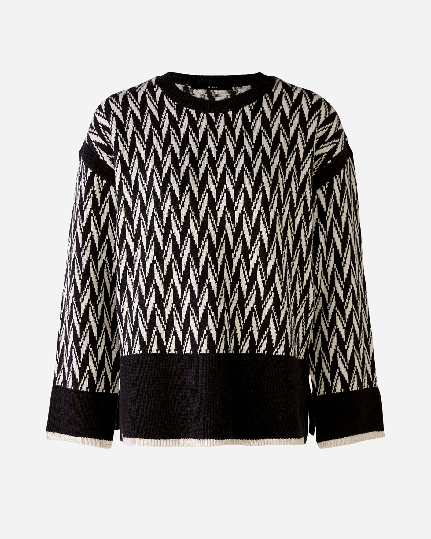 Свободный джемпер OUI бело-черного цвета в геометрический рисунок кос. Теплая модель с широким круглым вырезом на вывязанной резинке, спущенная линия плеча, манжеты и низ с однотонной отделкой. Джемпер отлично впишется в ваш гардероб на каждый день.