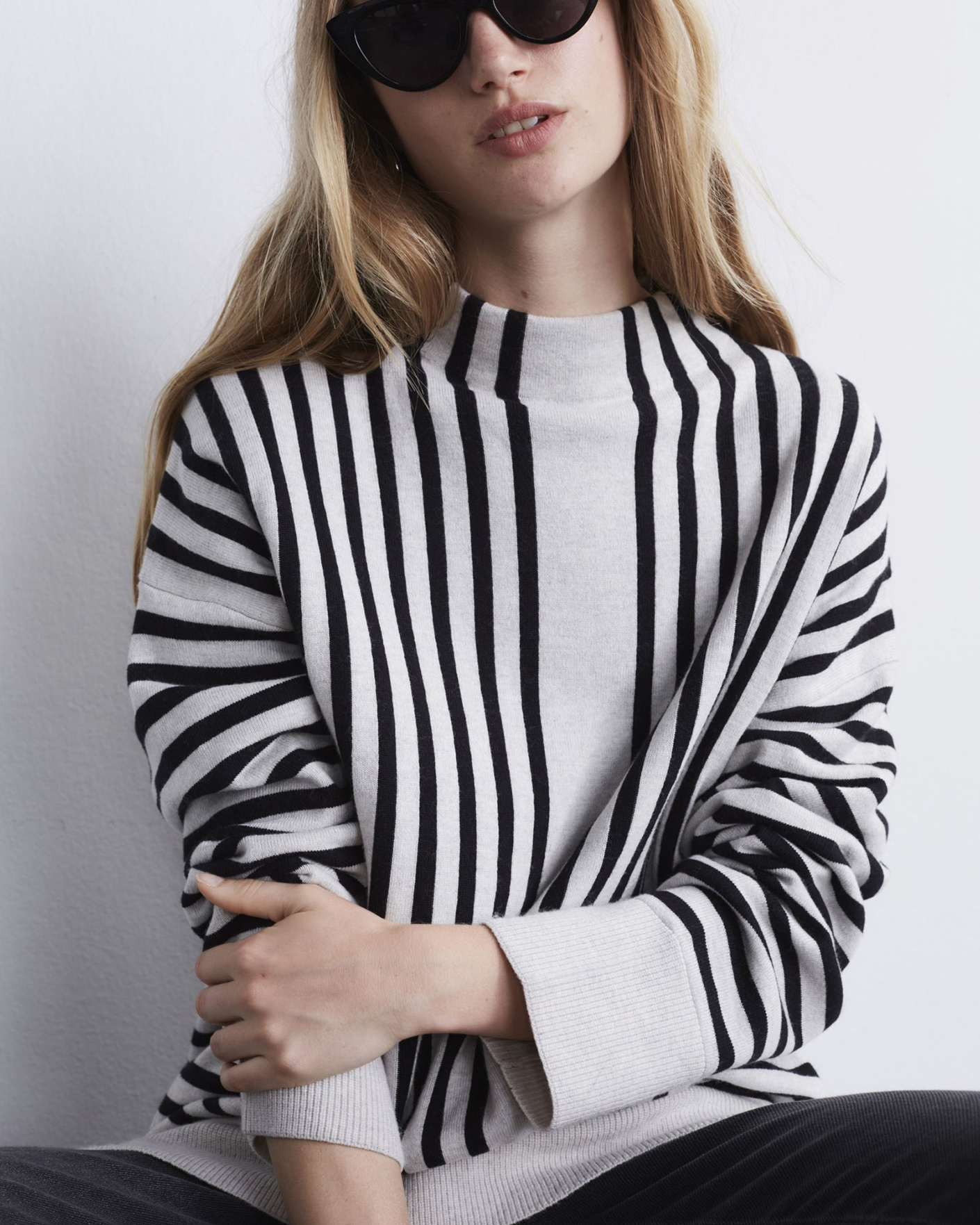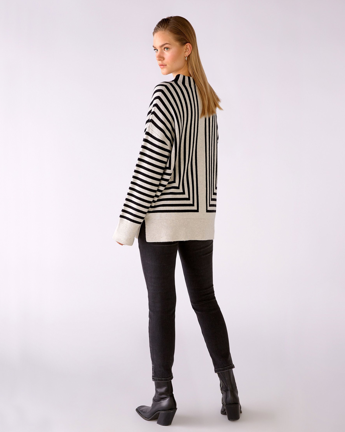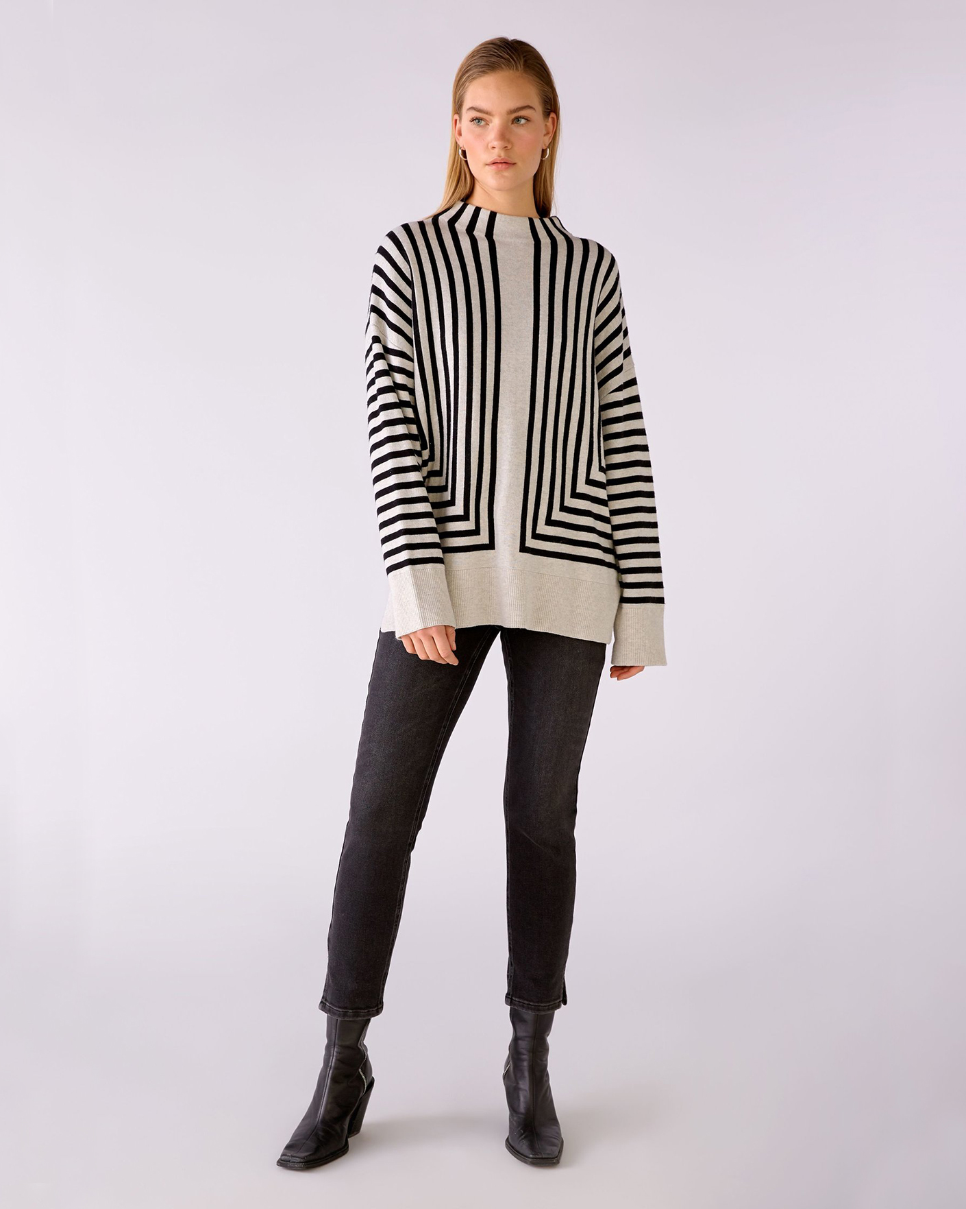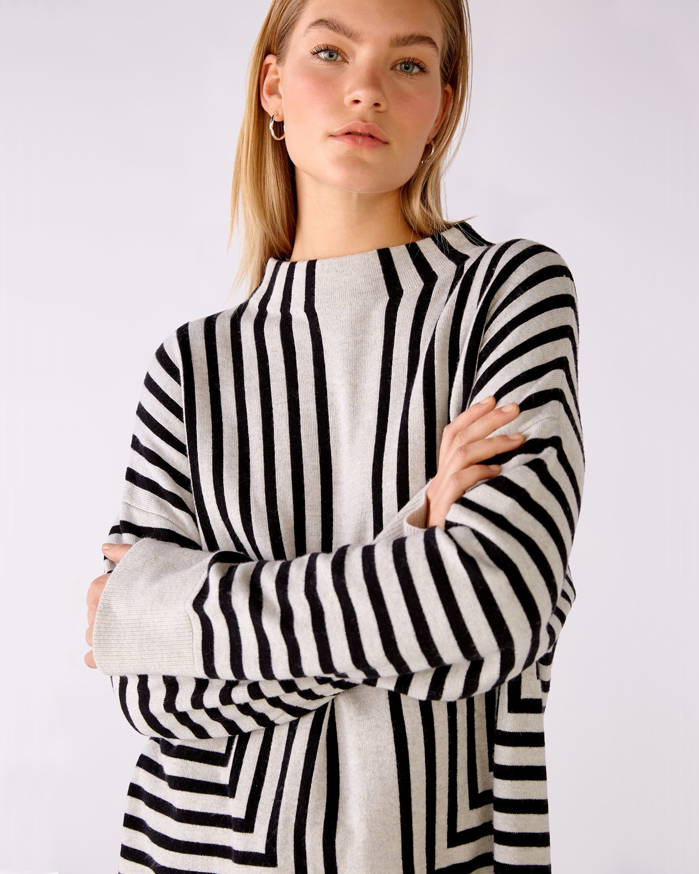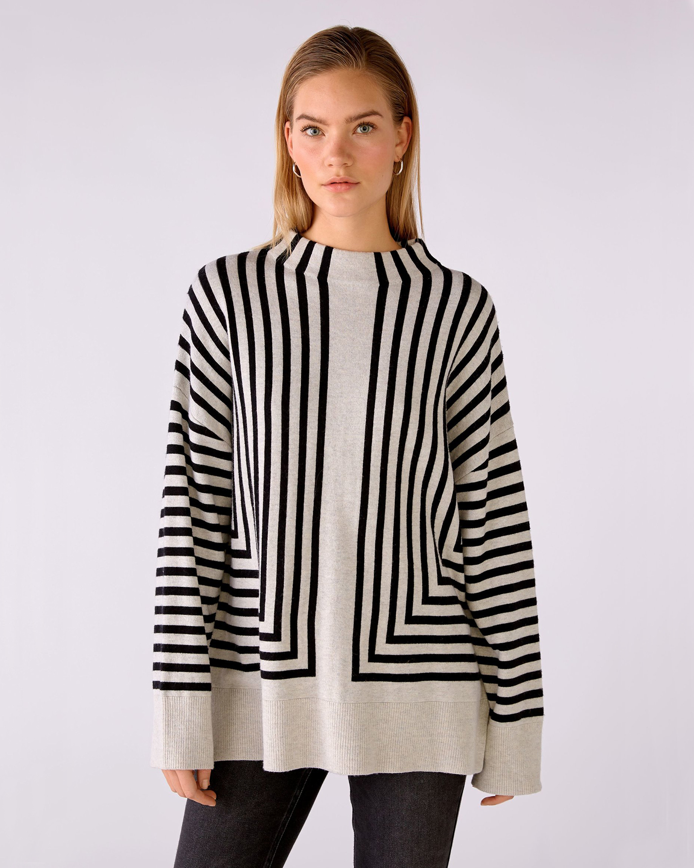 Свободный джемпер OUI серого цвета в вертикальную полосу. Модель из 100% хлопка с удлиненным воротником, манжетами и низом на тонкой резинке. Джемпер можно сочетать с любым гардеробом на каждый день.