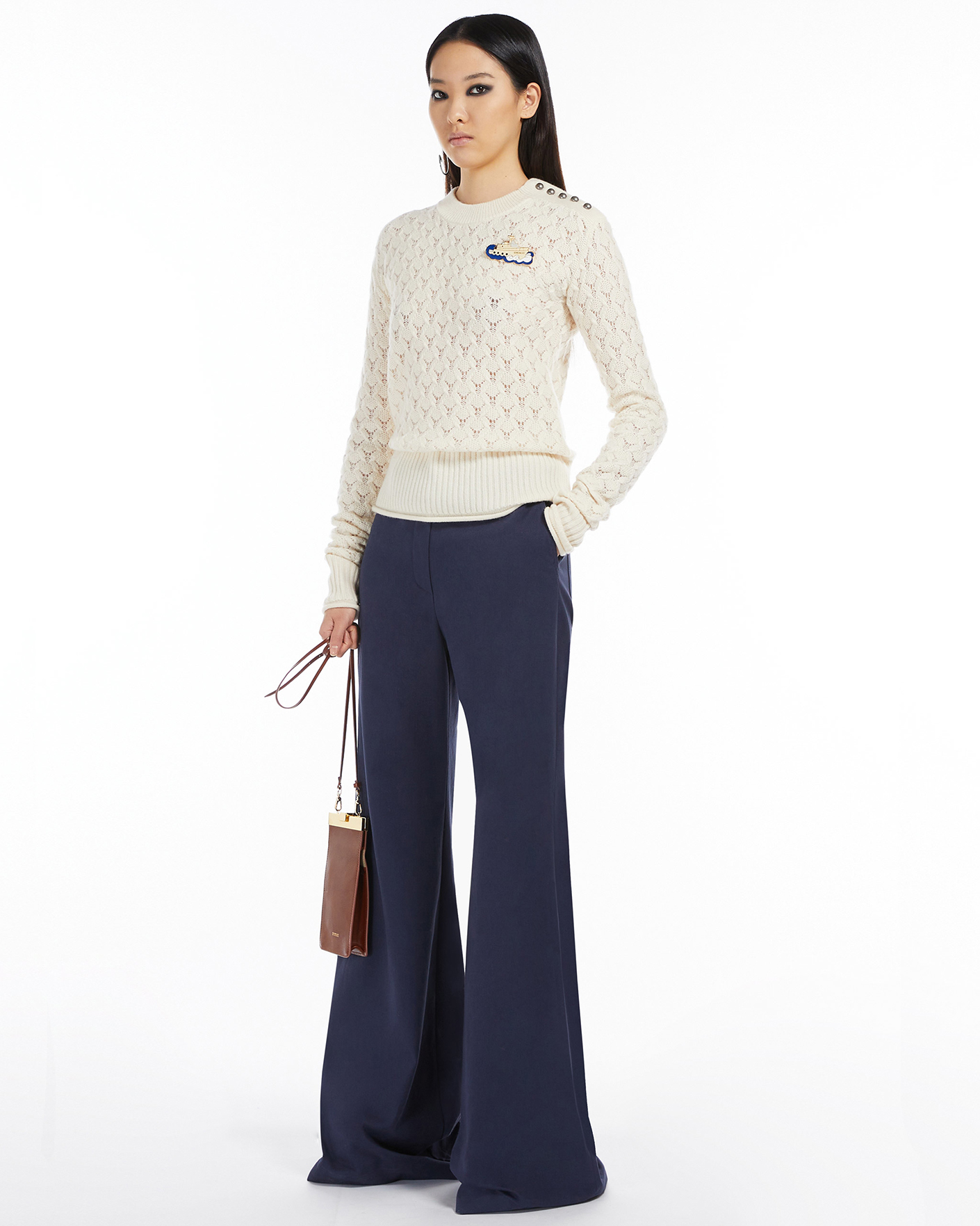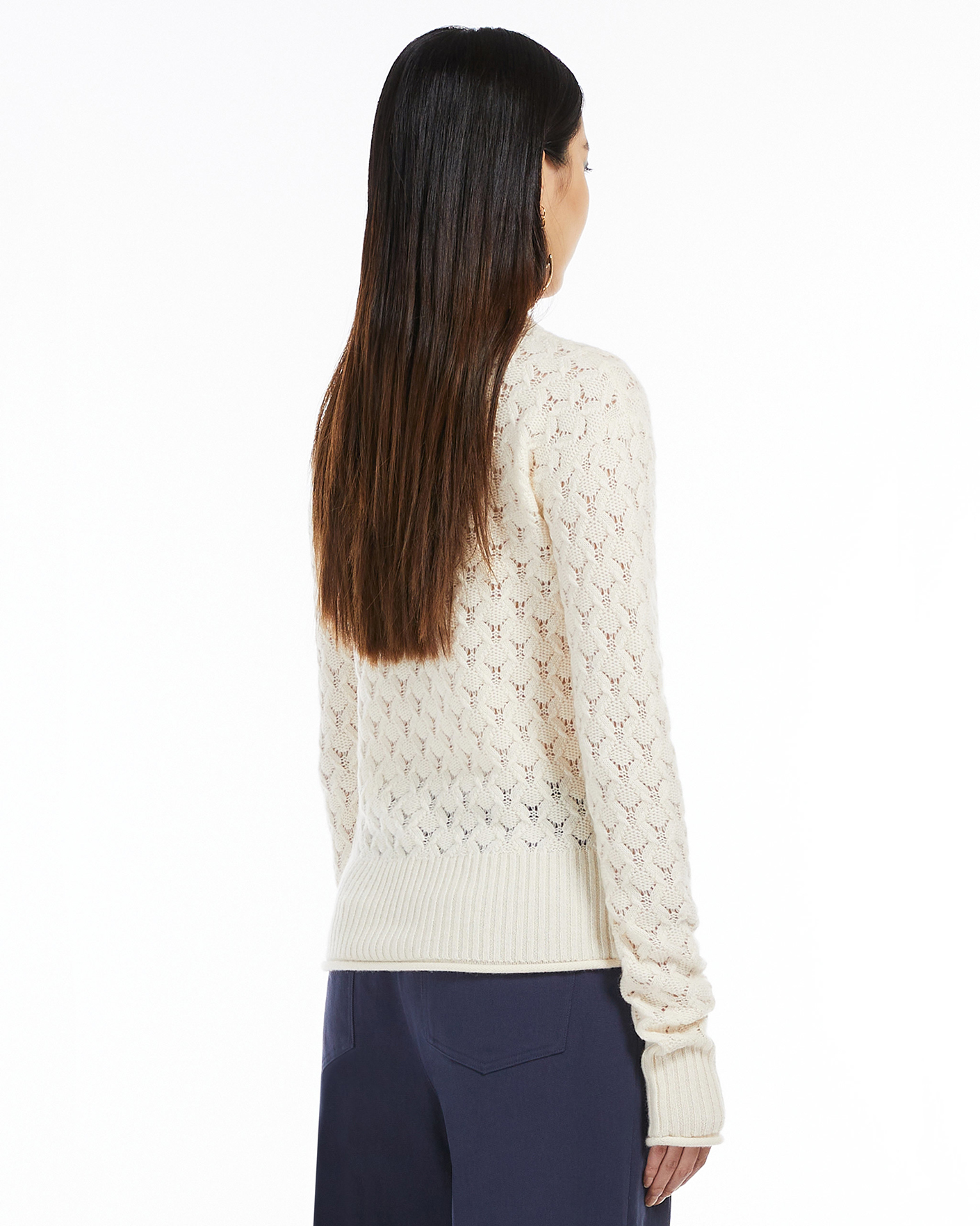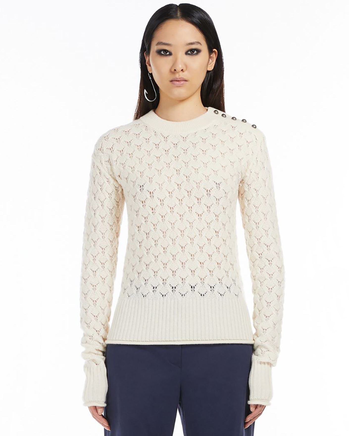 Полуприталенный джемпер Sportmax белого цвета в ажурный текстурный рисунок. Модель выполнена из высококачечтвенного сочетания шерсти и кашемира. Круглый вырез, широкие манжеты и низ на тонкой ребристой резинке. Обманные крупные пуговицы расположены по линии плеча. Яркий джемпер отлично впишется в ваш гардероб на каждый день.