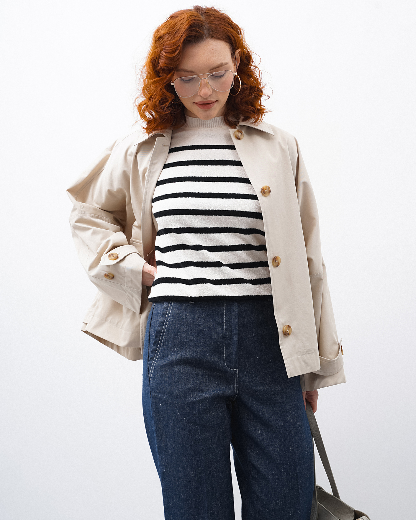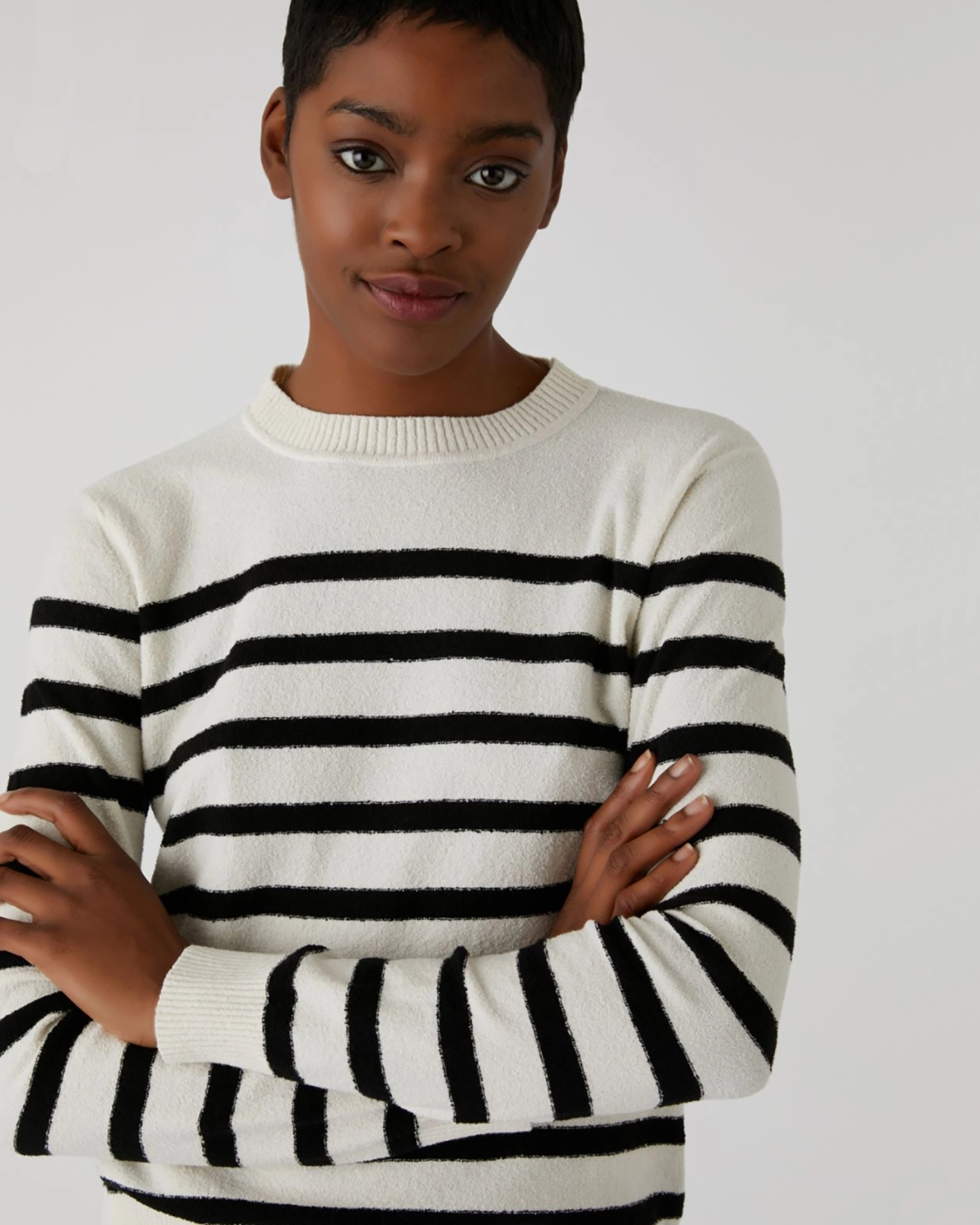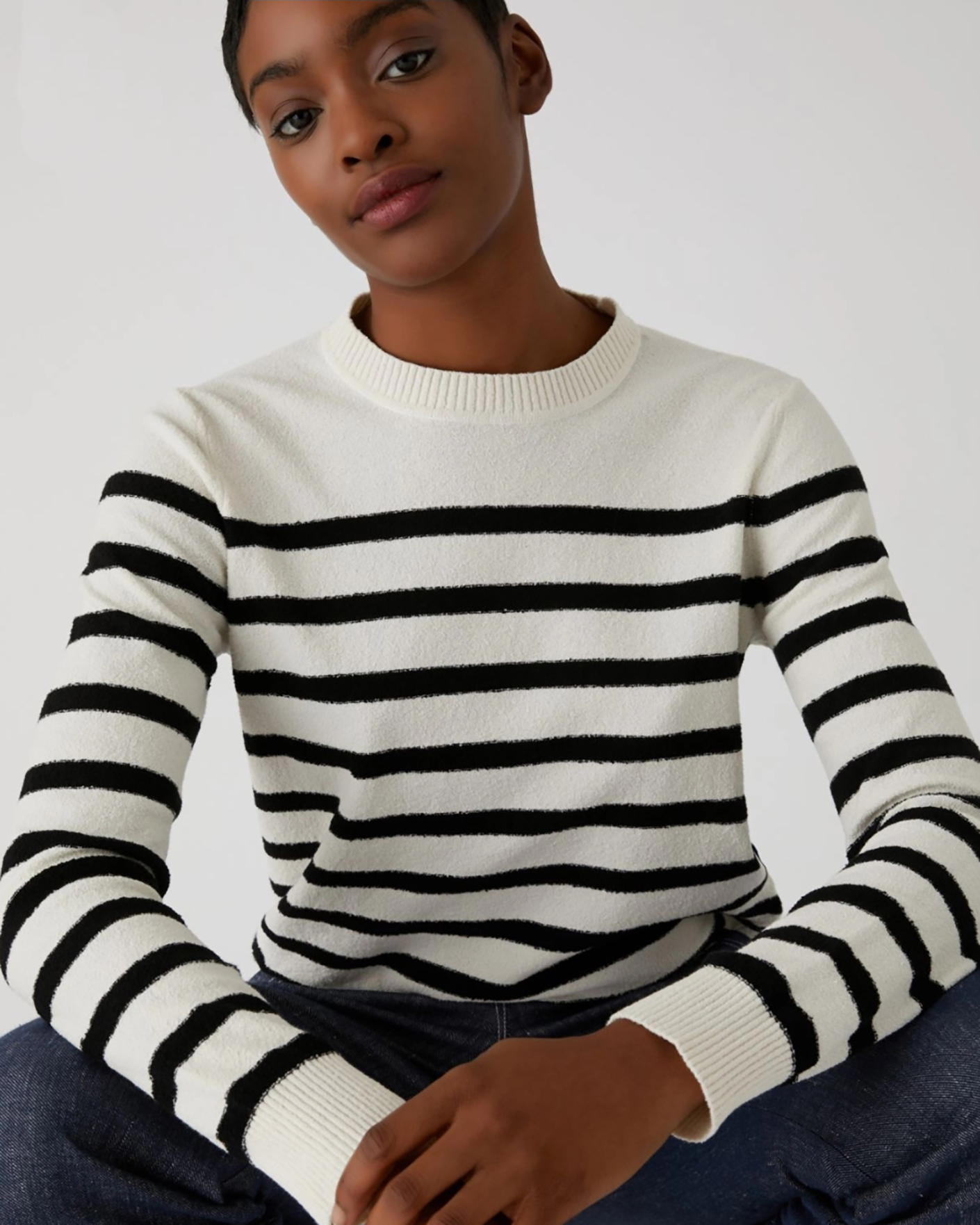 Джемпер Marella черно-белого цвета в горизонтальную полосу. Хлопковая модель с круглым вырезом, манжетами и низом на тонкой ребристой резинке. Джемпер - фаворит на каждый день.