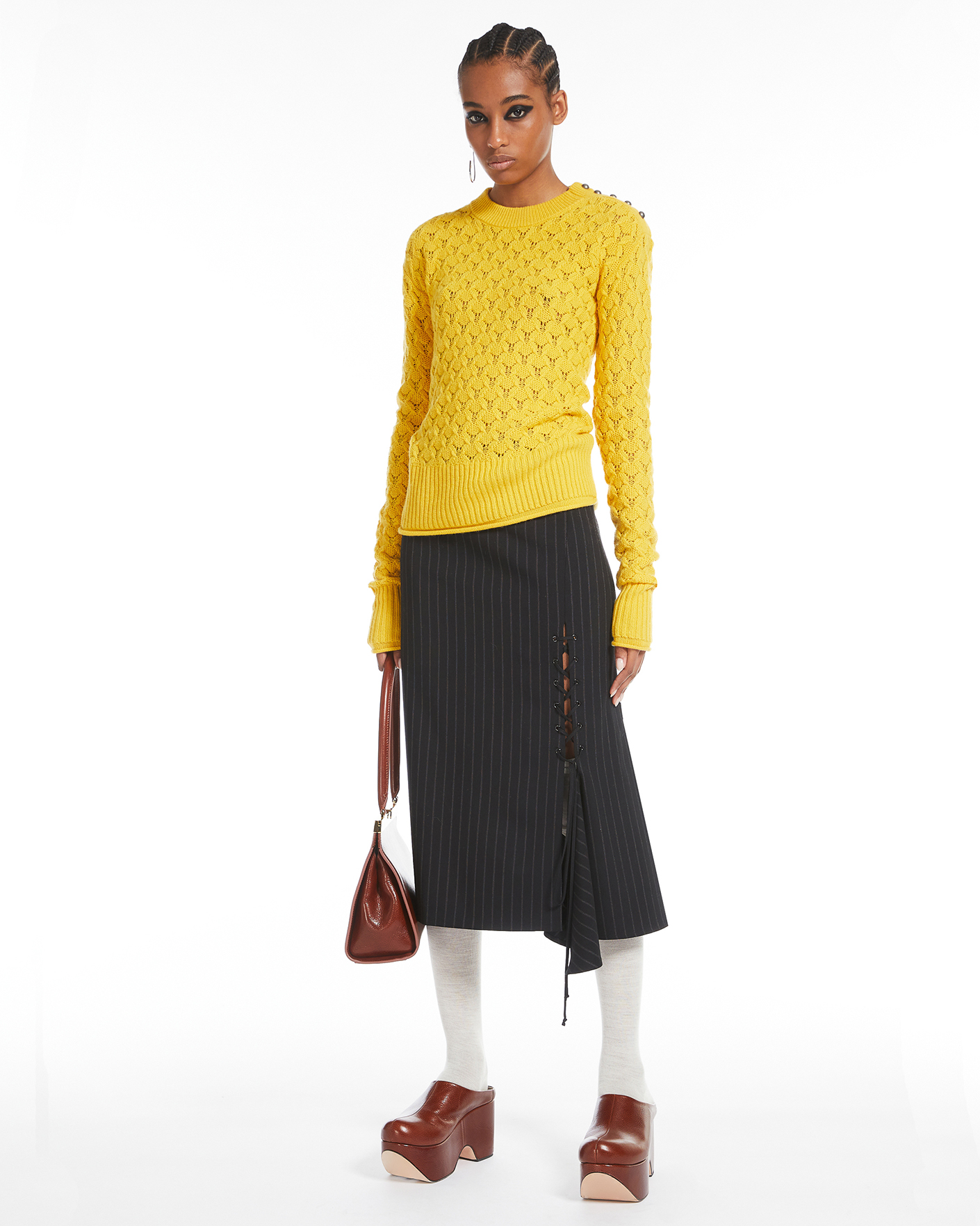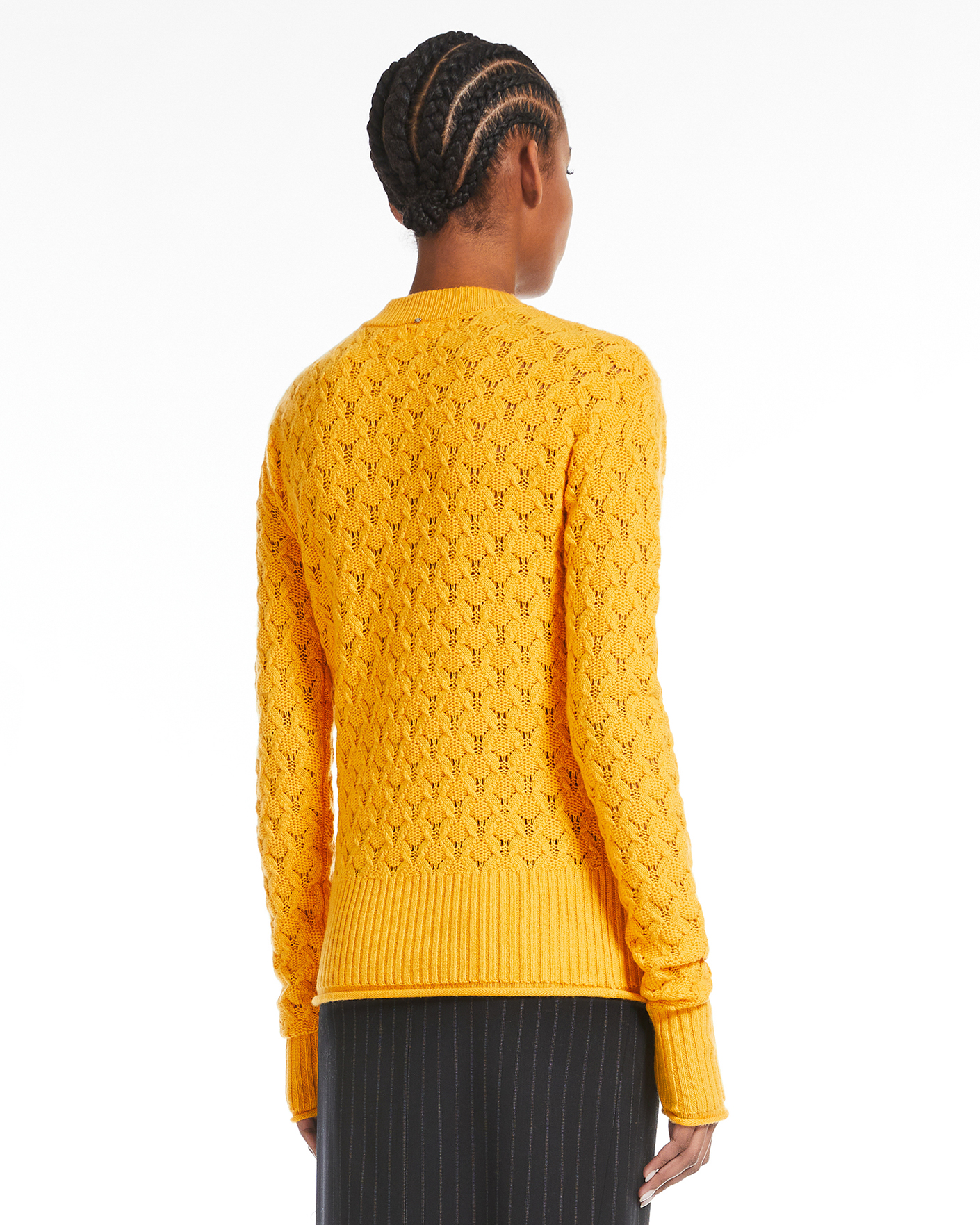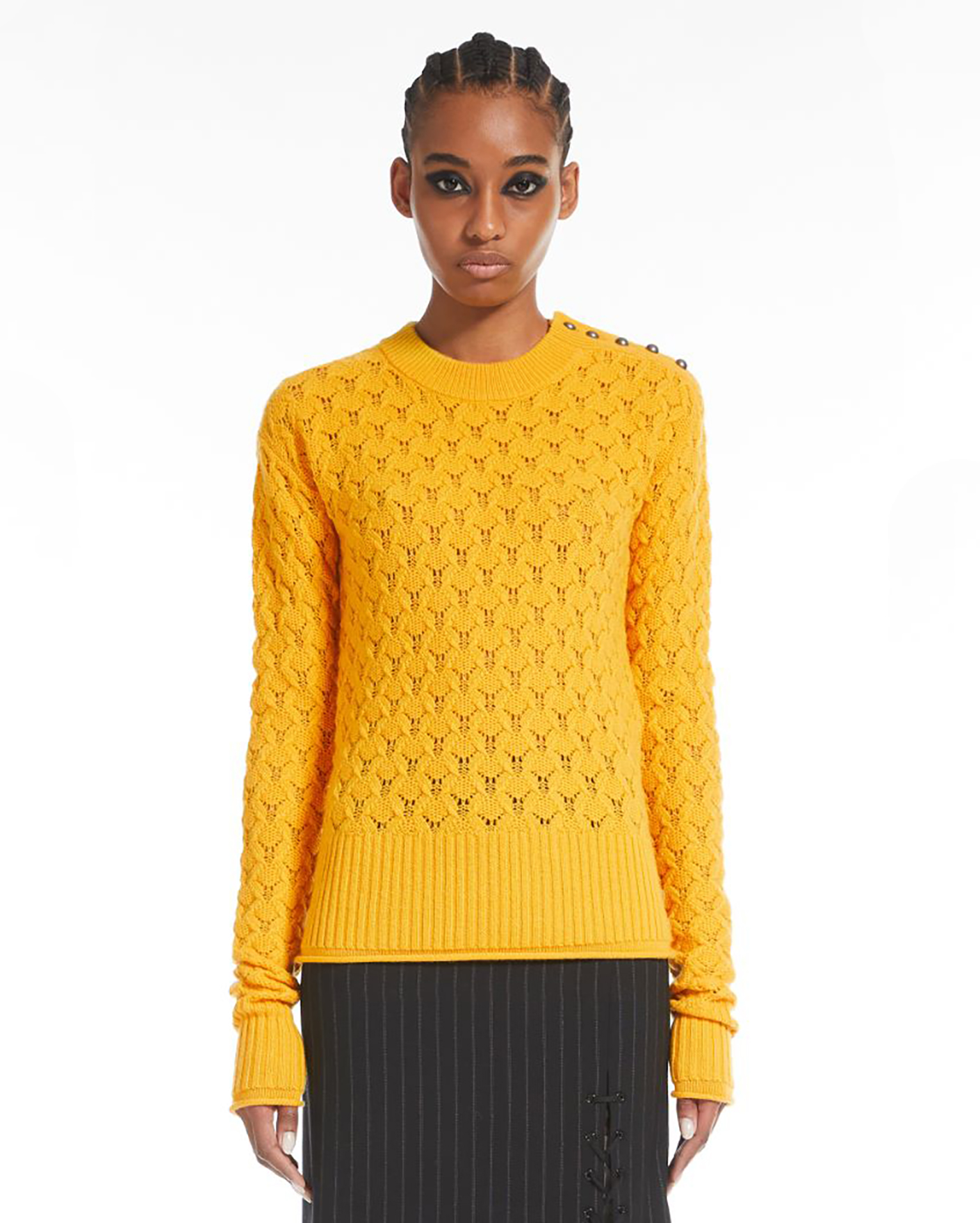 Полуприталенный джемпер Sportmax желтого цвета в ажурный текстурный рисунок. Модель выполнена из высококачечтвенного сочетания шерсти и кашемира. Круглый вырез, широкие манжеты и низ на тонкой ребристой резинке. Обманные крупные пуговицы расположены по линии плеча. Яркий джемпер отлично впишется в ваш гардероб на каждый день.