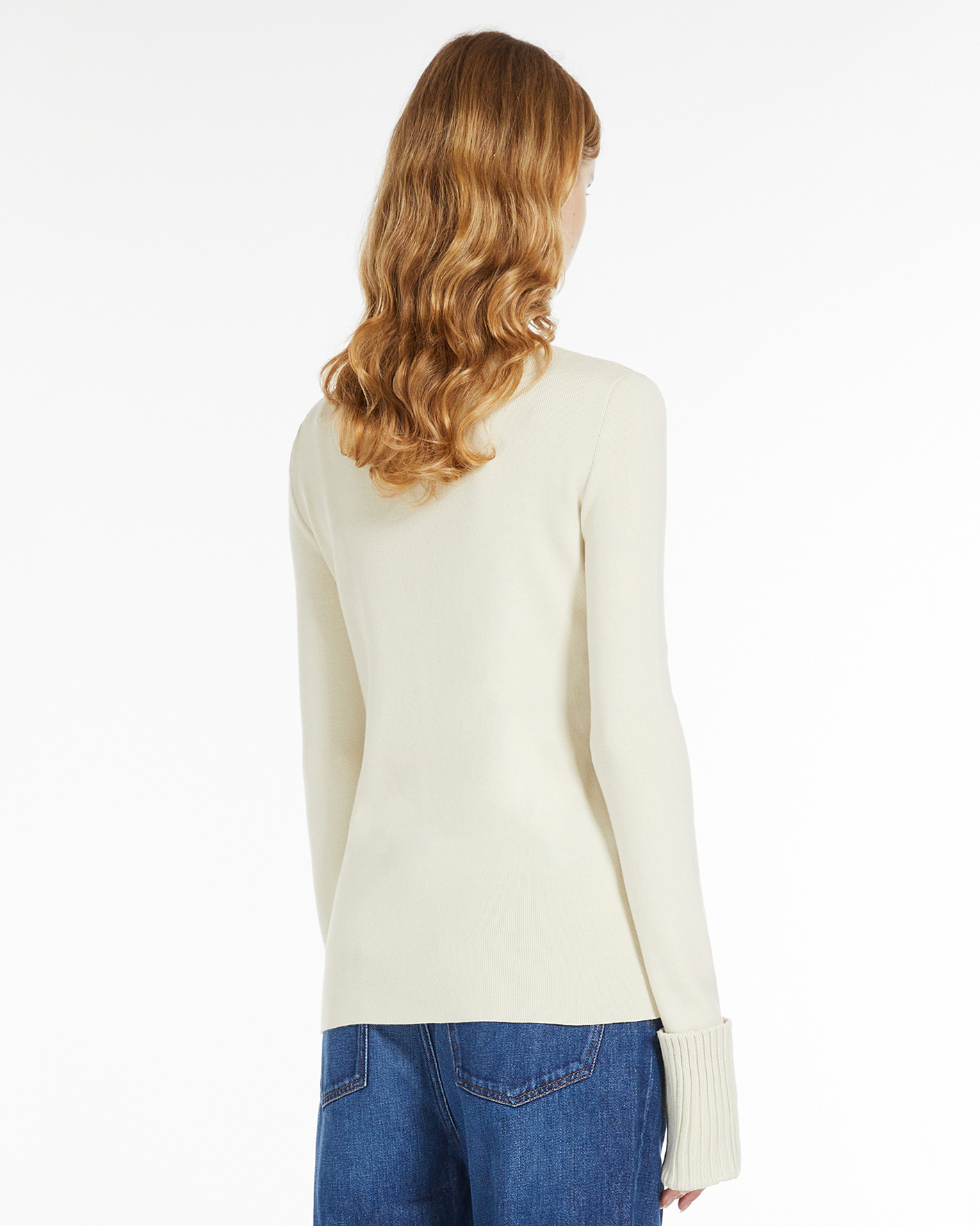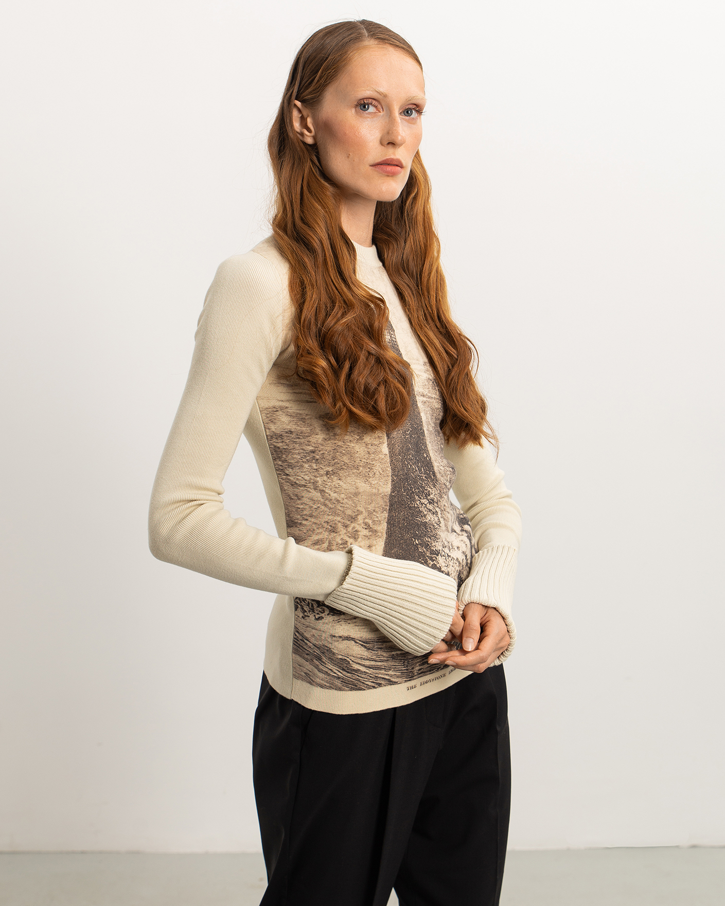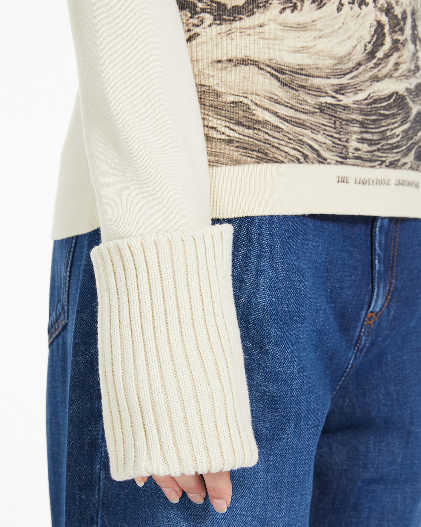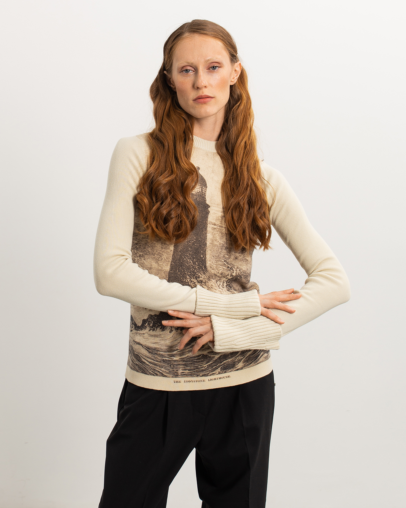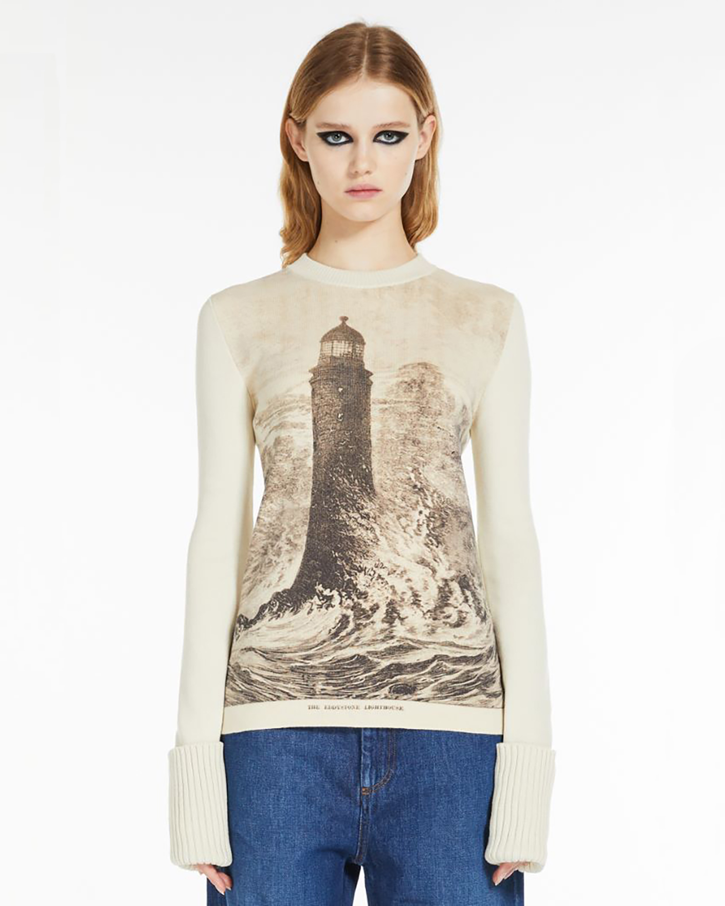 Приталенный джемпер Sportmax белого цвета с крупным принтом маяка спереди. Модель из высококачественного сочетания хлопка и шерсти, с круглым вырезом и широкими манжетами с отворотами на тонкой ребристой резинке. Джемпер отлично впишется в повседневный гардероб.
