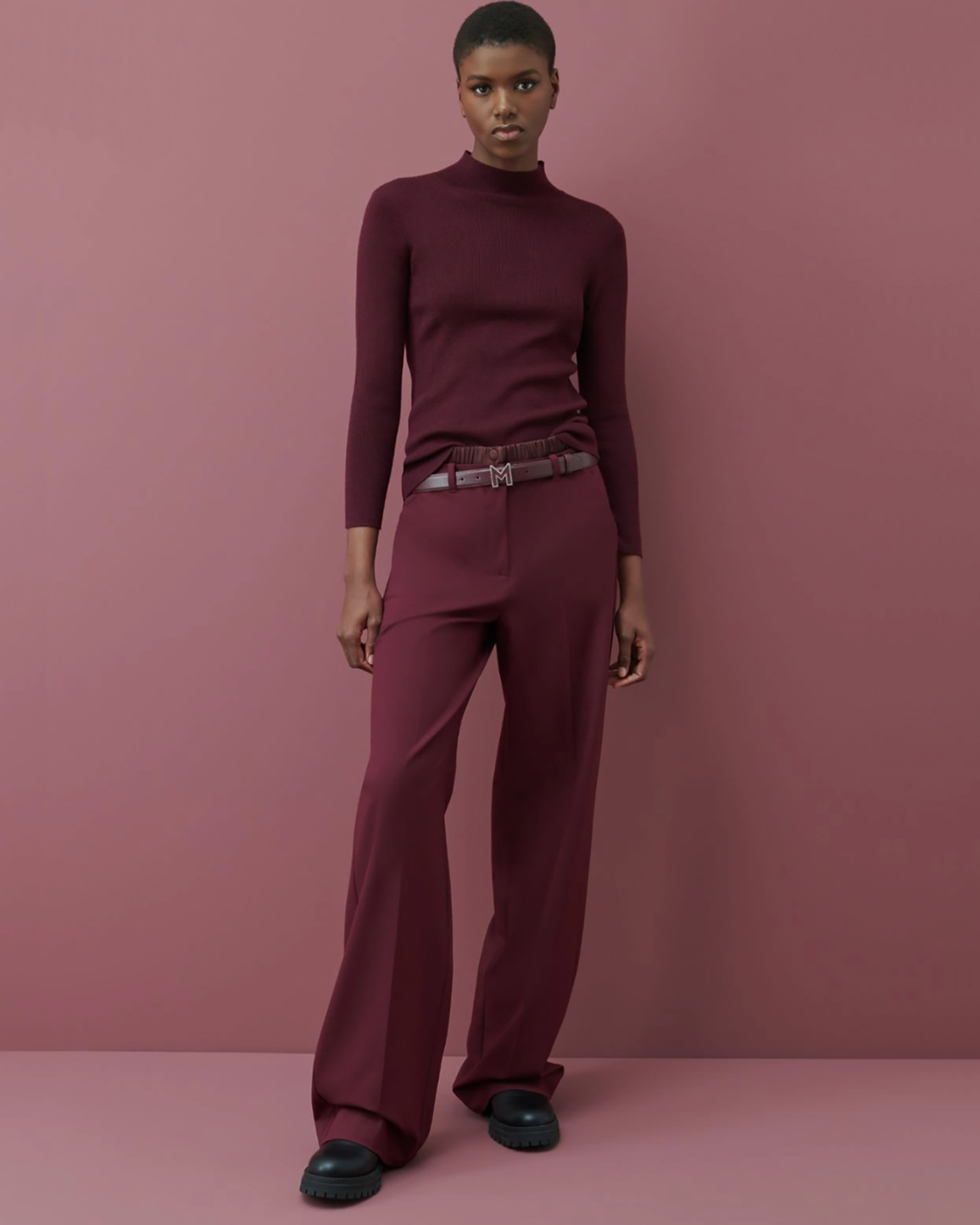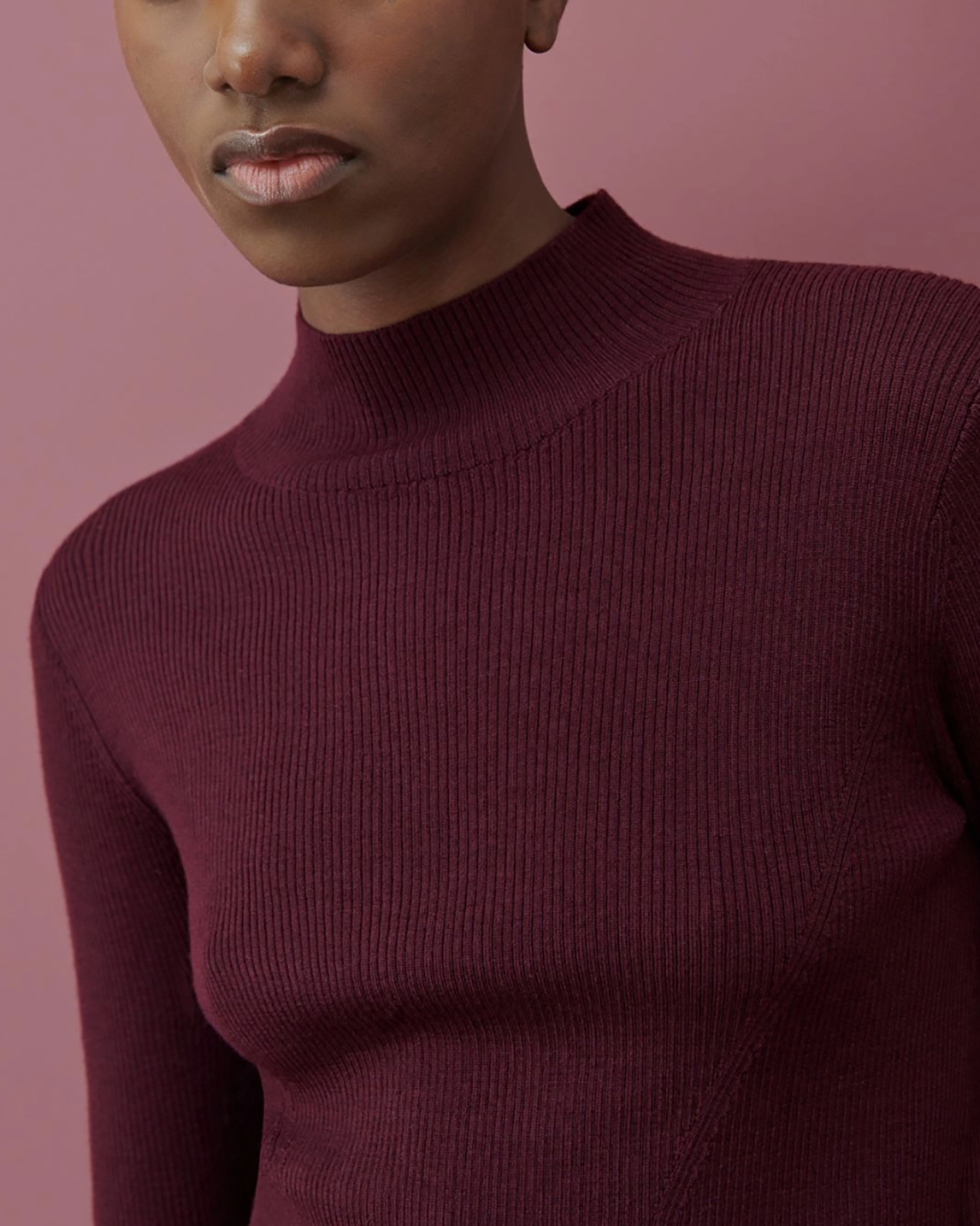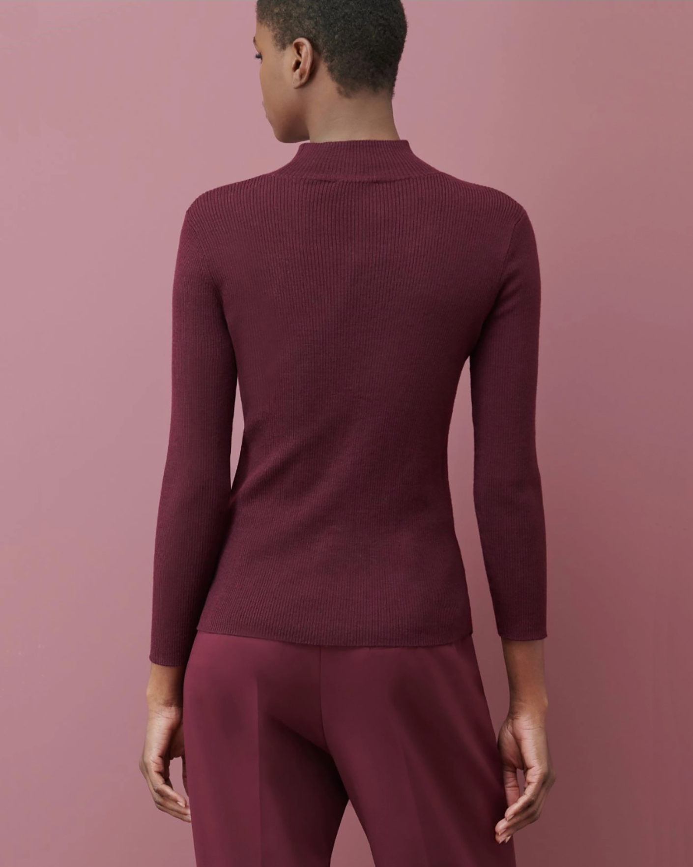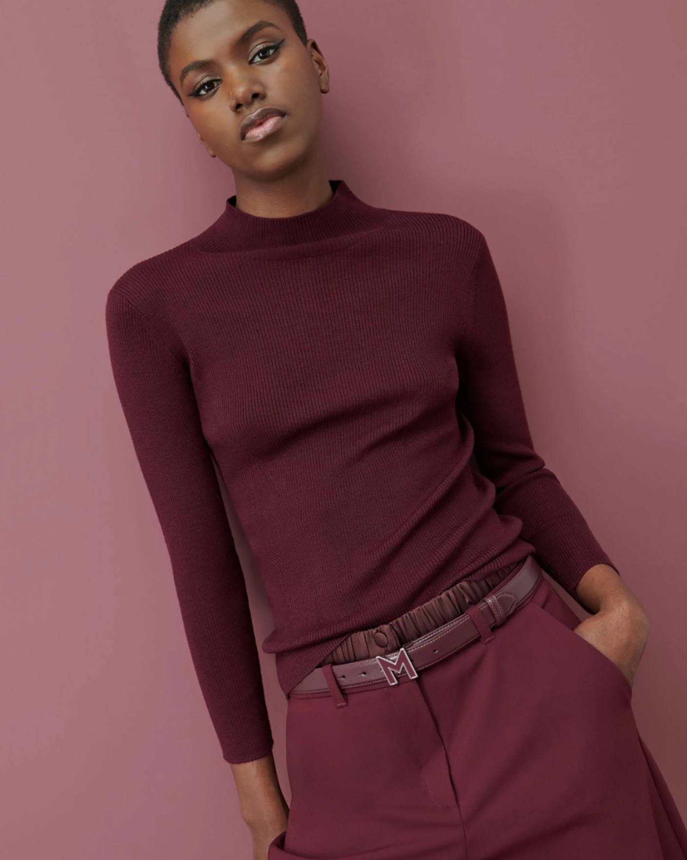 Приталенный джемпер Marella бордового цвета. Модель в узкую вязку резинкой, воротник-стойка и длинные рукава. Джемпер станет незаменимой вещью на каждый день.