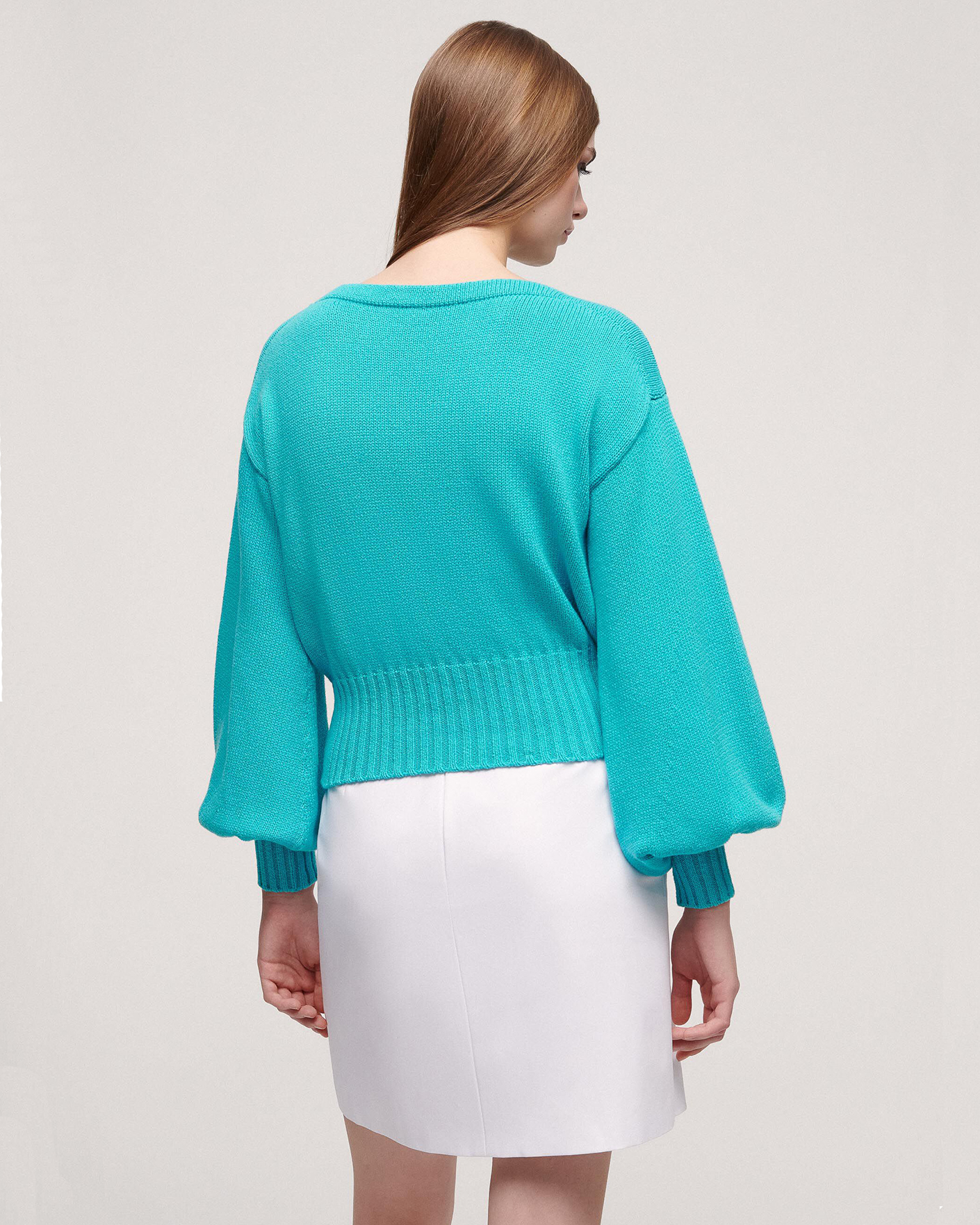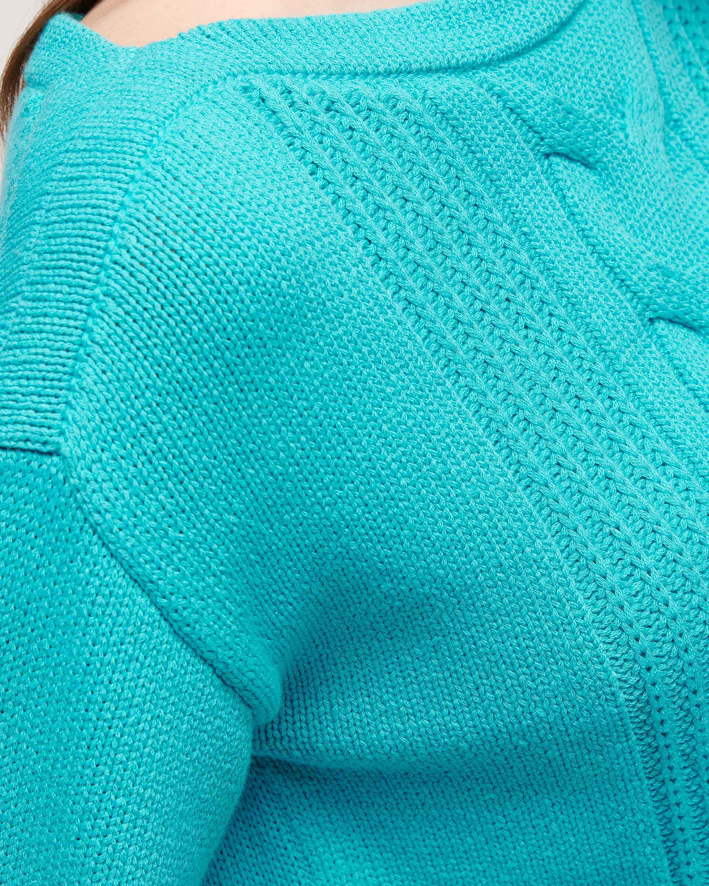 Приталенный джемпер Luisa Spagnoli бирюзового цвета в вертикальную вязку с крупной косичкой. Модель из 100% хлопка с круглым вырезом, спущенная линия плеча, широкие манжеты и низ на вывязанной резинке. Идеальный джемпер на каждый день.
