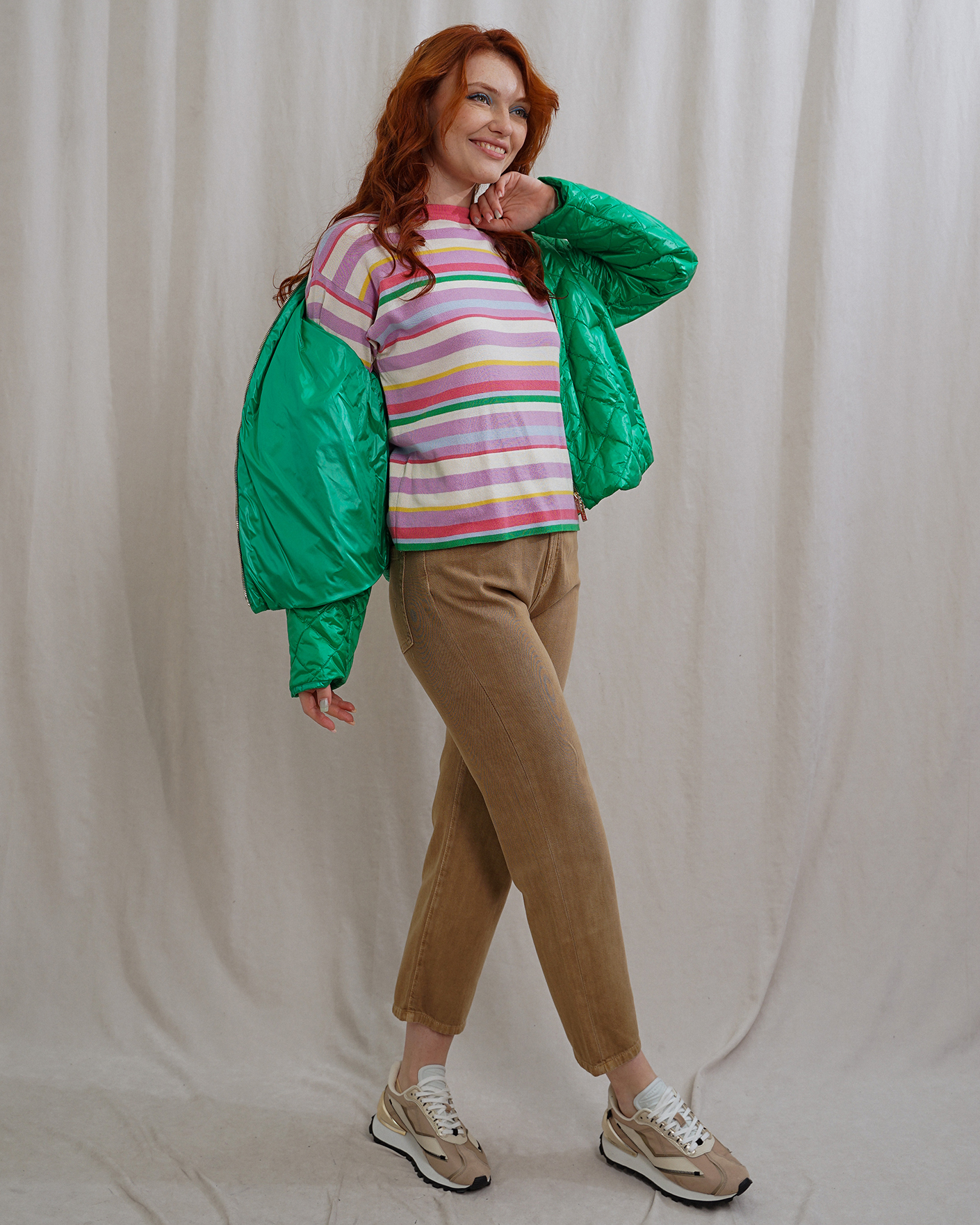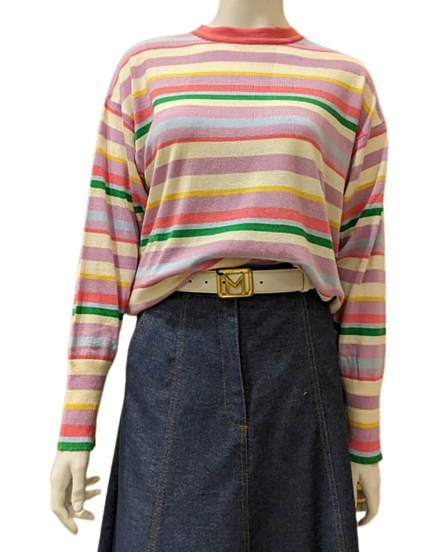 Свободный джемпер Marella розового цвета в разноцветную мульти-полосу. Модель с круглым вырезом на ребристой резинке, спущенная линия плеча с широкими рукавами с сужением у манжет. Стильный джемпер отлично впишется в ваш гардероб.