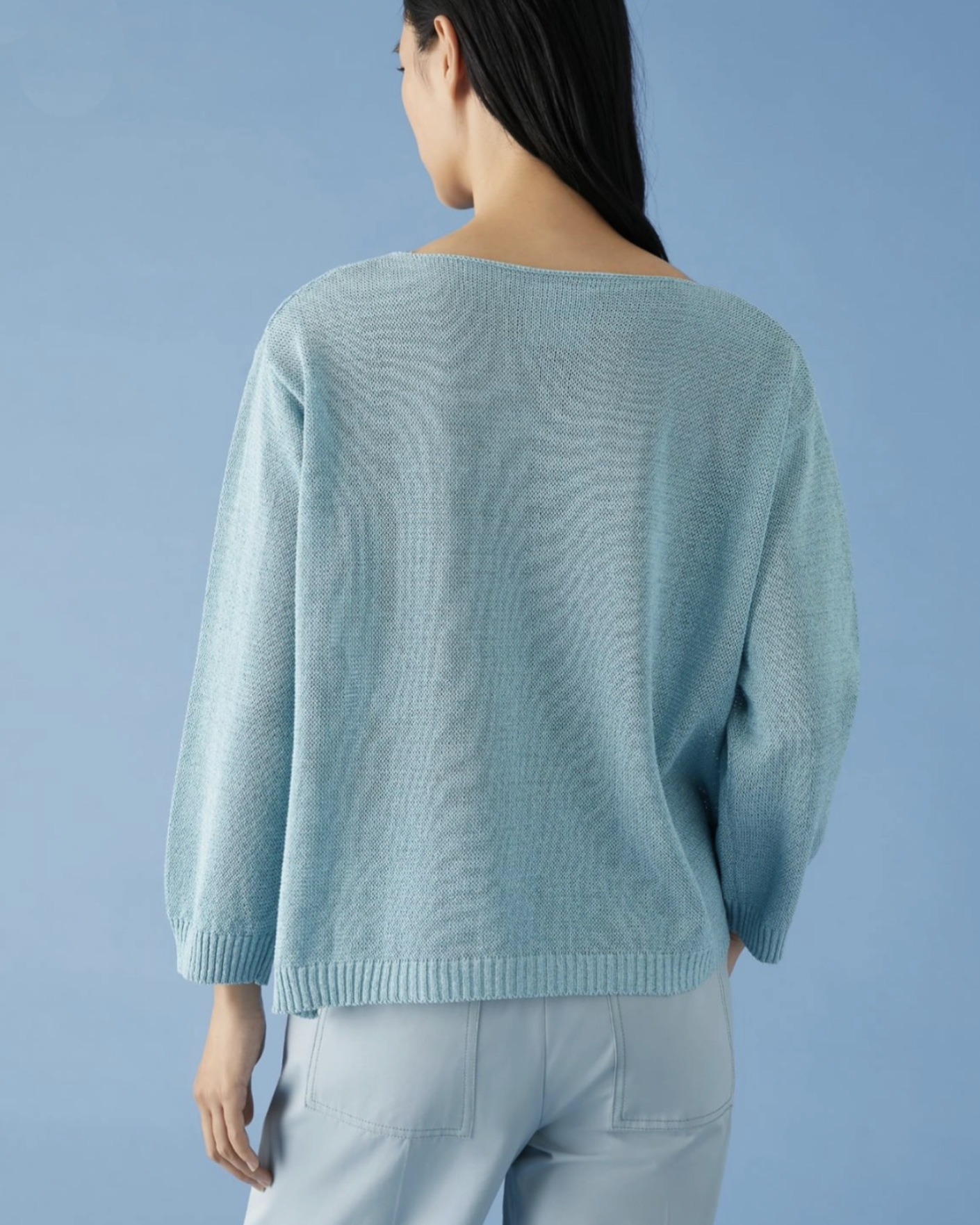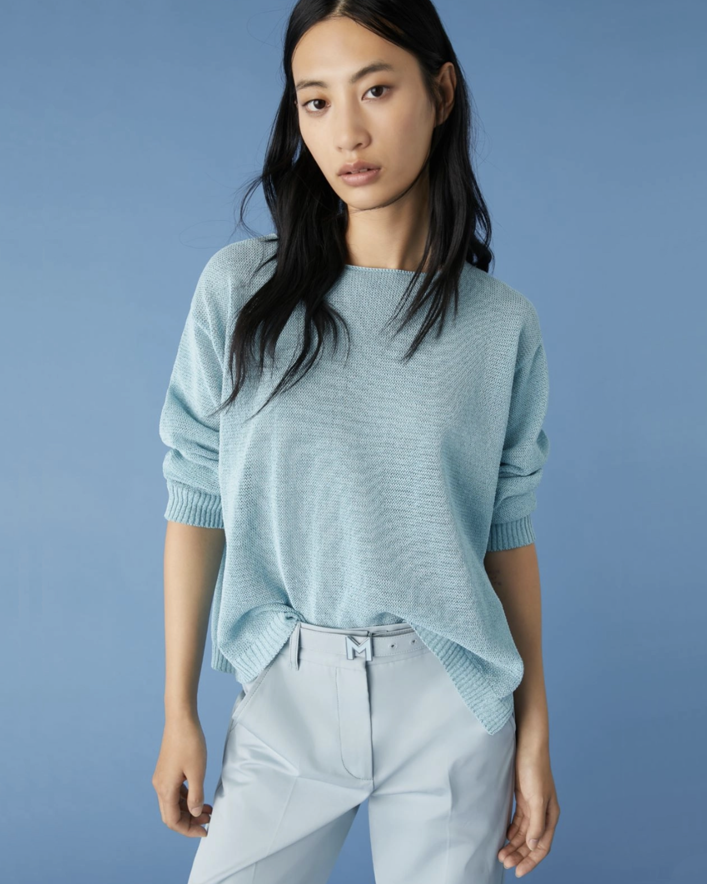 Свободный джемпер Marella голубого цвета в строчный рисунок с люрексом. Модель с круглым вырезом, манжетами и низом на вывязанной резинке. Имеются боковые разрезы. Джемпер станет фаворитом вашего гардероба.