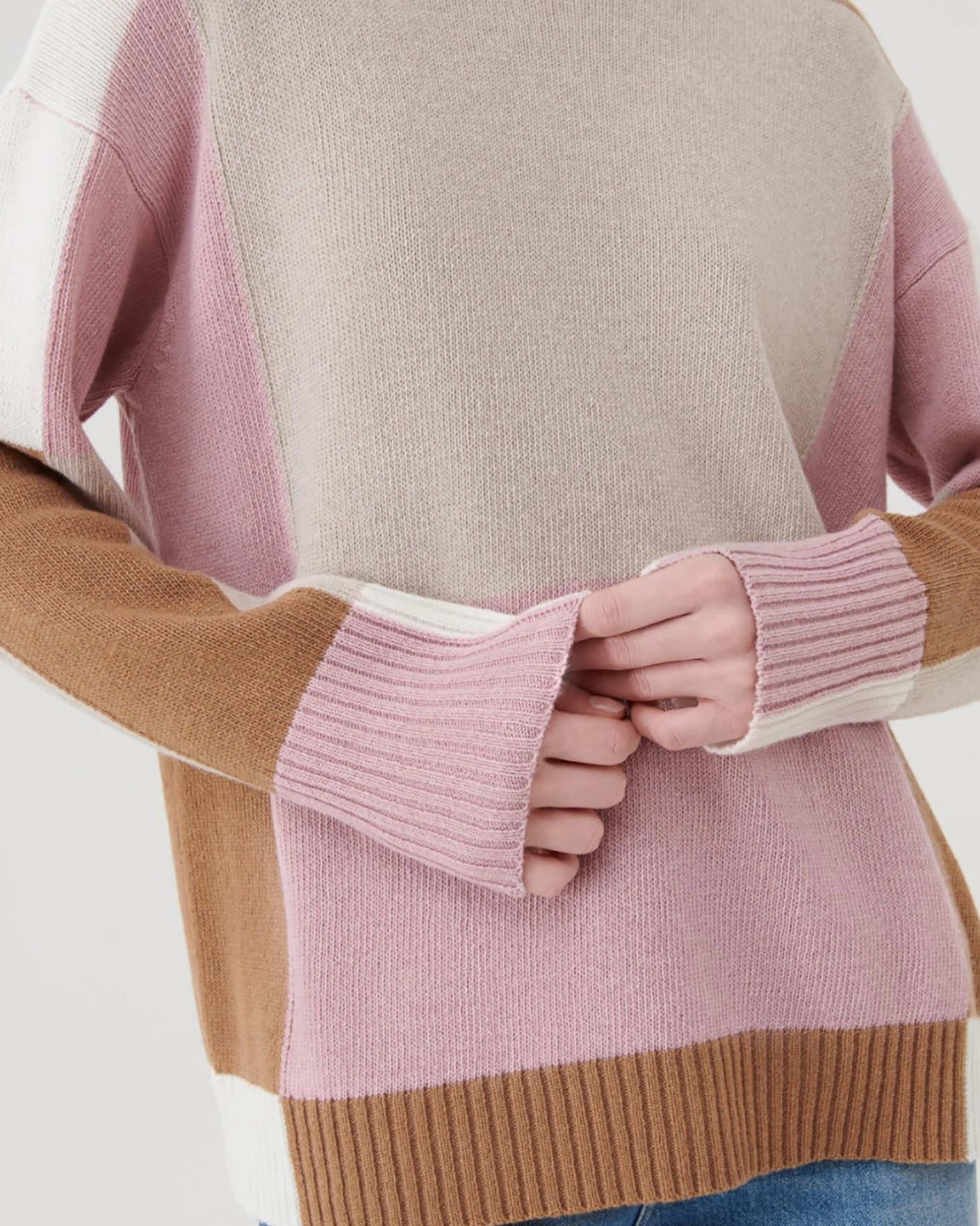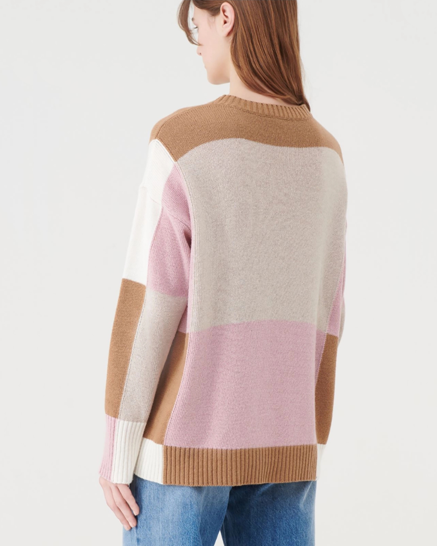Свободный джемпер Marella розово-бежевого цвета в строчный и абстрактный рисунок. Модель с круглым вырезом, манжетами и низом на вывязанной резинке. Джемпер станет фаворитом повседневного гардероба.