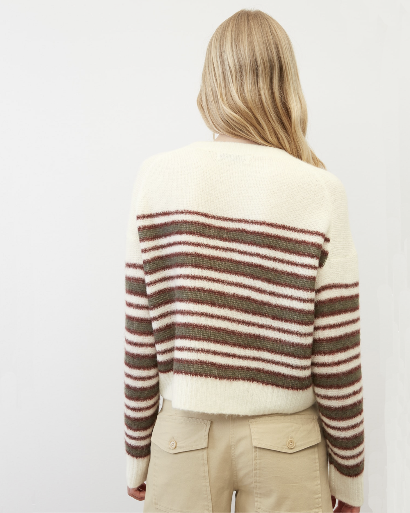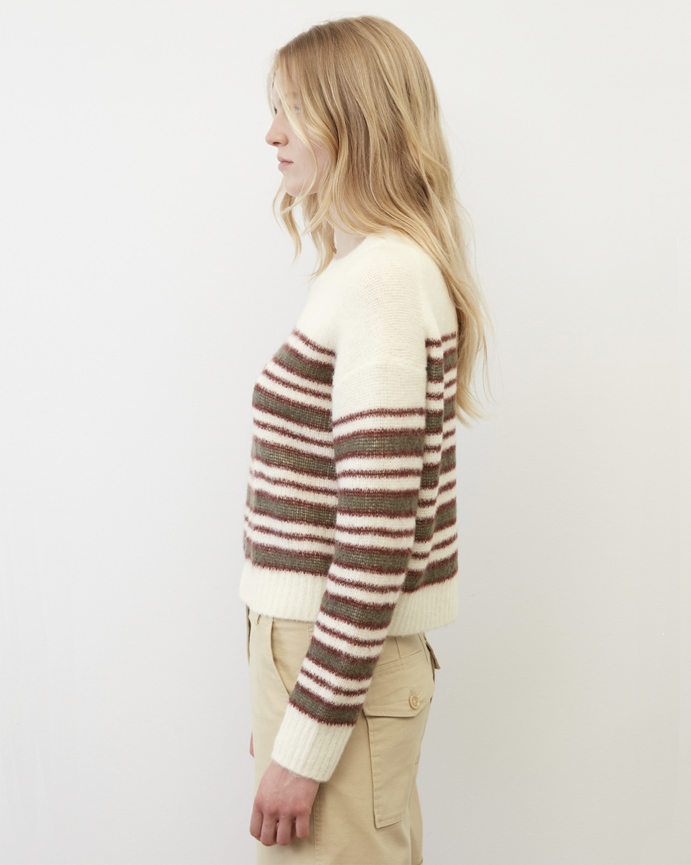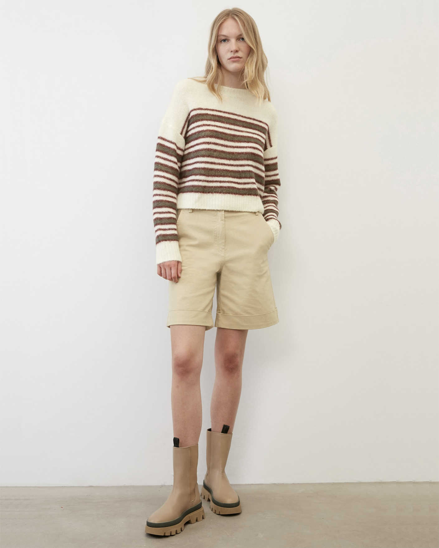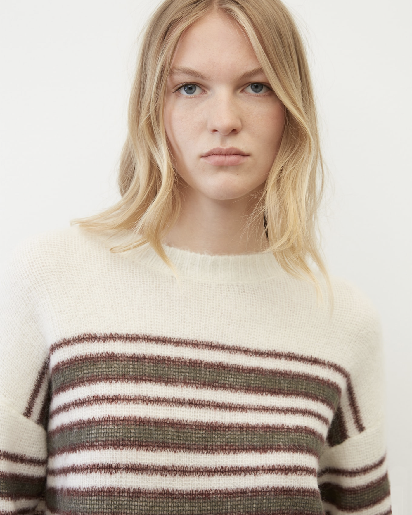 Мягкий джемпер Marc O'Polo кремового цвета в контрастную горизонтальную полосу. Модель с строчный и текстурный рисунок с круглым вырезом и спущенной линией плеча. Манжеты, ворот и низ на тонкой резинке. Стильный джемперотлично впишется в ваш гардероб на каждый день.