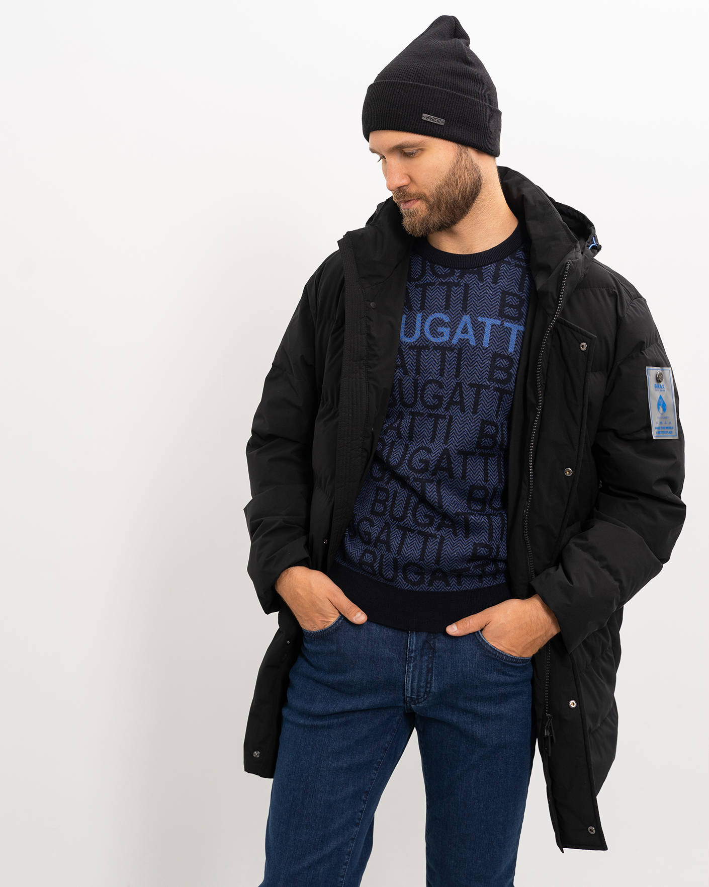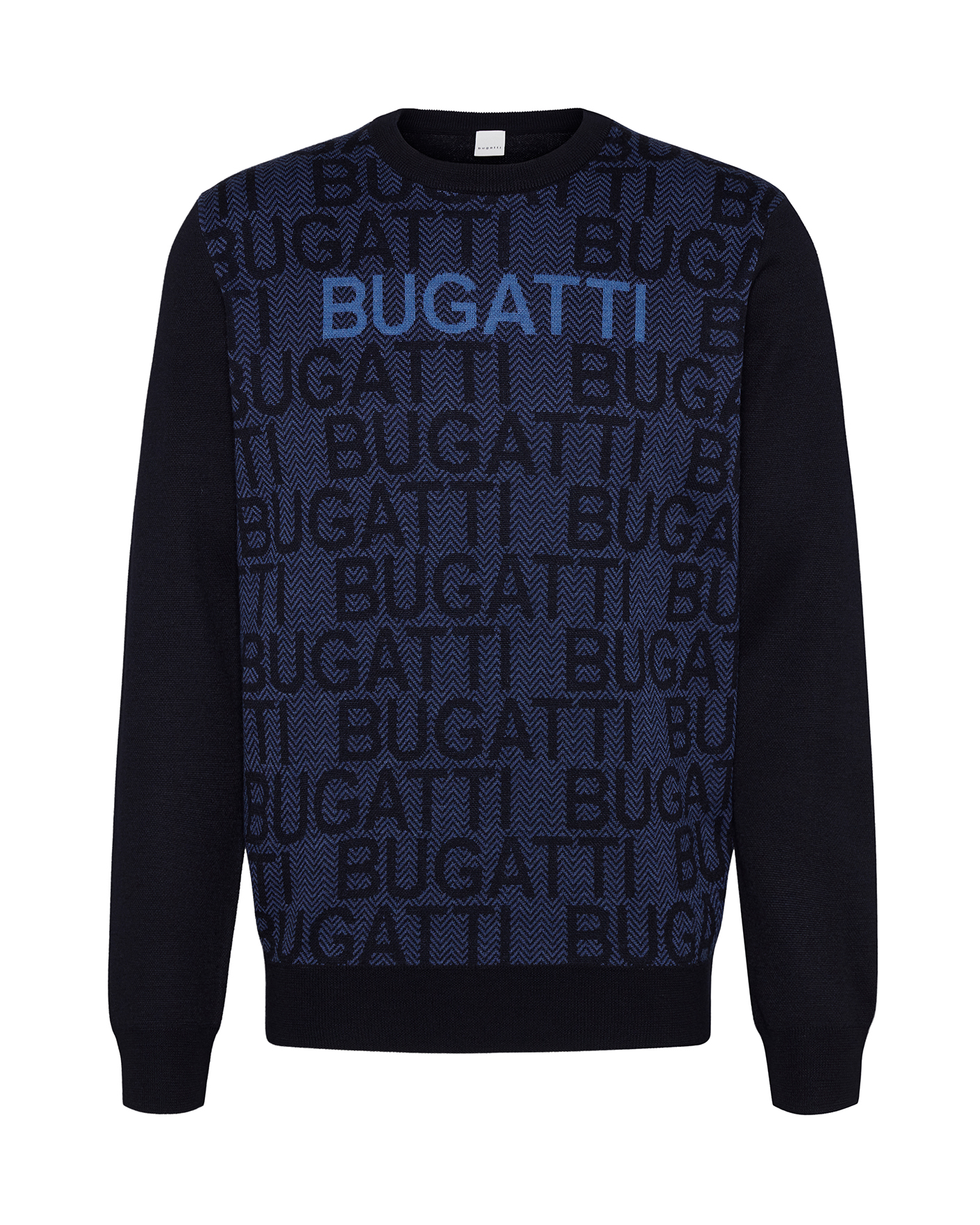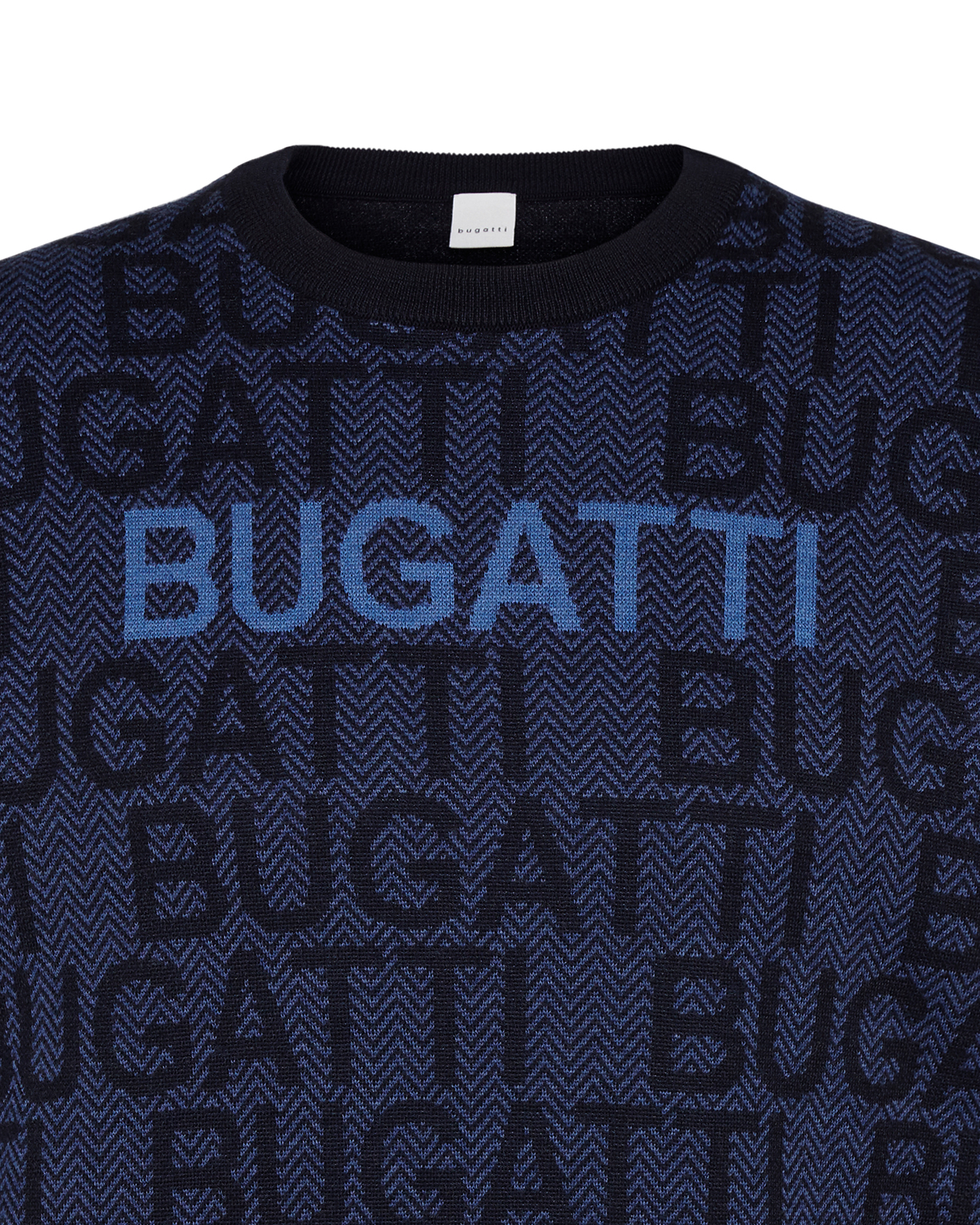Джемпер Bugatti темно-синего цвета в строчный рисунок-елочка и крупным логотипом по корпусу и контрастным на груди. Круглый вырез, манжеты и низ на тонкой ребристой резинке. Джемпер отлично впишется в повседневный гардероб.