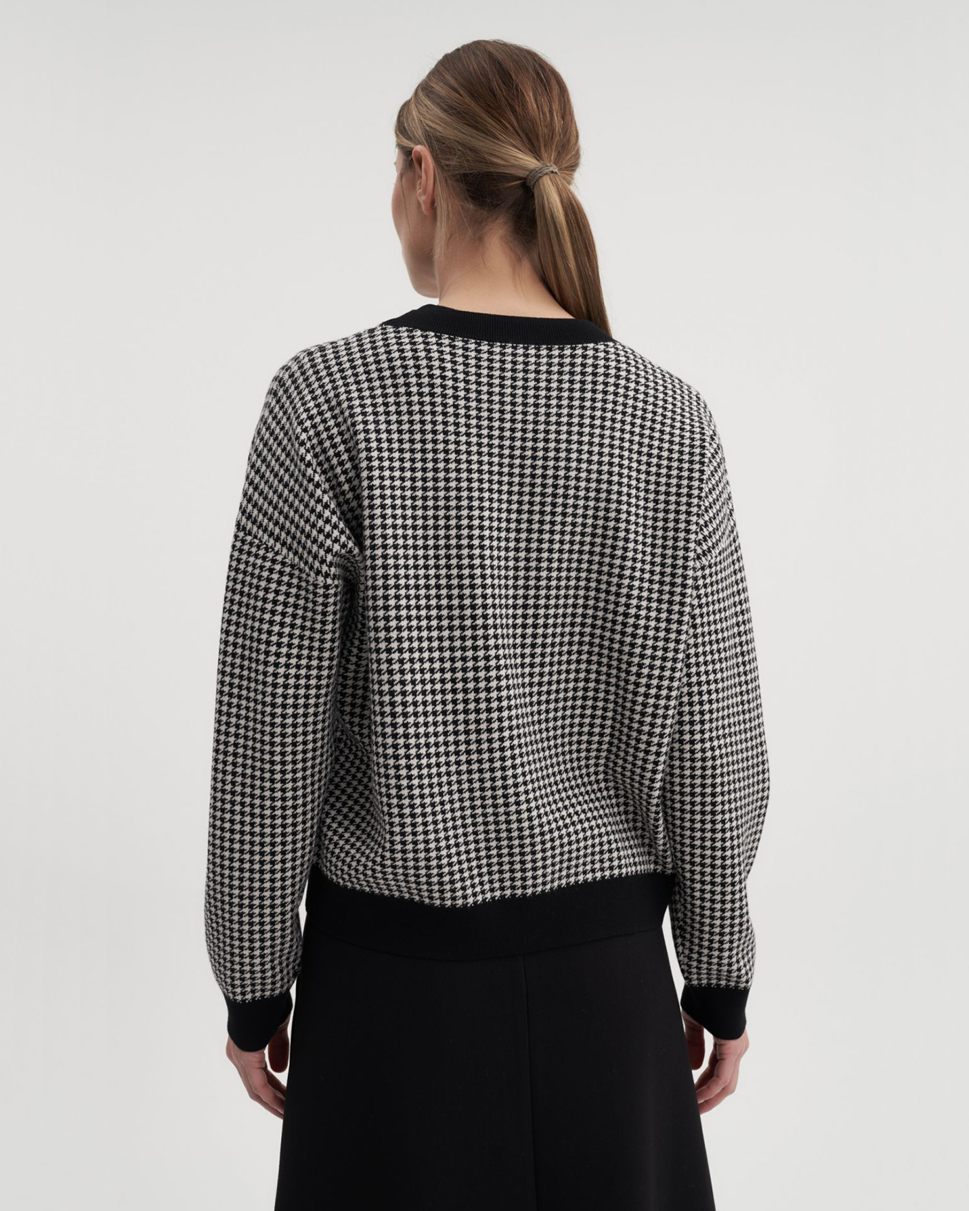Свободный джемпер UNQ бело-черного цвета в принт гусиные лапки. Модель с круглым вырезом, манэетами и низом на ребристой резинке в однотонном цвете. Спущенная линия плеча создает комфорт и свободу движений. Джемпер отлично впишется в ваш гардероб на каждый день.
