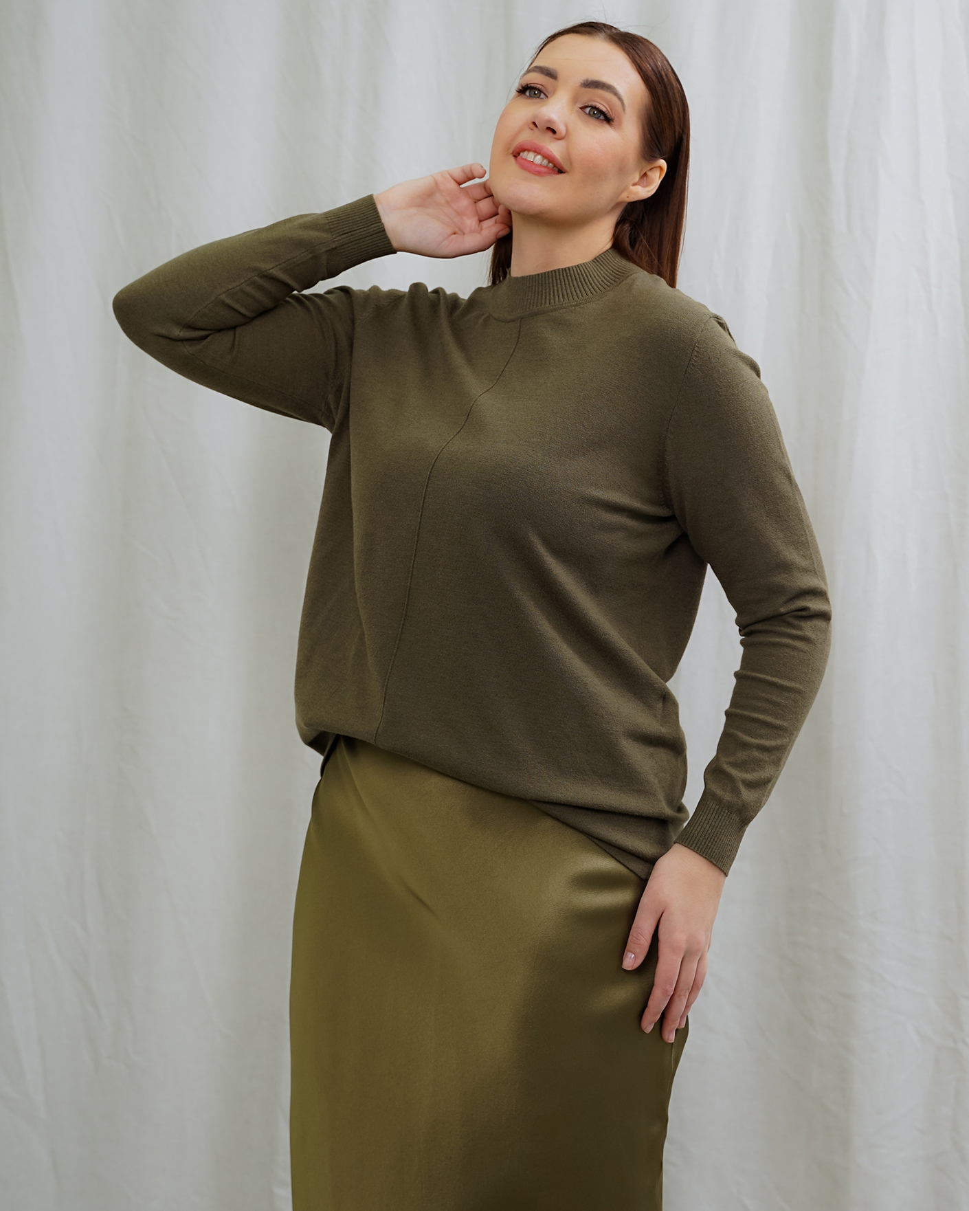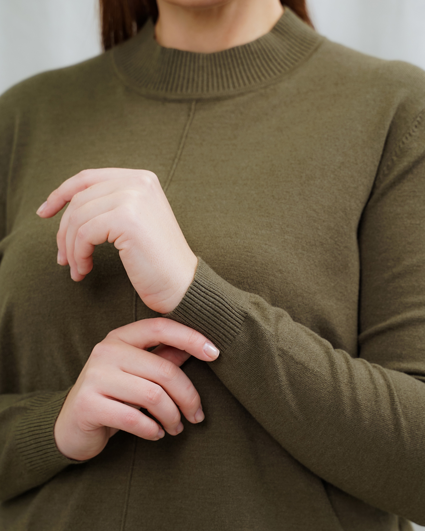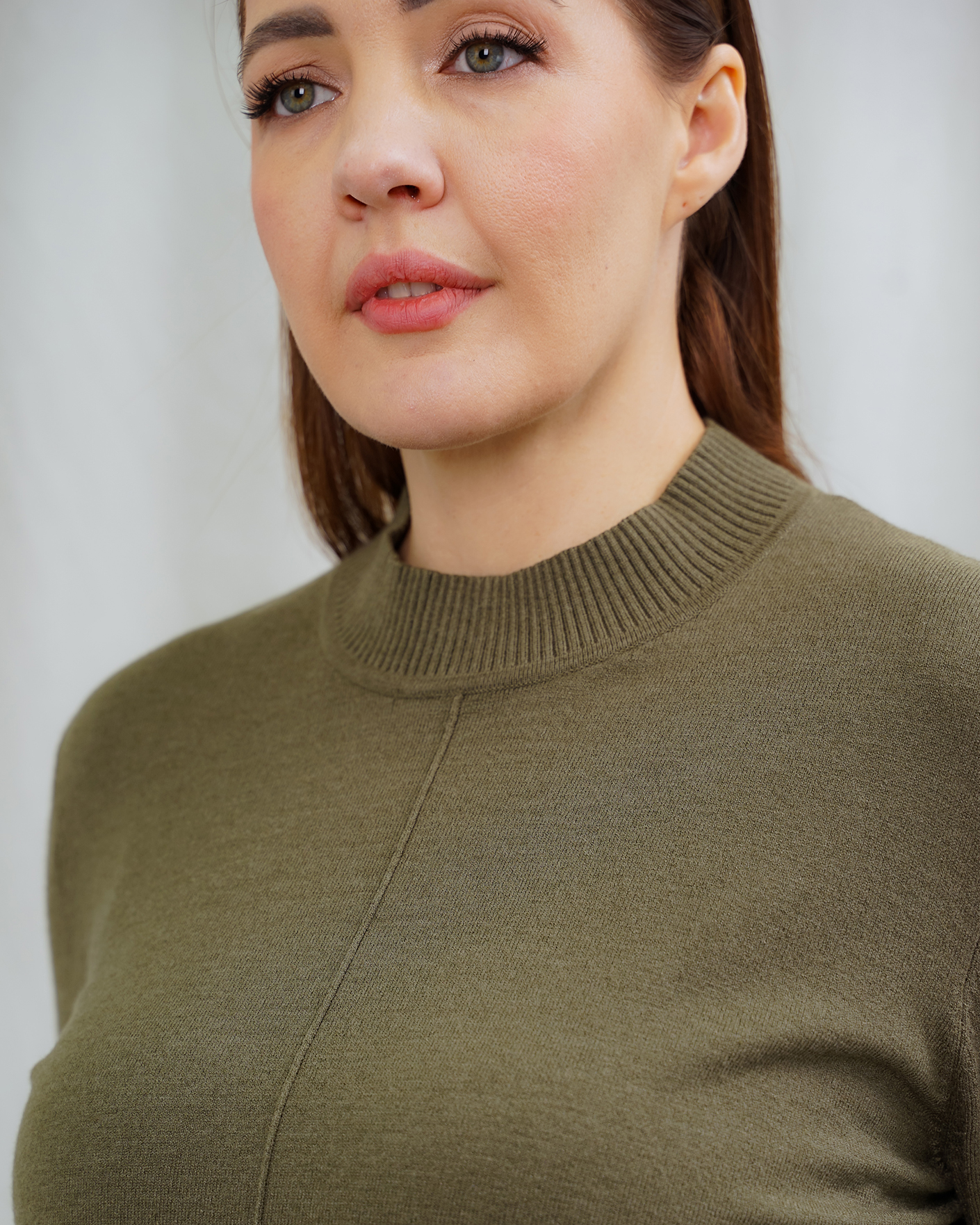Полуприталенный джемпер Barbara Lebek зеленого цвета в строчный рисунок. Модель с воротником-стйока и манжетами на тонкой ребристой резинке. Джемпер - универсальная вещь на каждый день.