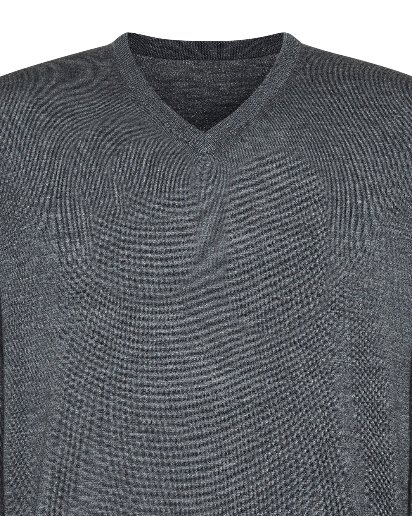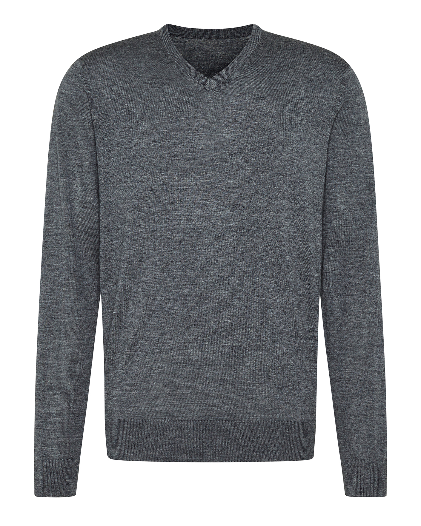 Универсальный пуловер Bugatti серого цвета в строчный рисунок. Модель из 100% шерсти, V-образный вырез, манжеты и низ на тонкой ребристой резинке. Пуловер станет незаменимой вещью на каждый день.