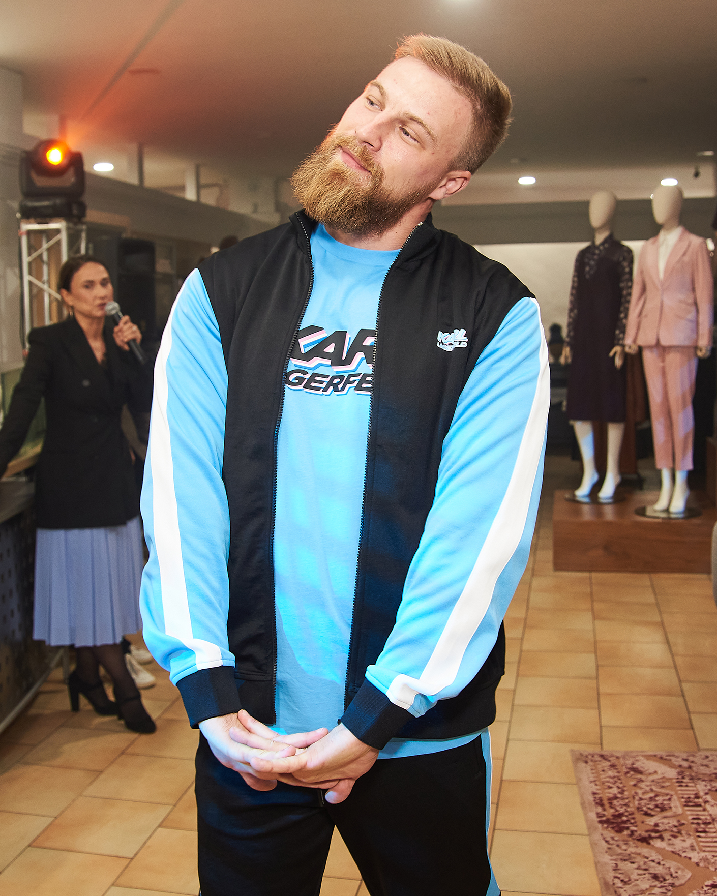 Толстовка-бомбер Karl Lagerfeld черного цвета с рукавами в голубом цвете. Модель с нагрудным логотипом, с воротником-стойка, манжетами и низом на тонкой резинке. Застежка на молнию, имеются врезные карманы по бокам. Бомбер отлично впишется в ваш гардероб.
