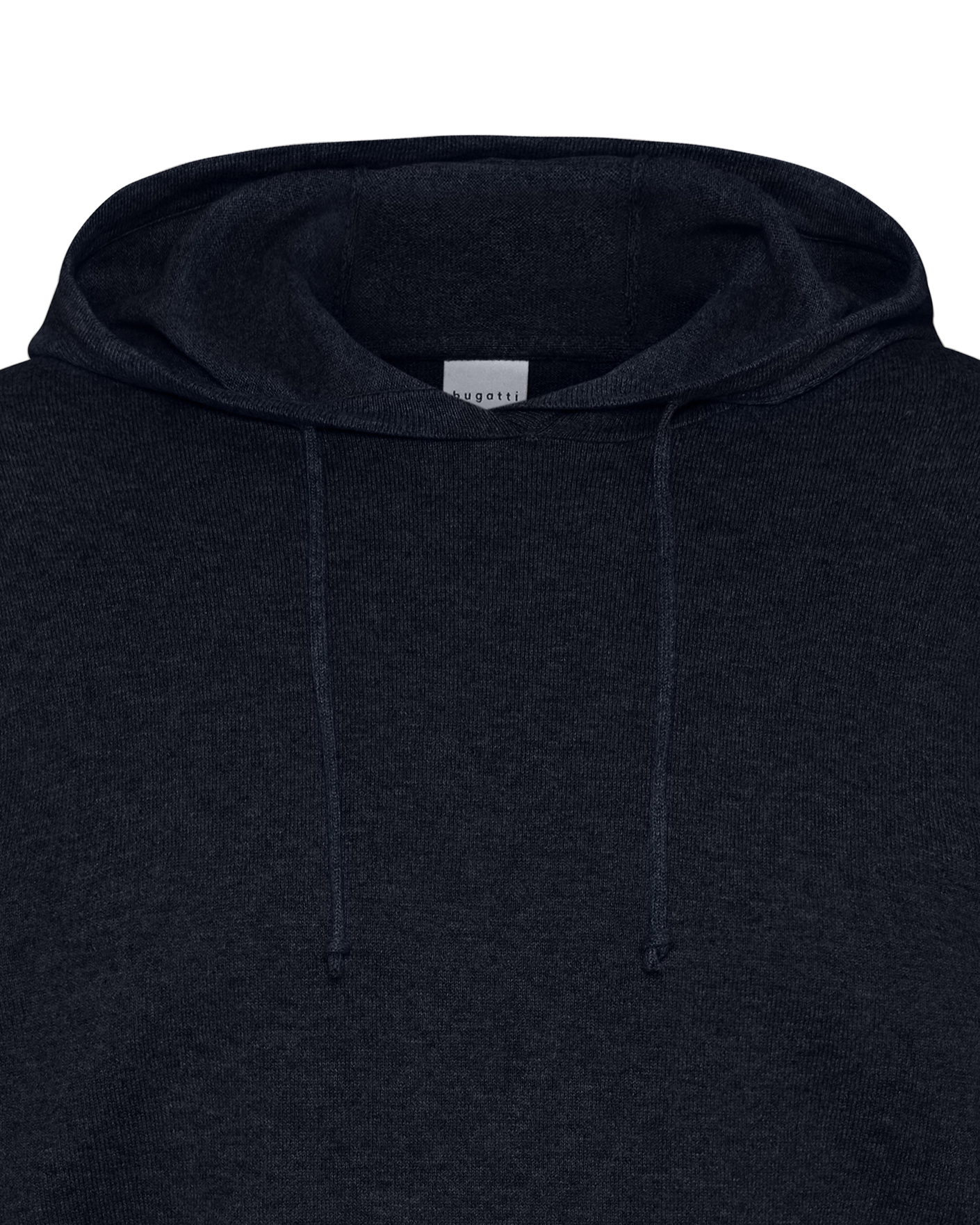 Толстовка Bugatti темно-синего цвета. Модель выполнена из высококачественного хлопка с добавлением кашемира. Имеется регулируемый капюшон. Толстовка - универсальная и комфортная вещщь на каждый день.