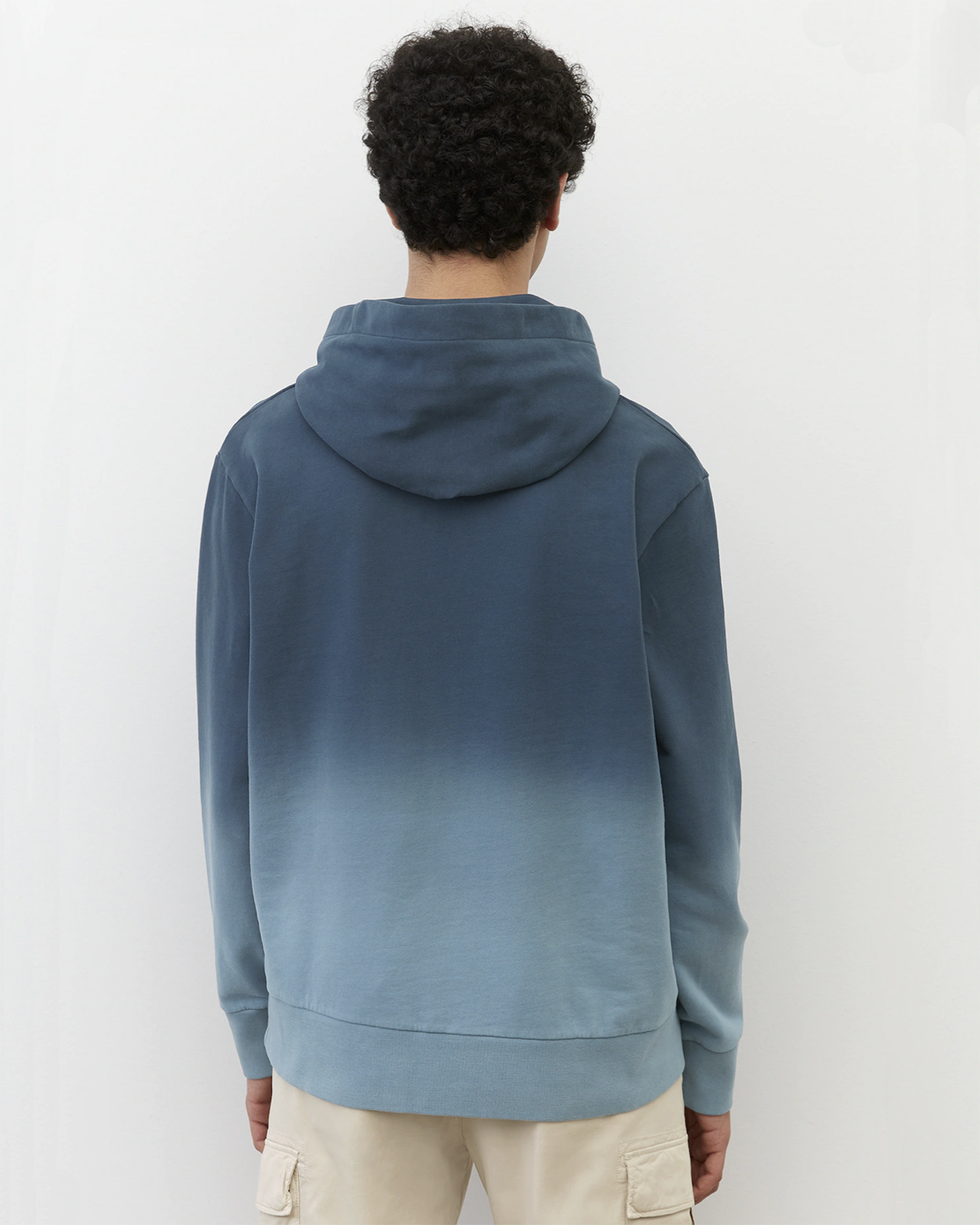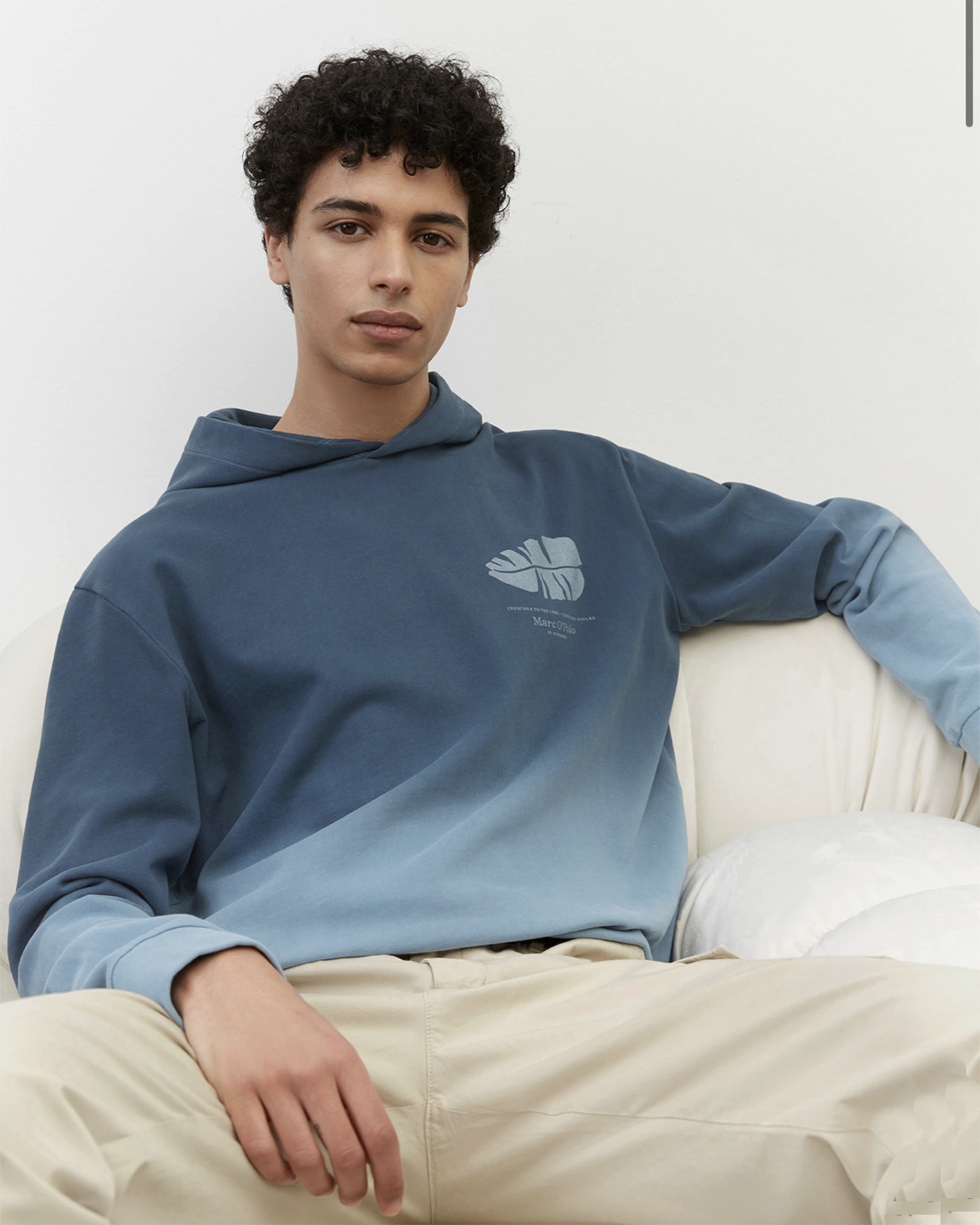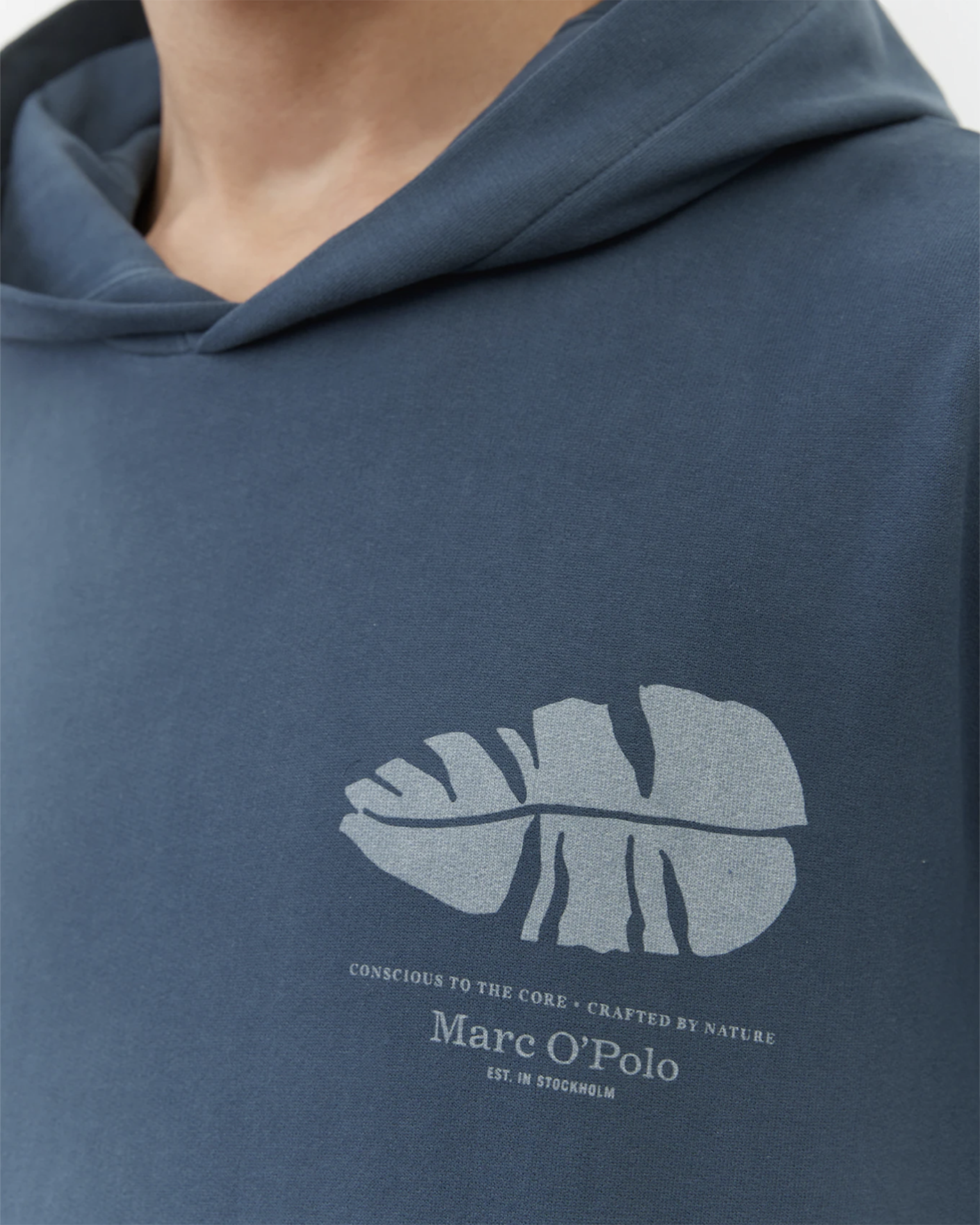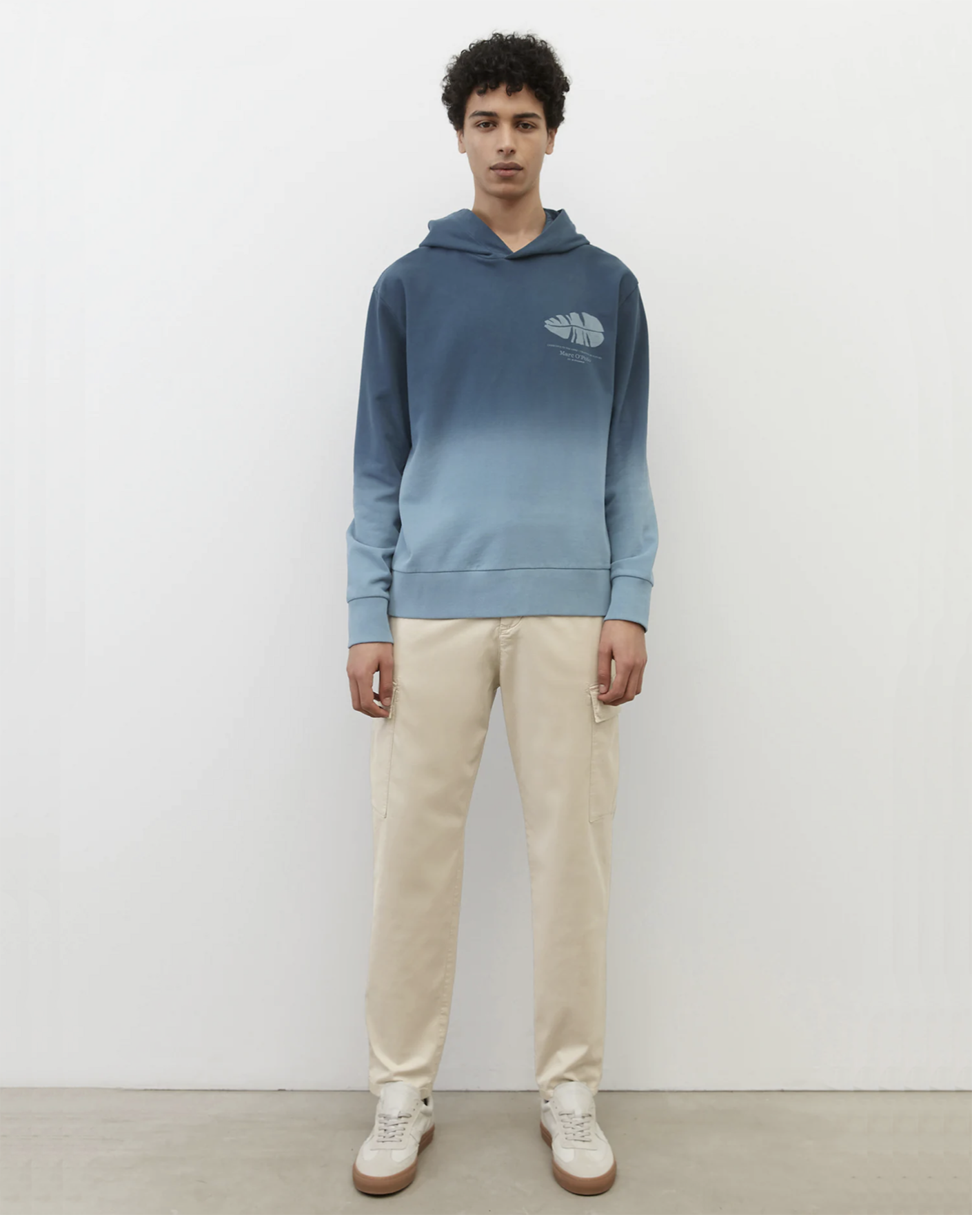 Худи Marc O'Polo серо-синего цвета в градиентную окраску. Модель из 100% хлопка с нагрудным принтом в виде листа и логотипа. Фиксированный капюшон, манжеты и низ на тонкой резинке. Худи станет ярким дополнением к вашему повседневному гардеробу.