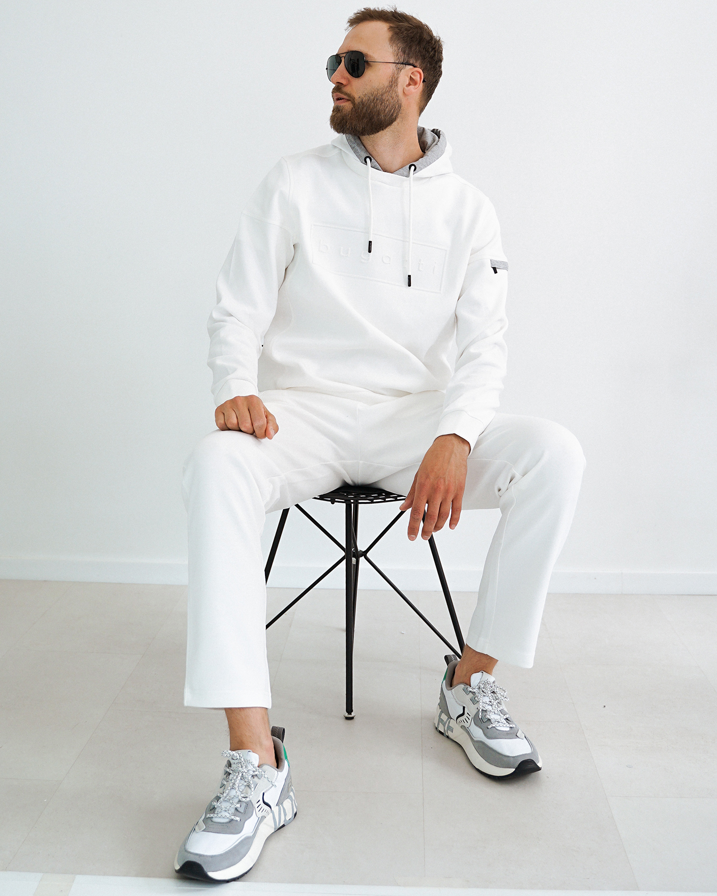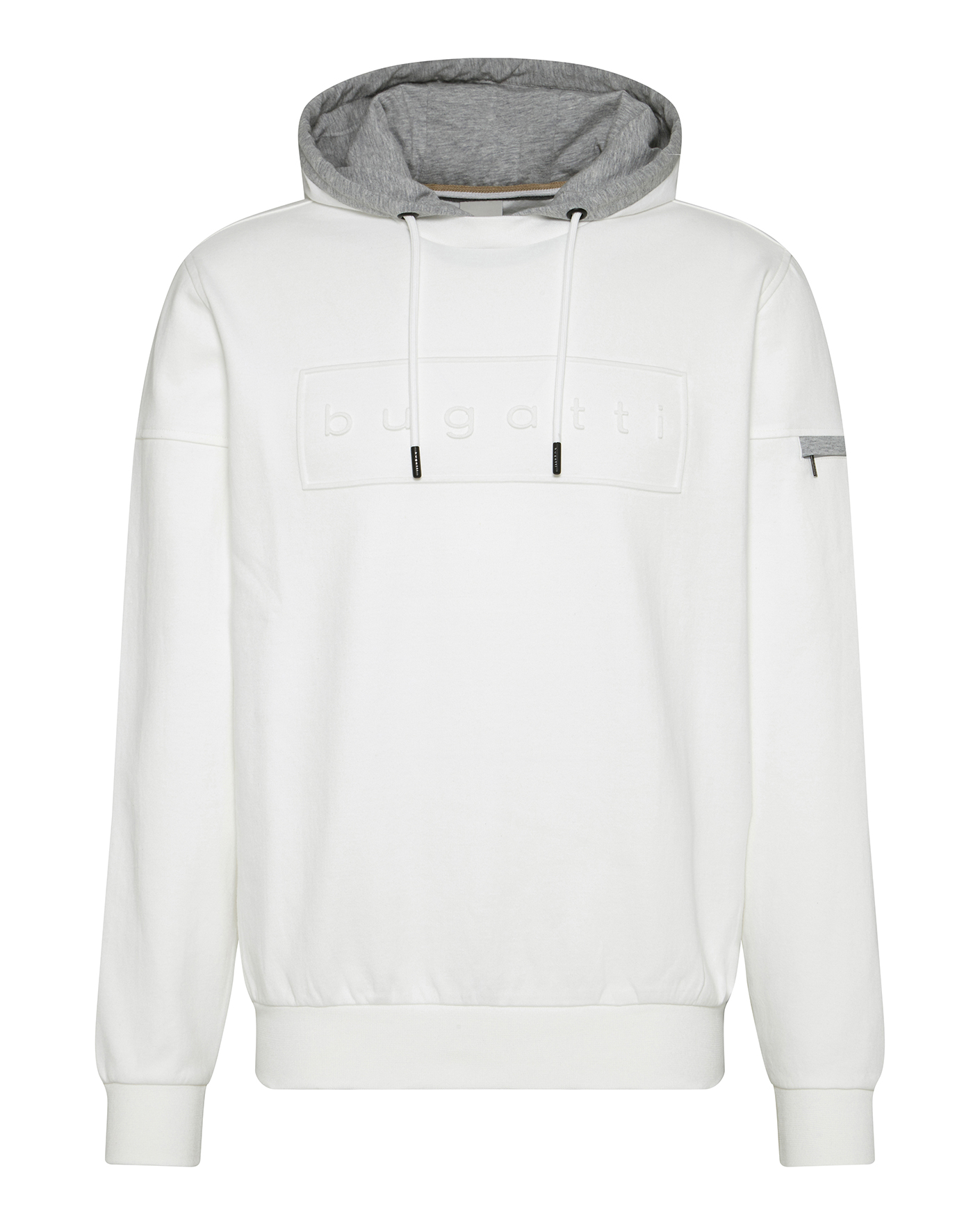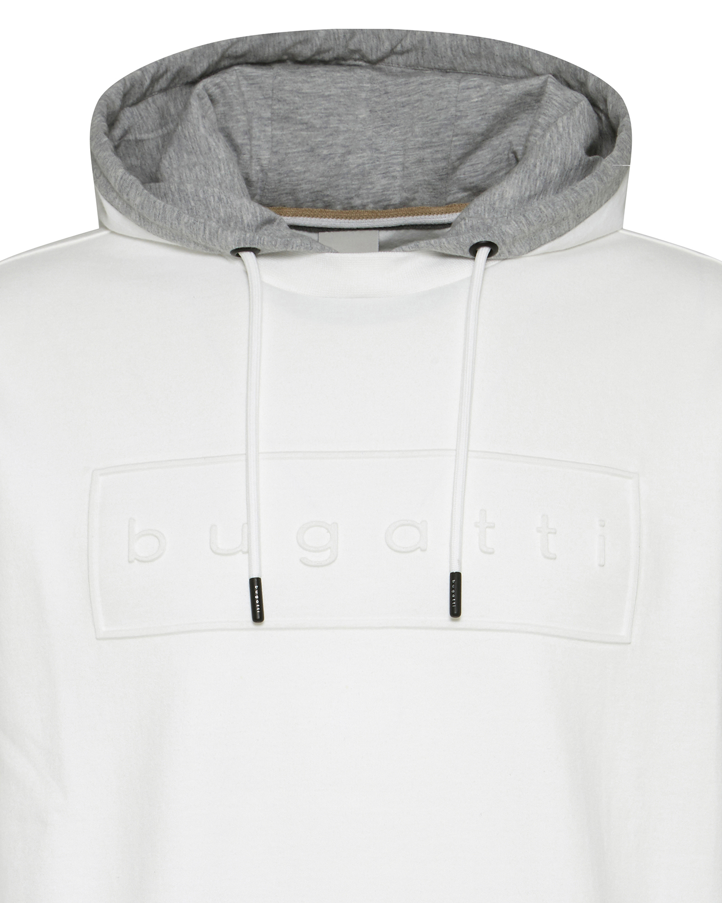 Худи Bugatti белого цвета с нагрудным логотипом в тон. Модель с регулируемым капюшоном с внутренним подкладом серого цвета. Манжеты и края на тонкой резинке. Худи станет идеальным вариантом для прогулок.
