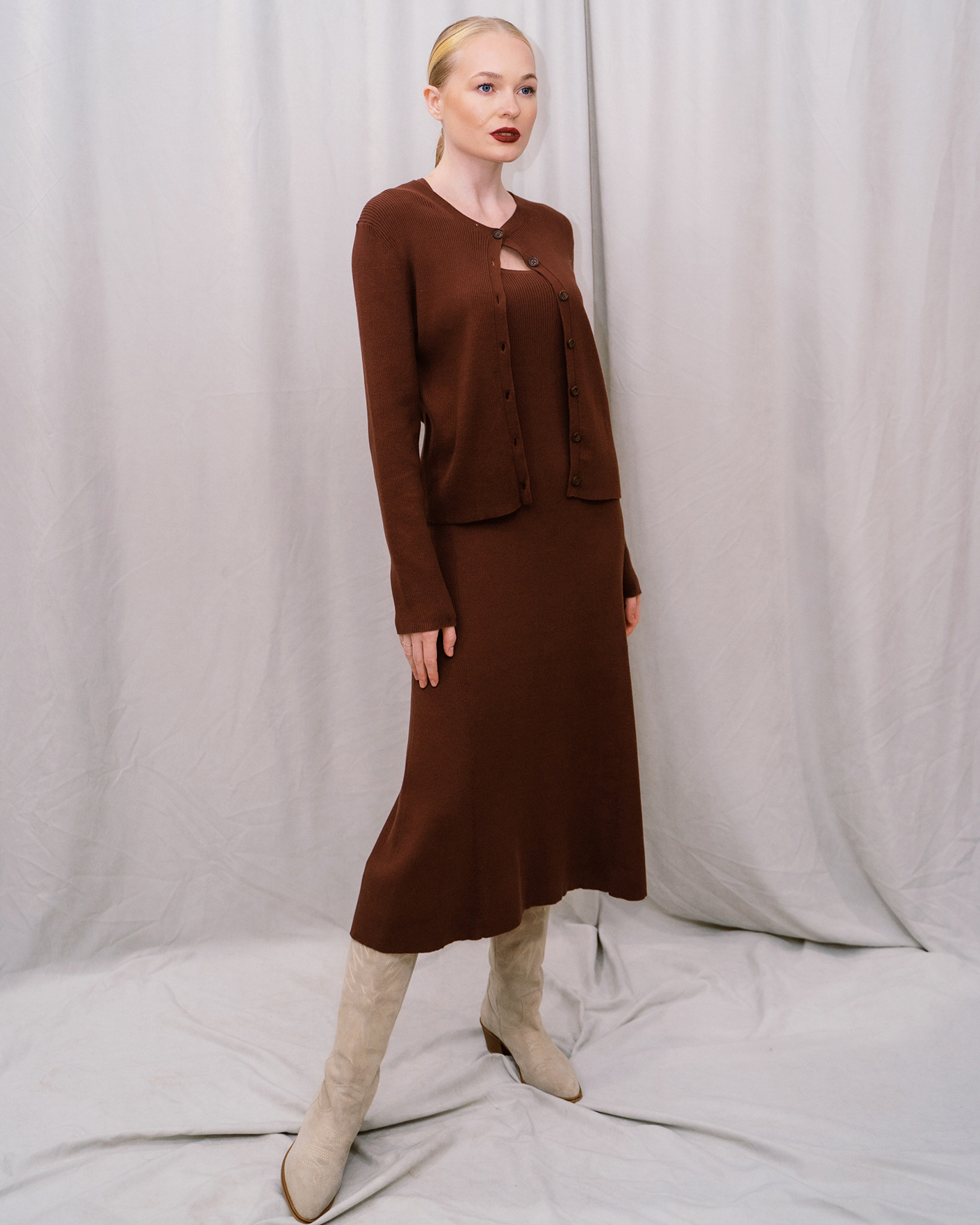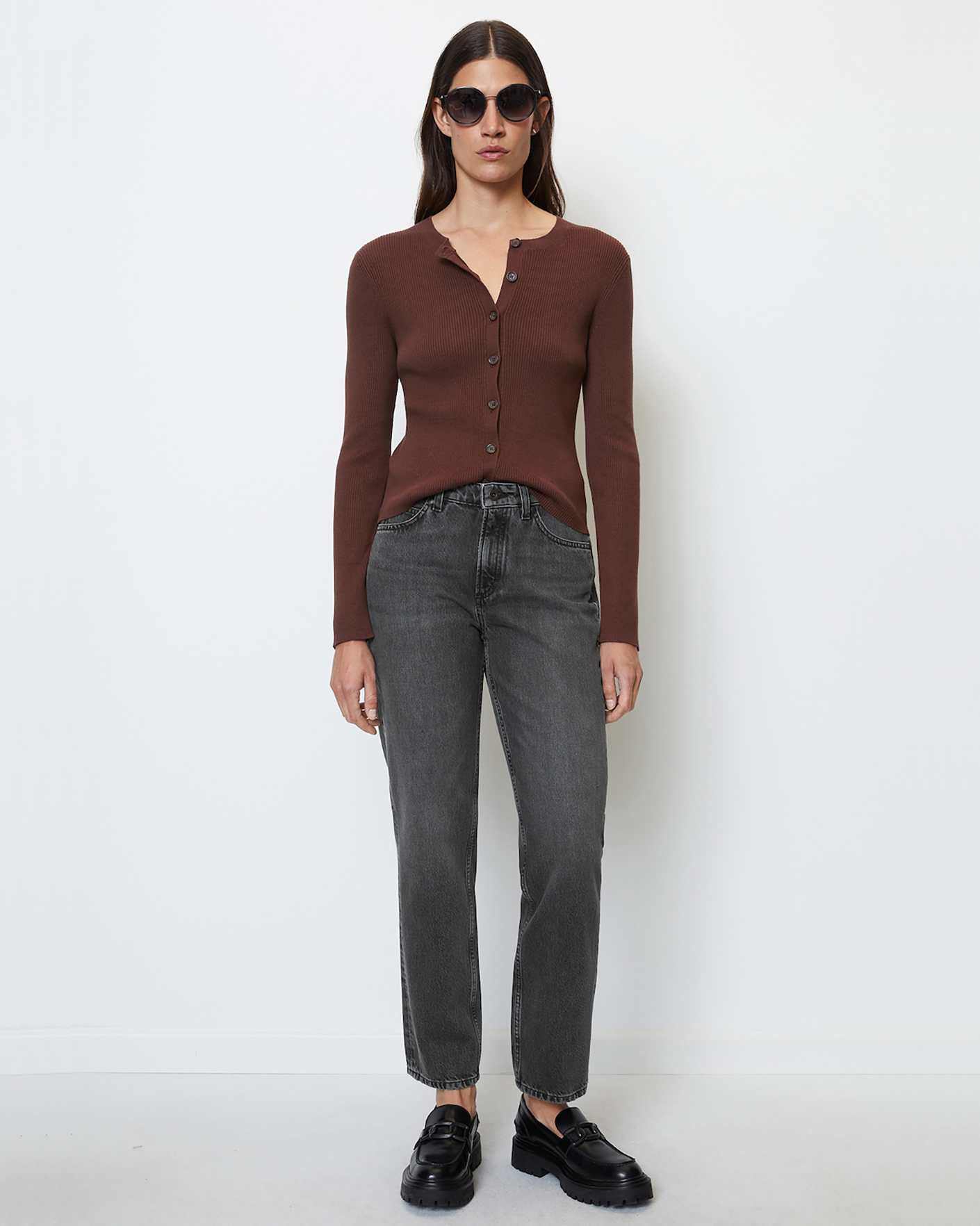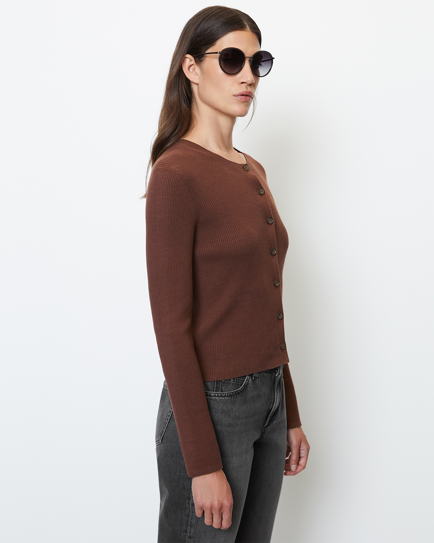 Приталенный кардиган Marc O'Polo коричневого цвета выполнен в мелкий рубчик. Модель из 100% хлопка с круглым вырезом и застежкой на пуговицы. Кардиган станет фаворитом вашего гардероба.