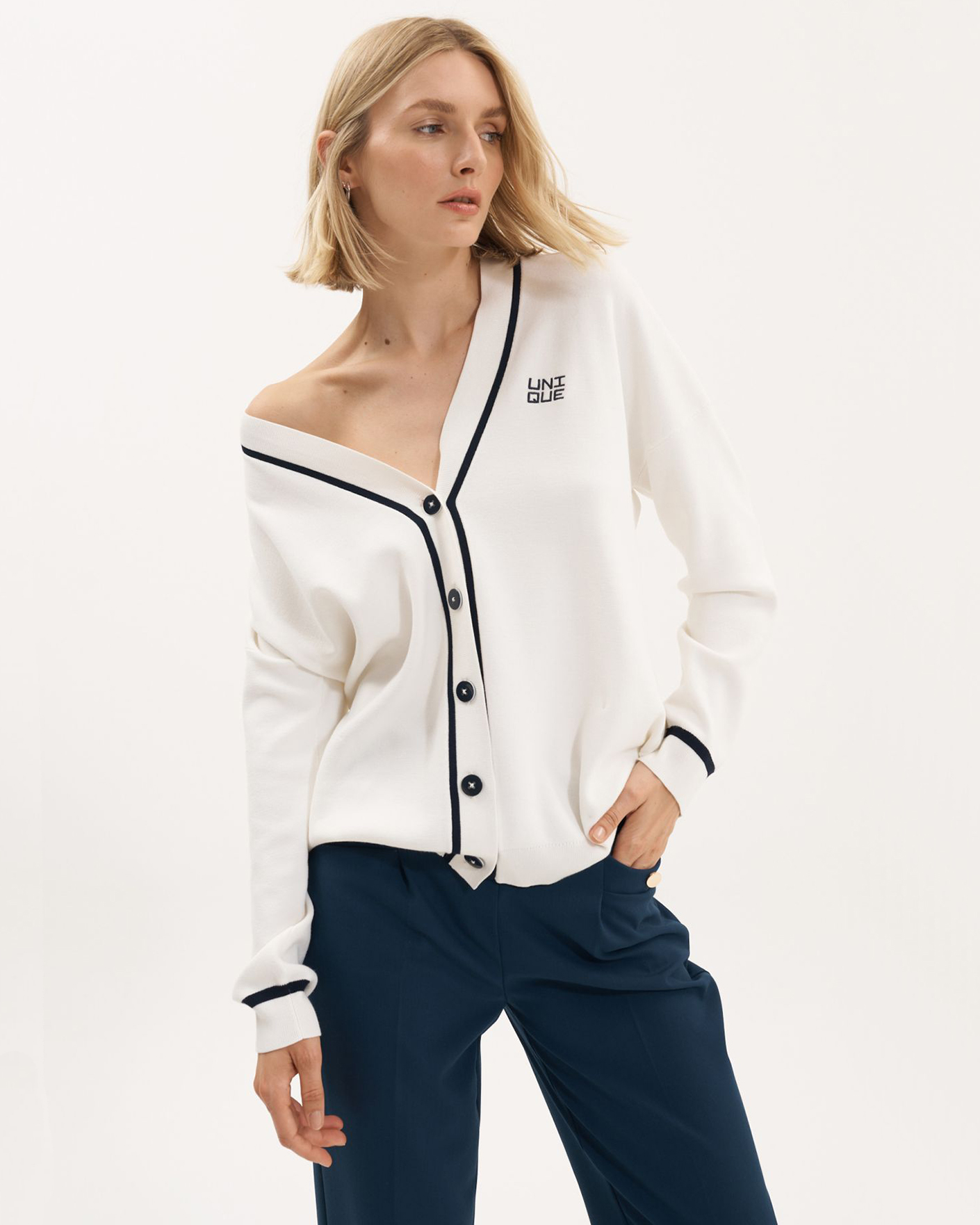 Свободный кардиган UNQ белого цвета в строчный рисунок и вывязанный логотип на груди. Модель с глубоким V-образным вырезом, застежка на контрастные пуговицы. Края и манжеты на тонкой ребристой резинке. Кардиган можно сочетать с топом, футболкой, рубашкой, блузой, водолазкой, юбкой и брюками.