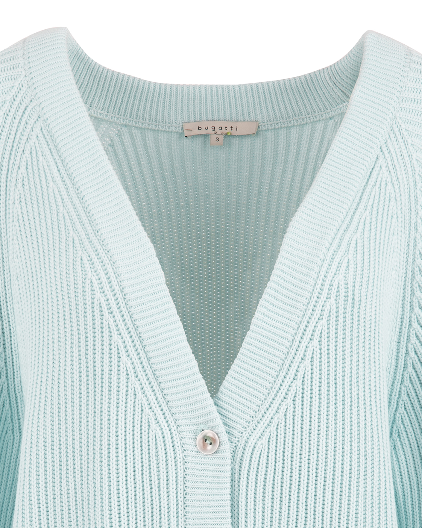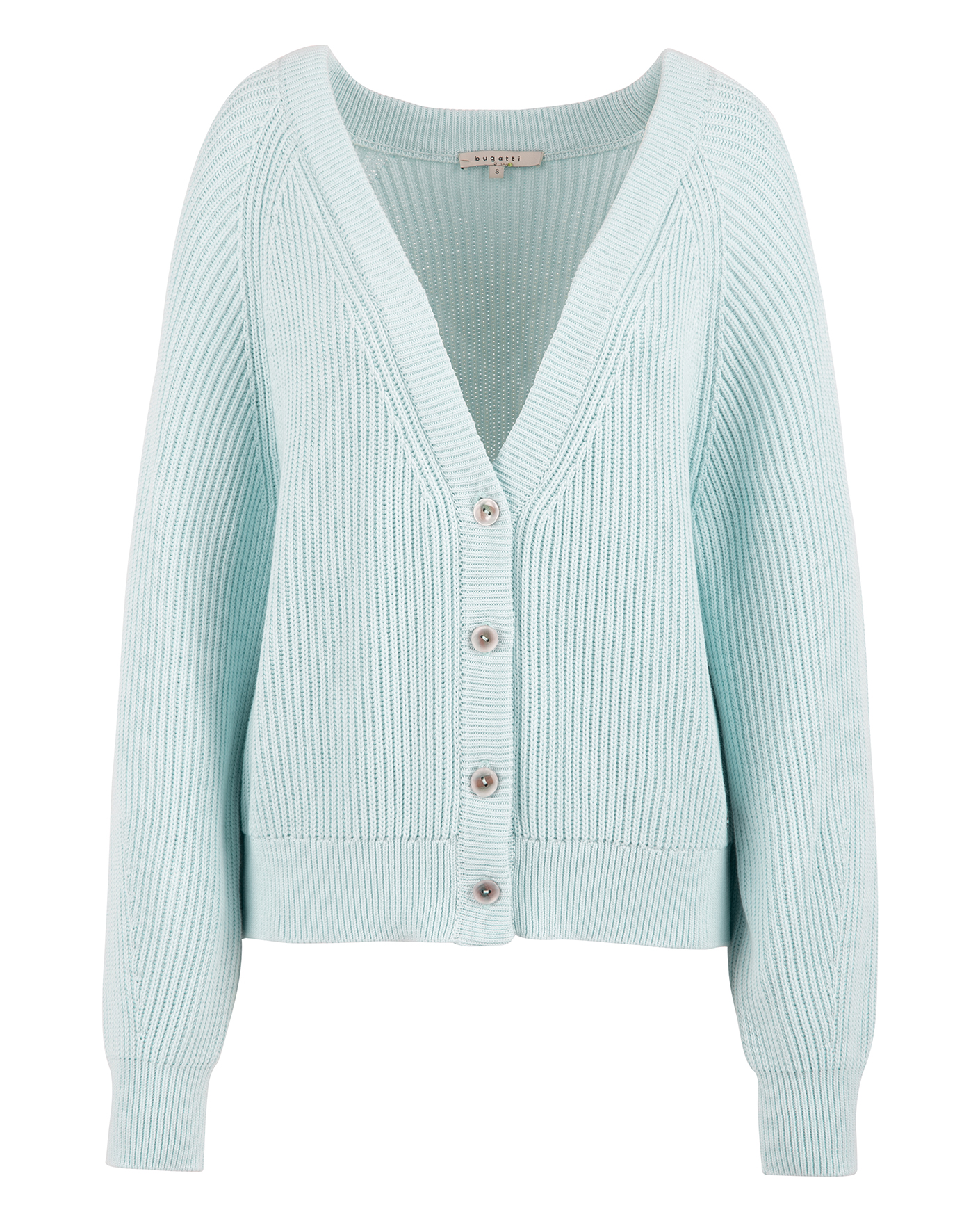 Свободный кардиган Bugatti голубого цвета в вертикальную вязку полосами. Укороченная модель с глубоким V-образным вырезом и застежкой на три пуговицы. Края, манжеты и низ на тонкой вывязанной резинке. Кардиган можно сочетать с футболкой, топом, рубашкой, блузой, водолазкой, юбкой и брюками.