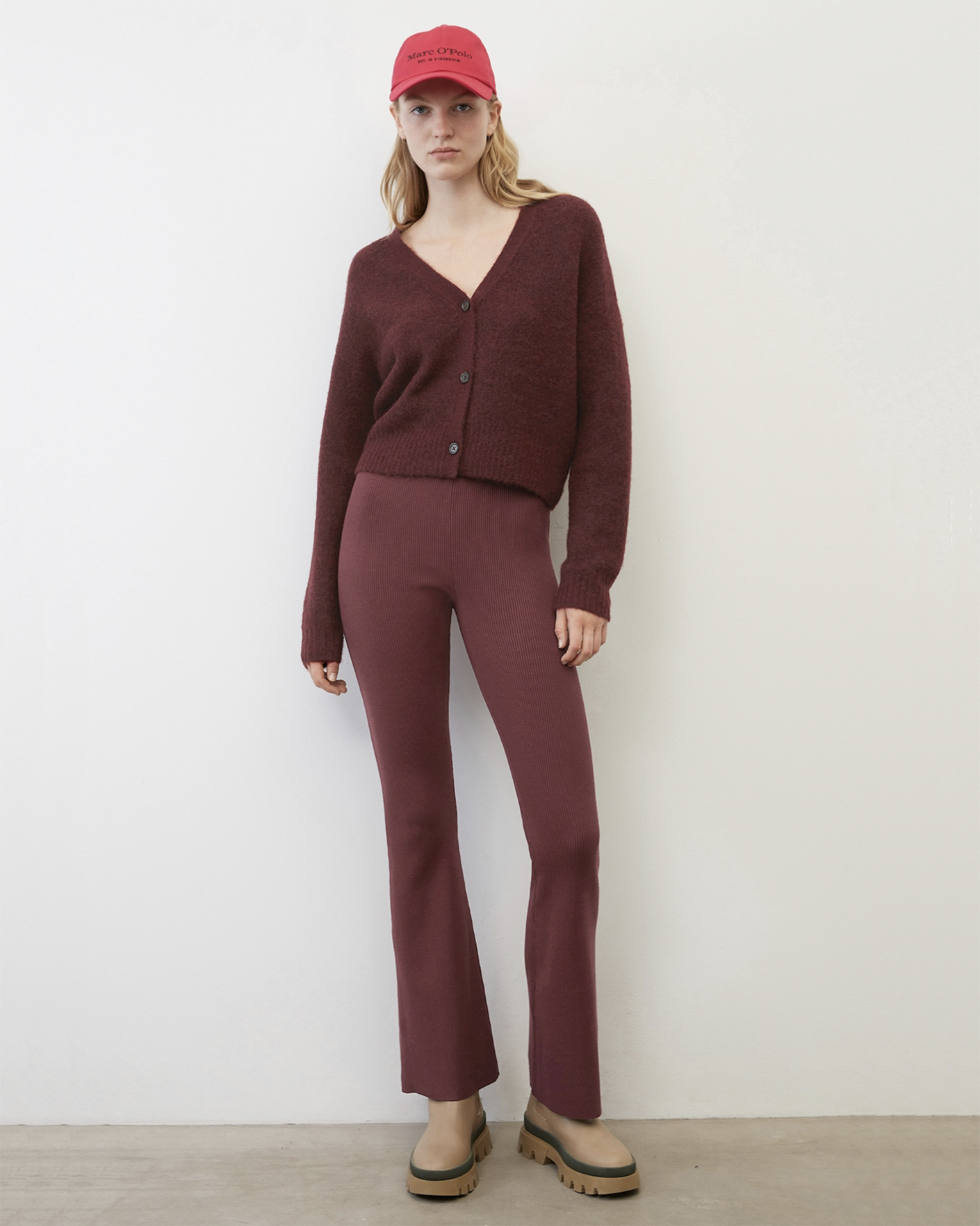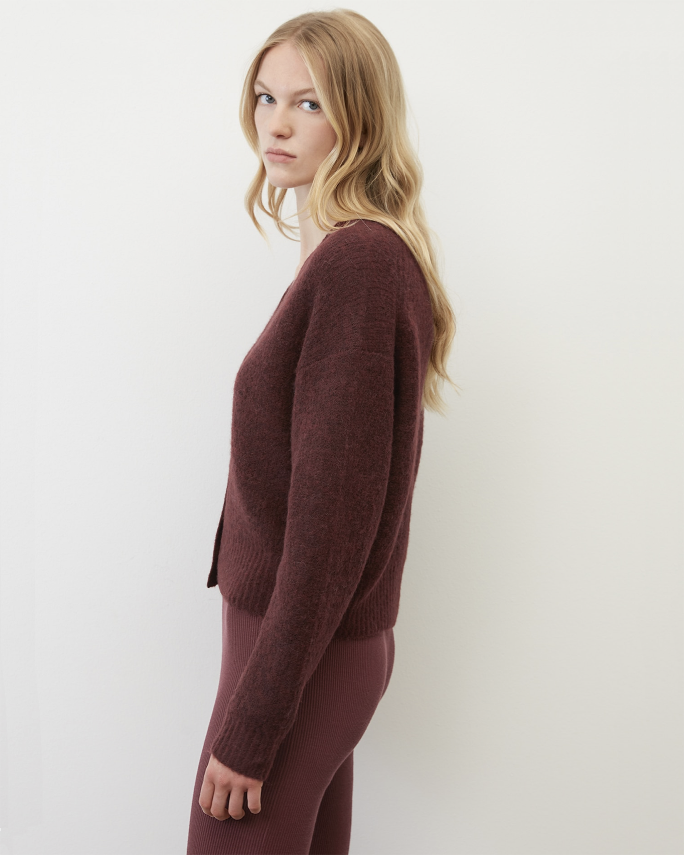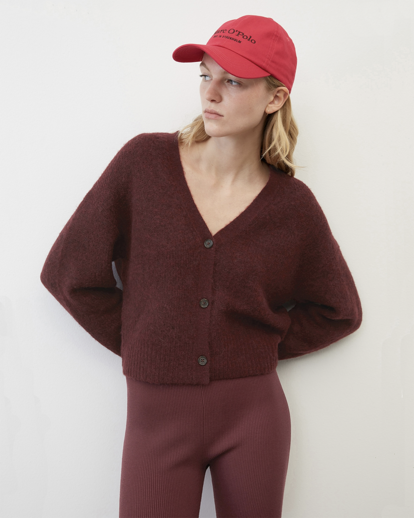 Укороченный кардиган Marc O'Polo винного цвета в текстурную строчку. Модель с V-образным вырезом и застежкой на три пуговицы. Спущенная линия плеча с широкими рукавами создает уютный и комфортный образ. Стильный кардиган можно сочетать с футболкой, топом, рубашкой, блузой, водолазкой, платьем, юбкой и брюками.