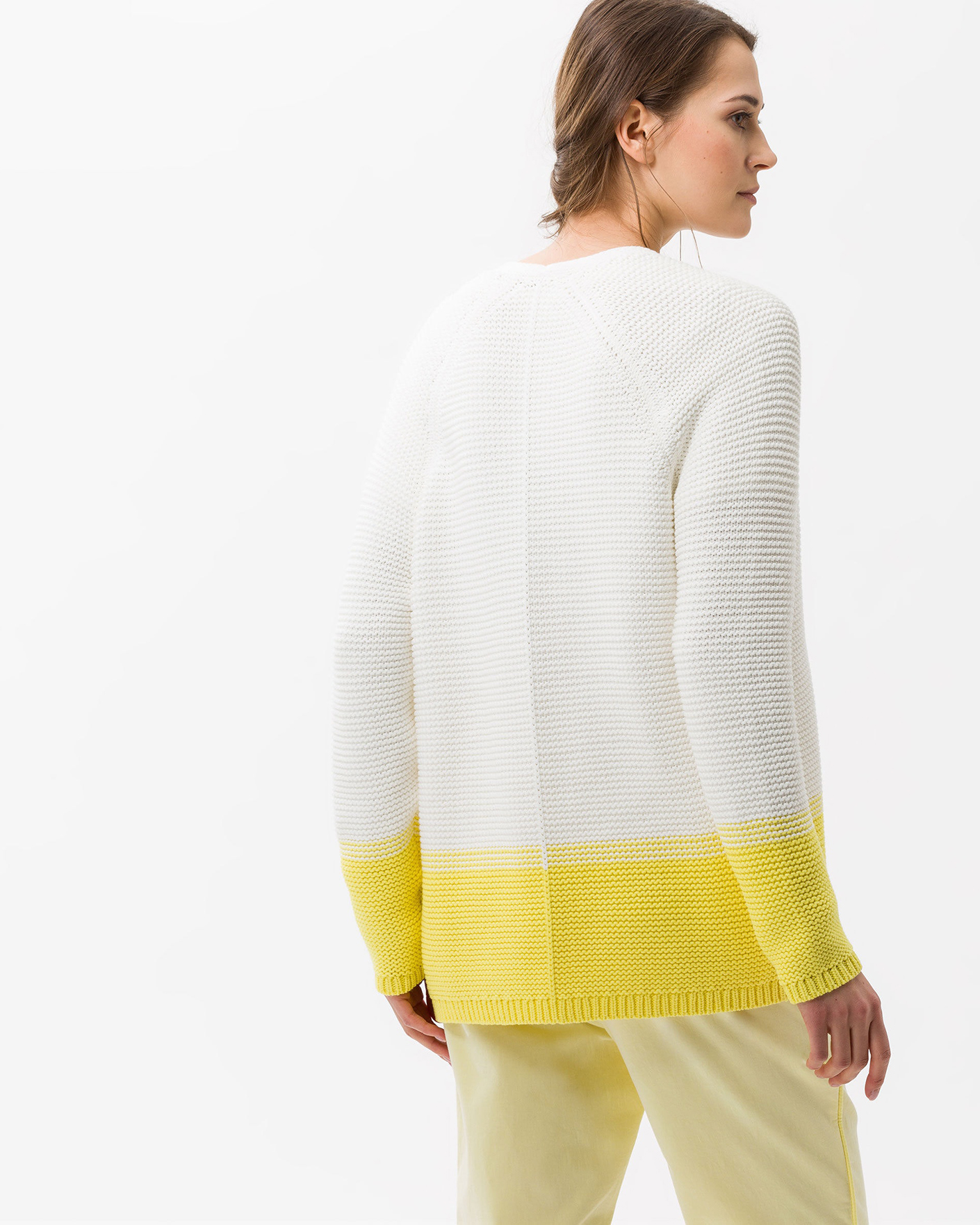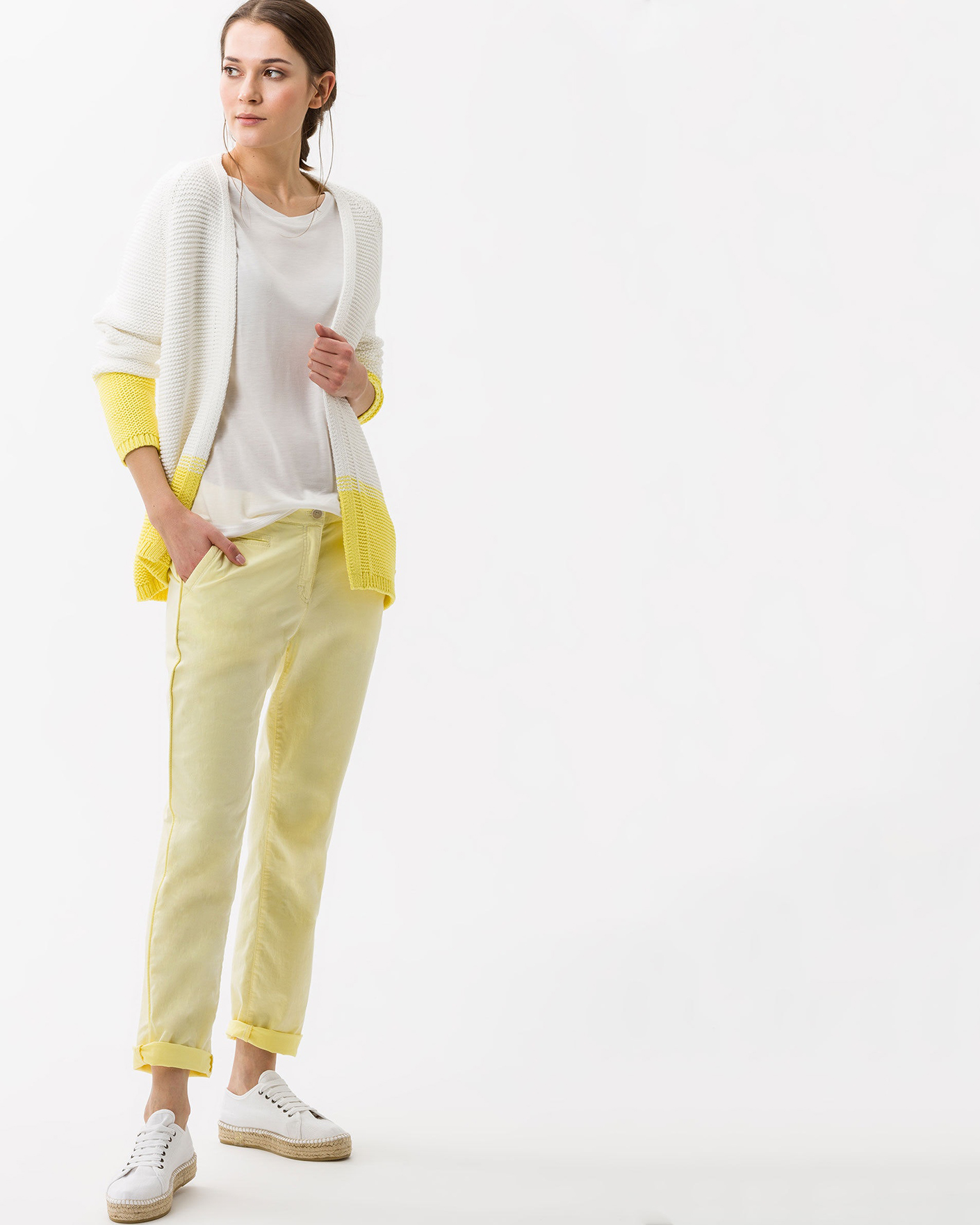 Кардиган Brax белого цвета в тонкую горизонтальную вязку. Хлопковая модель с желтой полосой на манжетах и по низу изделия. Кардиган можно сочетать с топом, футболкой, рубашкой, блузой, платьем, юбкой, брюками и джинсами.