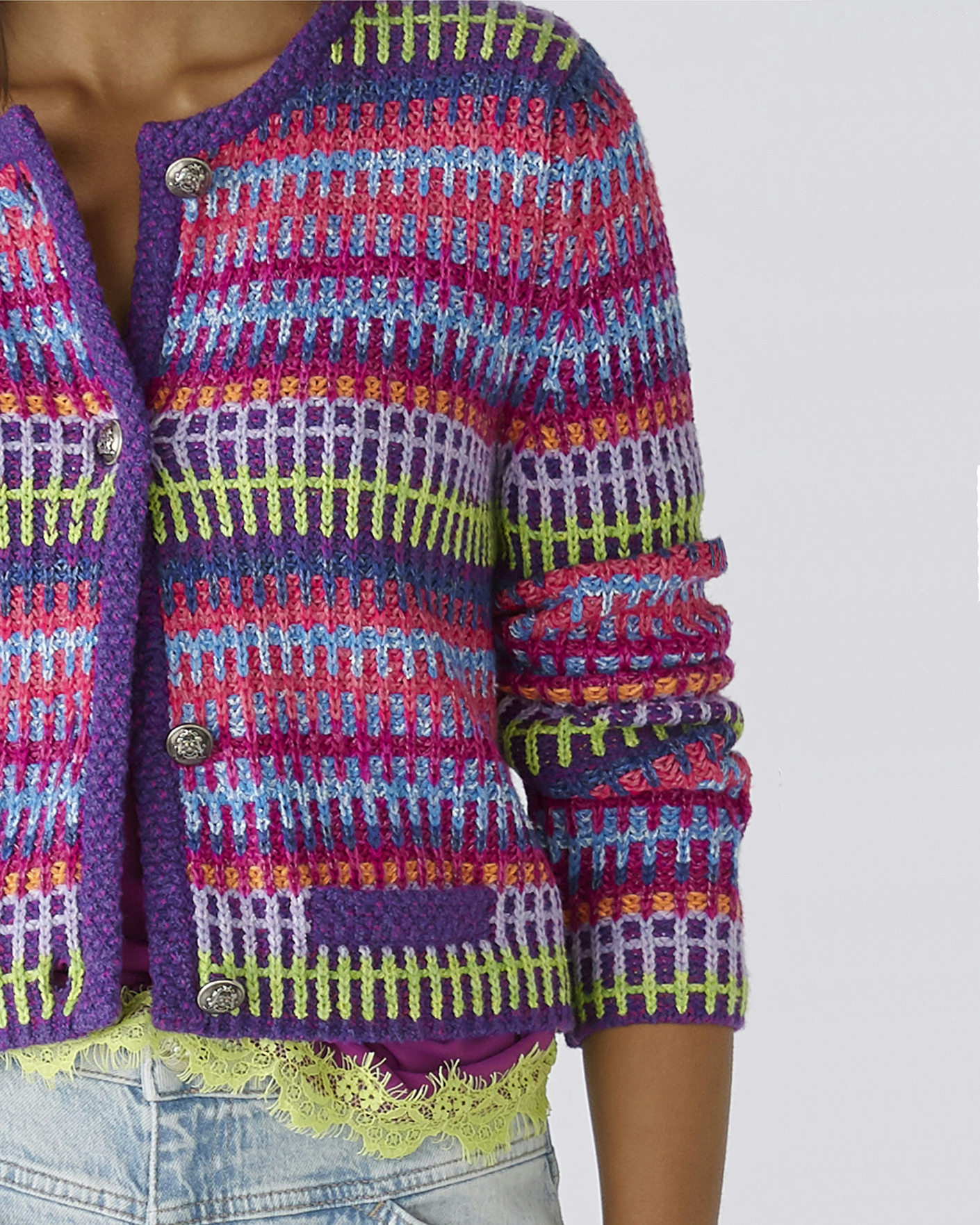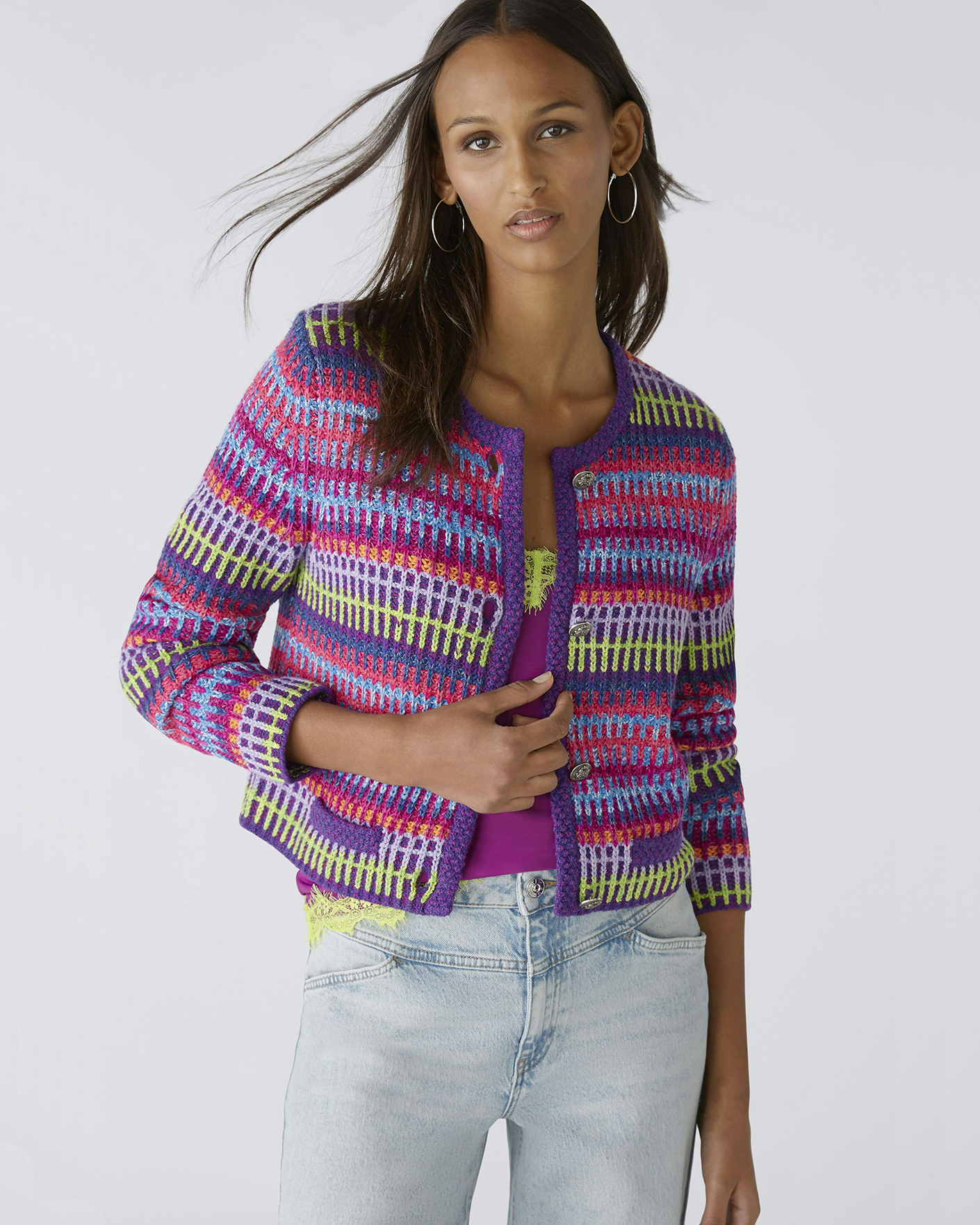 Яркий кардиган-жакет OUI розово-сиреневого цвета в геометрическую вязку. Модель с круглым вырезом, застежка на пуговицы. Кардиган-жакет станет фаворитом вашего гардероба.