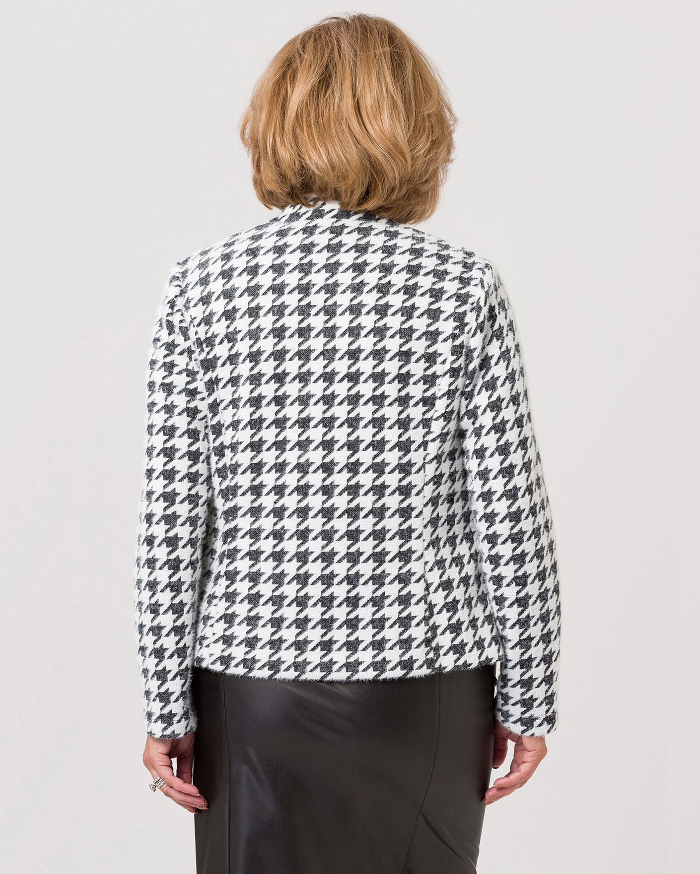 Кардиган-жакет Frank Walder бело-черного цвета в принт гусиные лапки. Укороченная модель с небольшим воротником-стойка, застежкой на молнию и накладными карманами по бокам. Кардиган-жакет станет незаменимой вещью на каждый день.