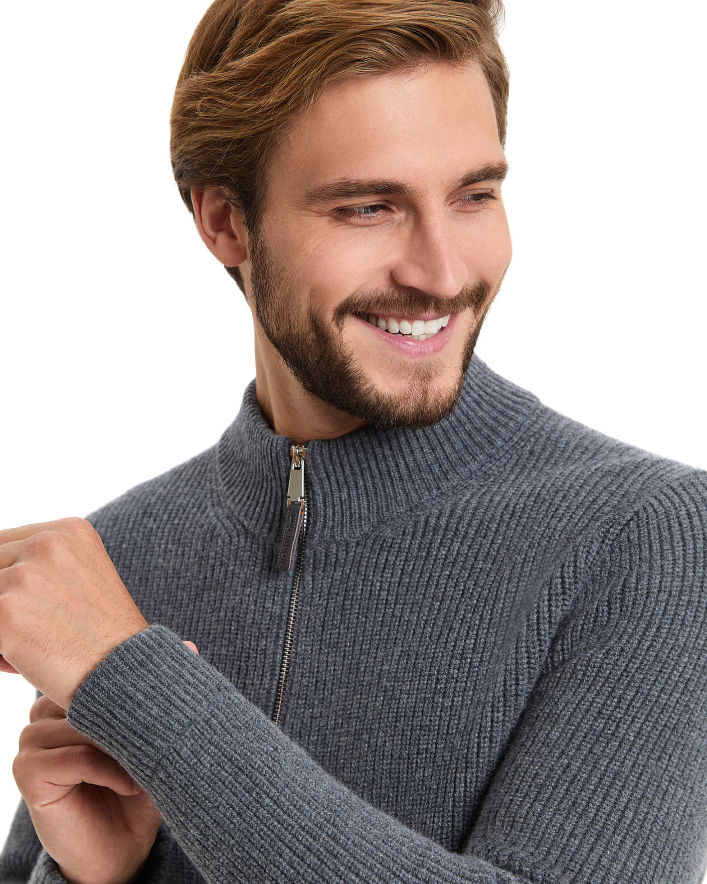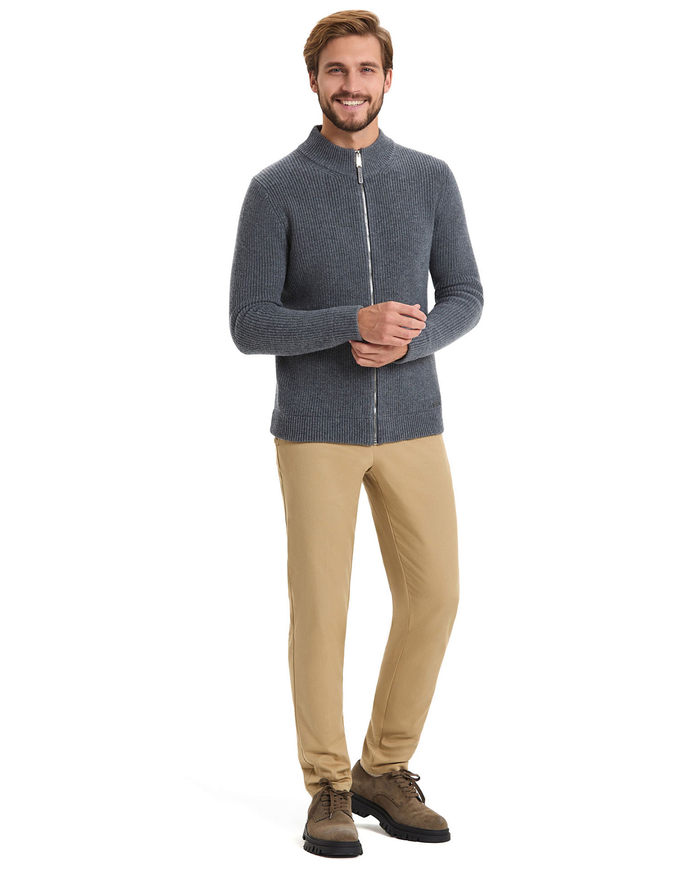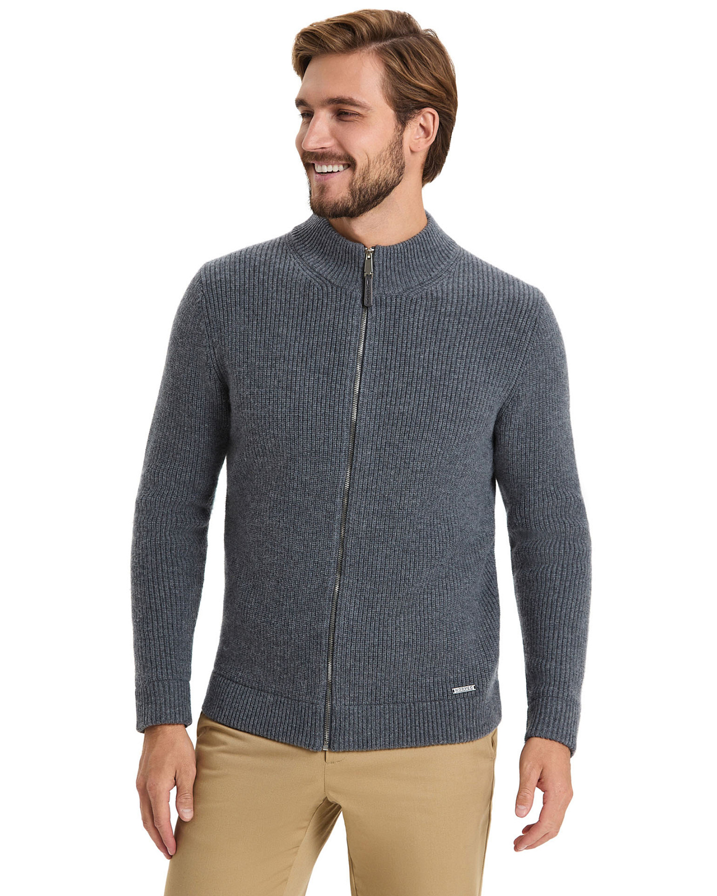 Кардиган Norveg серого цвета в вертикальную вязку резинкой. Модель из 100% шерсти с воротником-стойка и застежкой на молнию. Кардиган отличным образом вписывается в образ абсолютно любого стиля и комфорта в ношении.