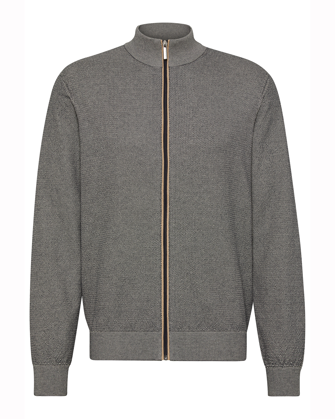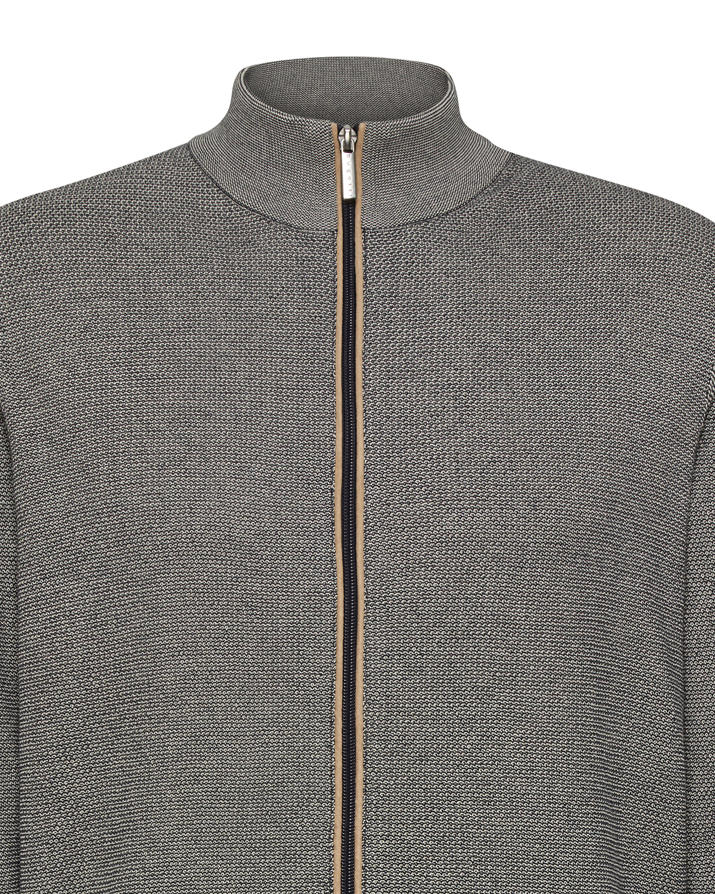 Кардиган Bugatti сине-бежевого цвета в мелкий строчный рисунок. Модель из 100% хлопка застежкой на молнию. Воротник-стойка, манжеты и низ на резинке. Кардиган отлично впишется в повседневный гардероб.