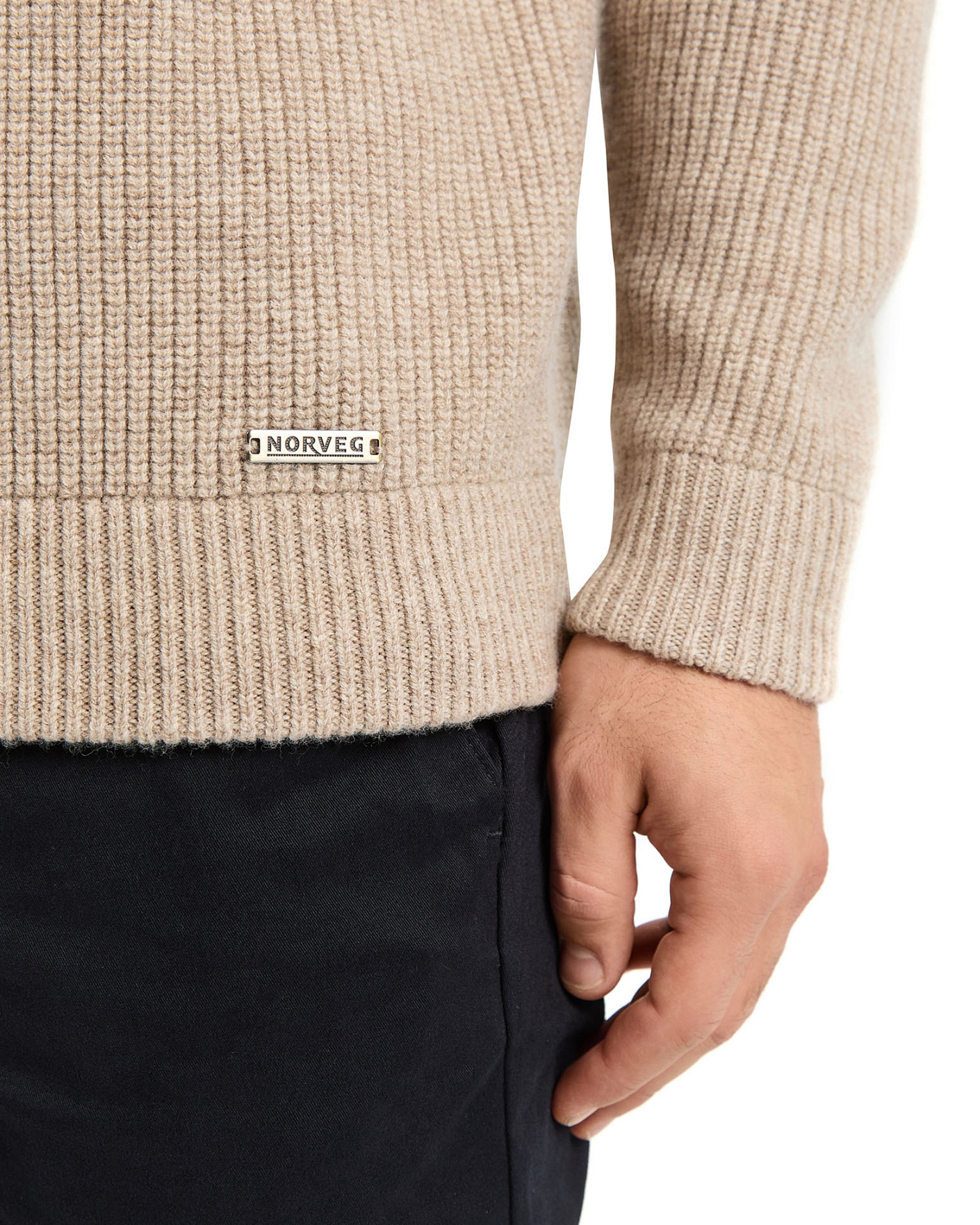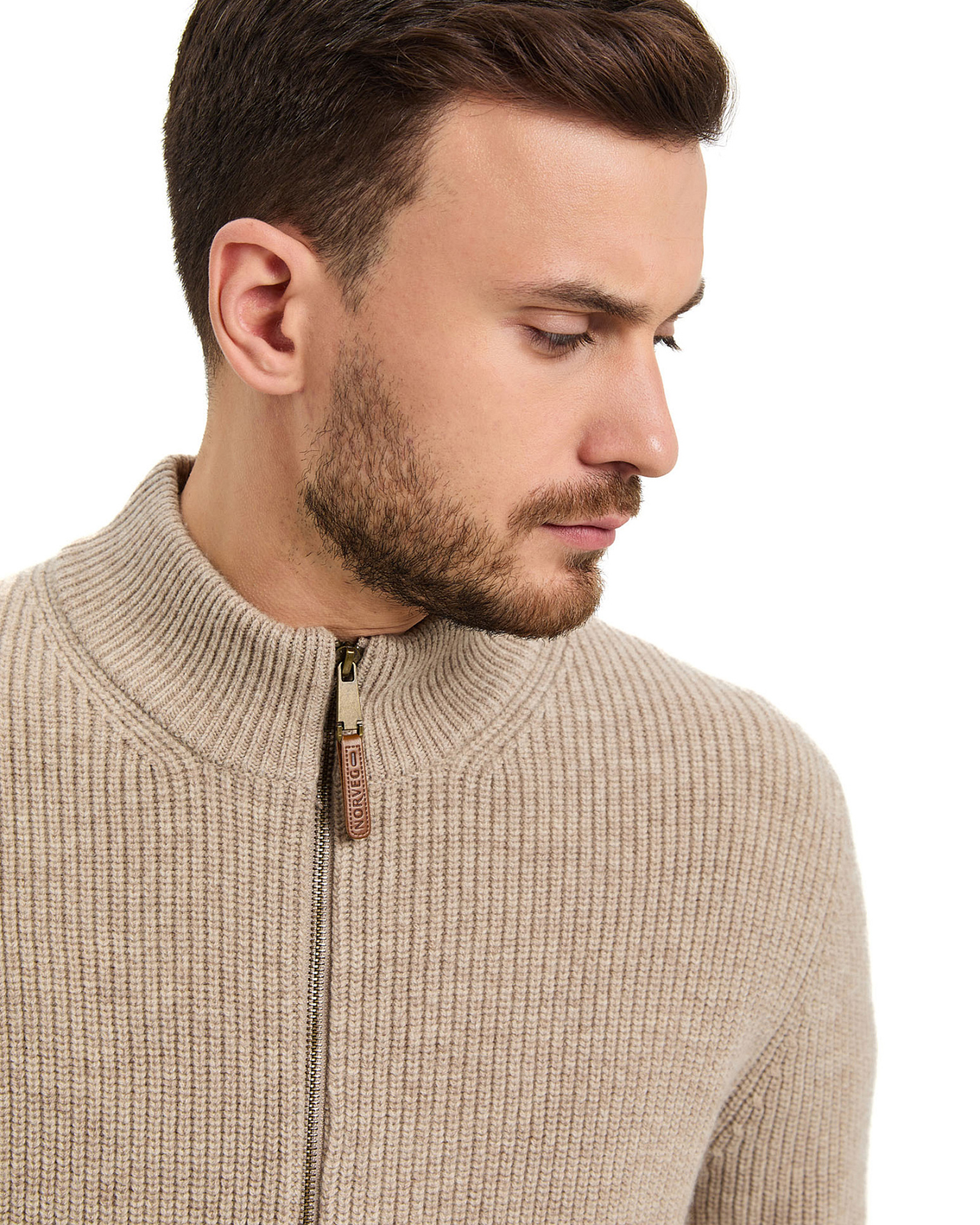 Кардиган Norveg бежевого цвета в вертикальную вязку резинкой. Модель из 100% шерсти с воротником-стойка и застежкой на молнию. Кардиган отличным образом вписывается в образ абсолютно любого стиля и комфорта в ношении.