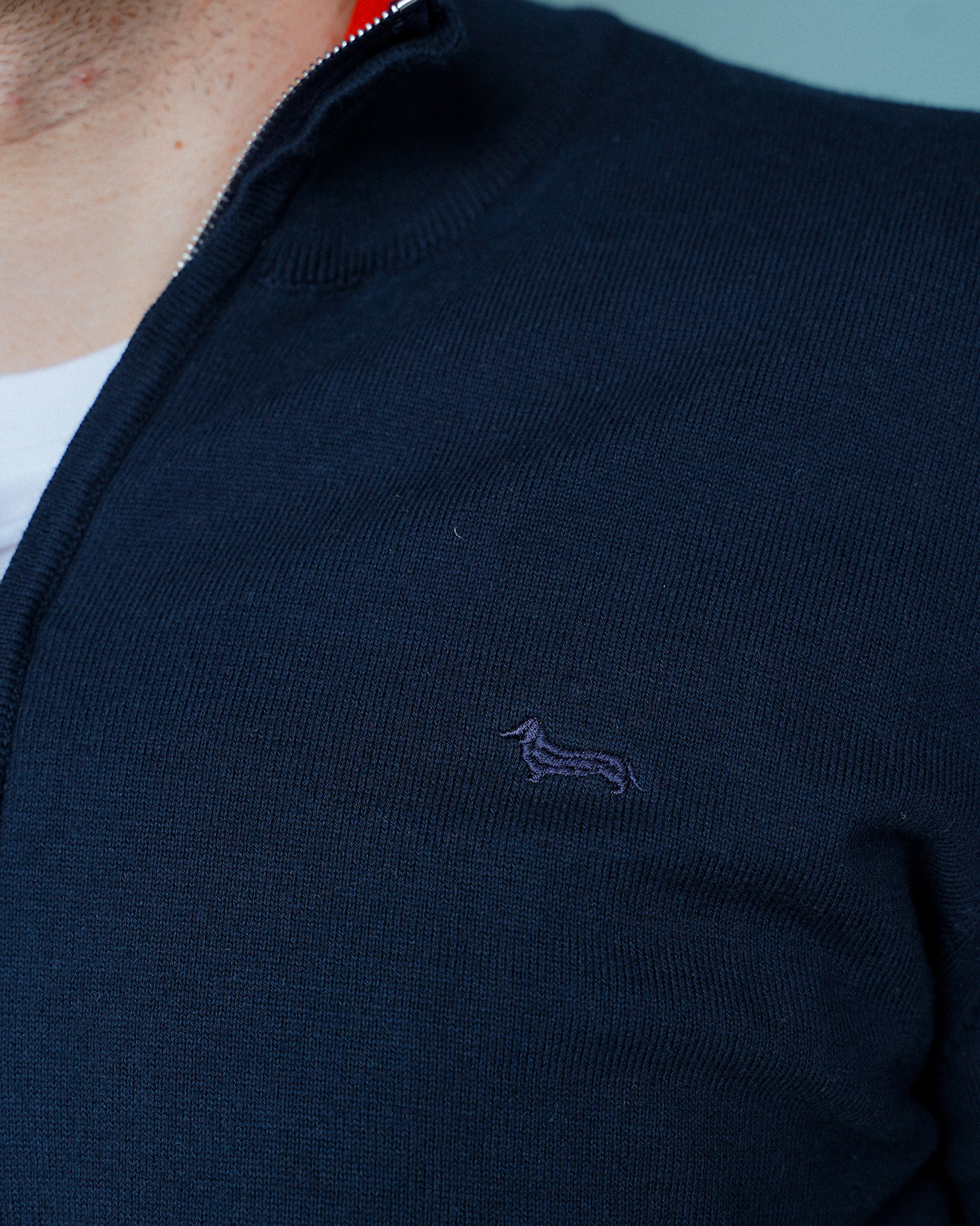 Кардиган Harmont&Blaine темно-синего цвета в строчный рисунок. Модель с воротником-стойка, застежка на молнию. Кардиган - универсальная вещь на каждый день.
