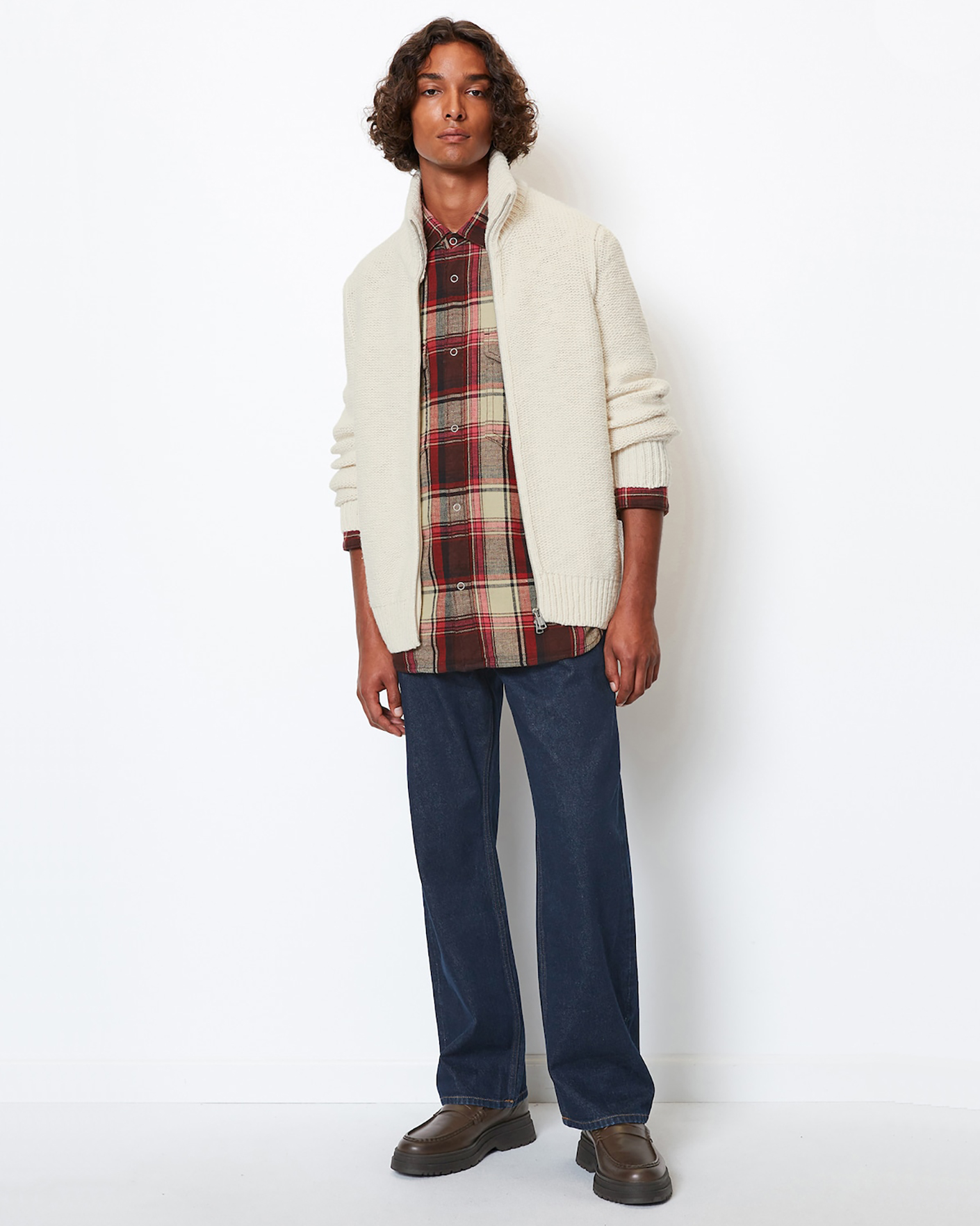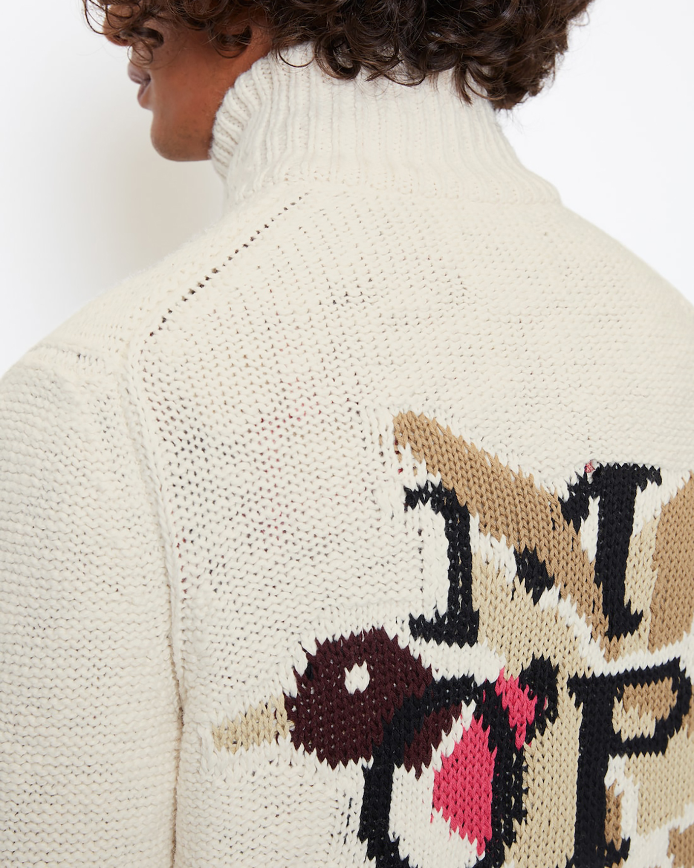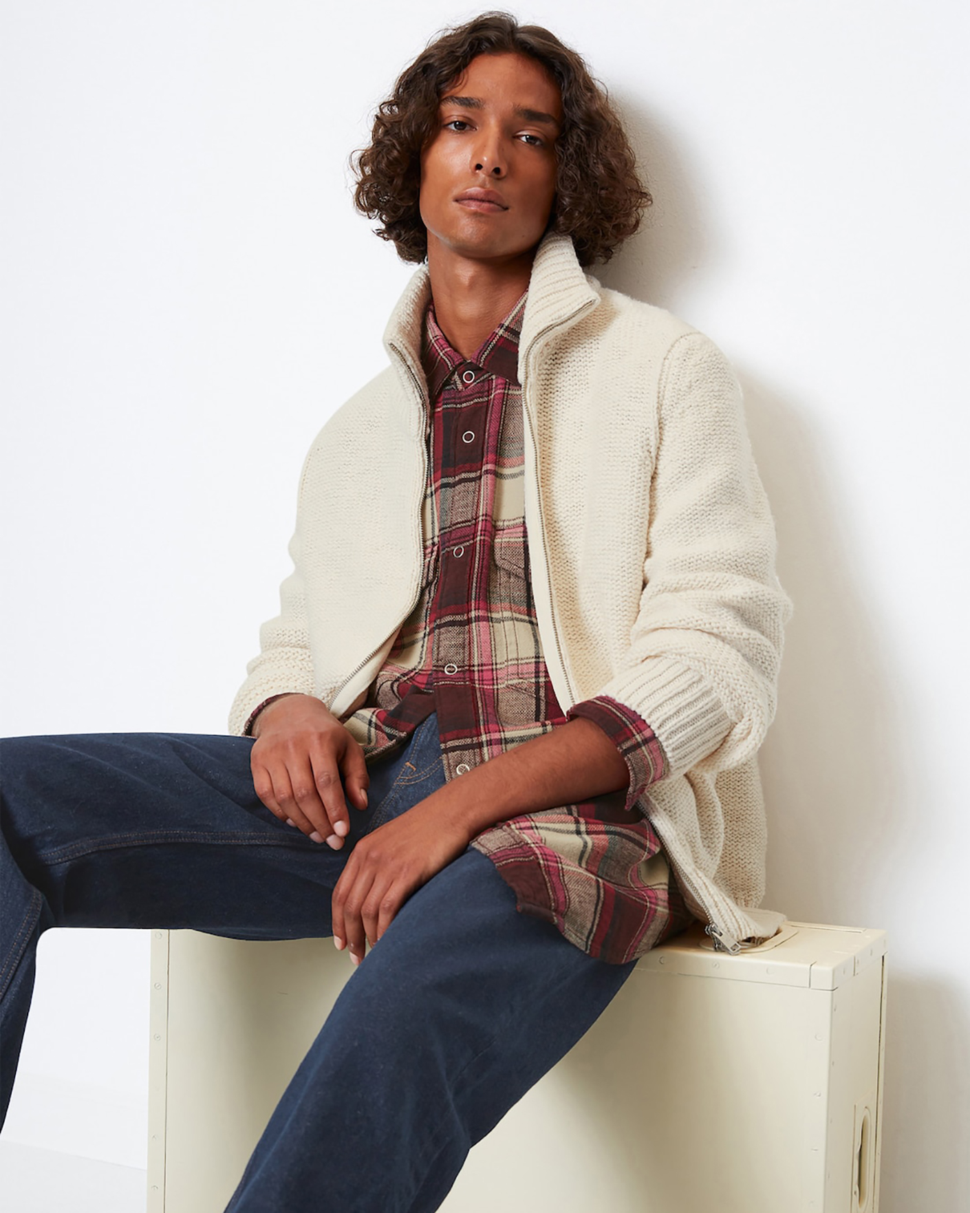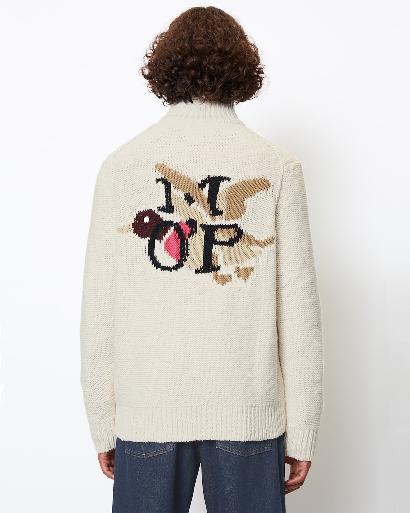 Вязаный кардиган Marc O'Polo светло-бежевого цвета. Хлопковая модель с добавлением шерсти с воротнкиом-стойка, манжетам и низом на вывязанной резинке. Имеется крупная вышивка логотипа с птицей на спинке. Застежка на молнию. Кардиган станет фаворитом повседневного гардероба.