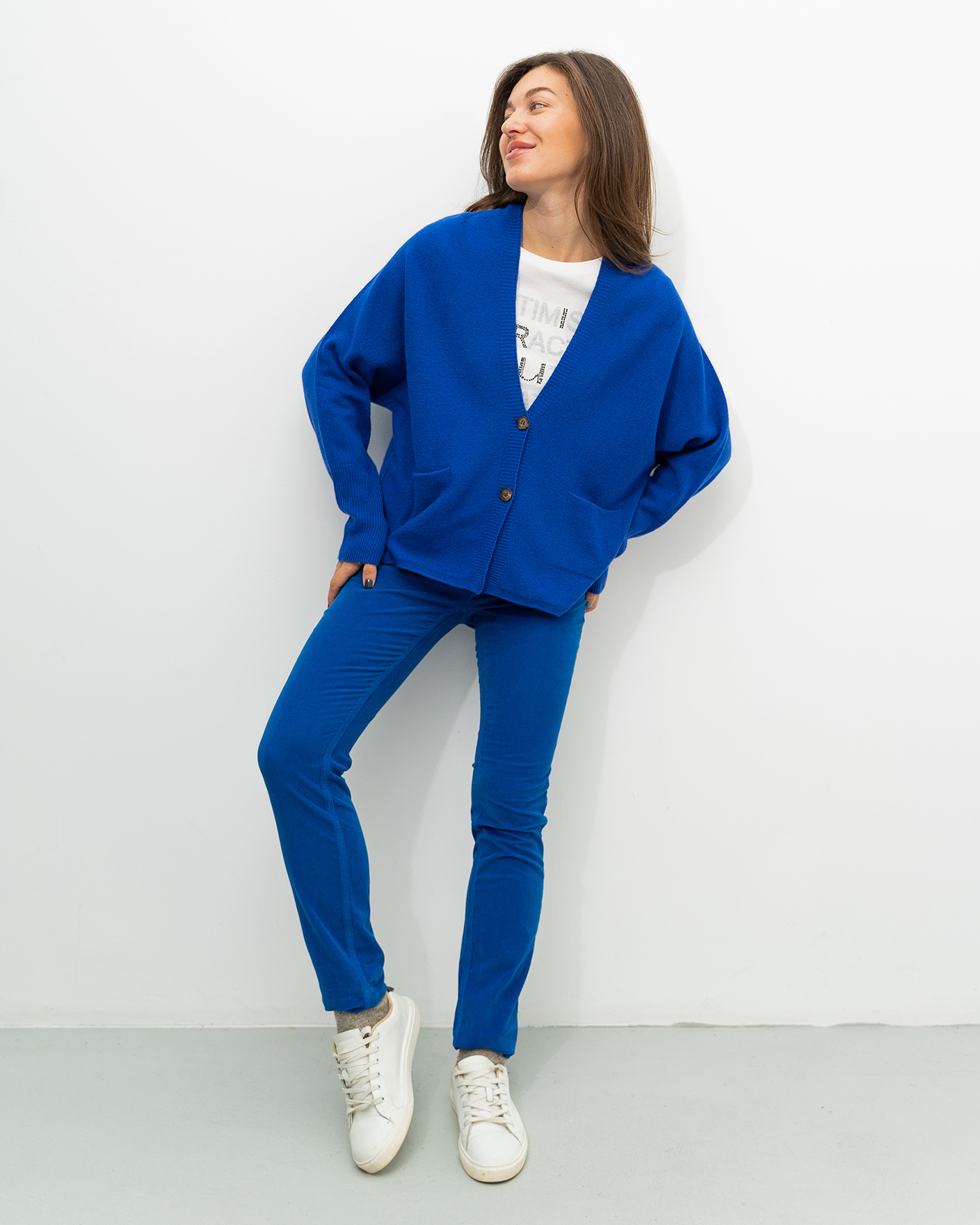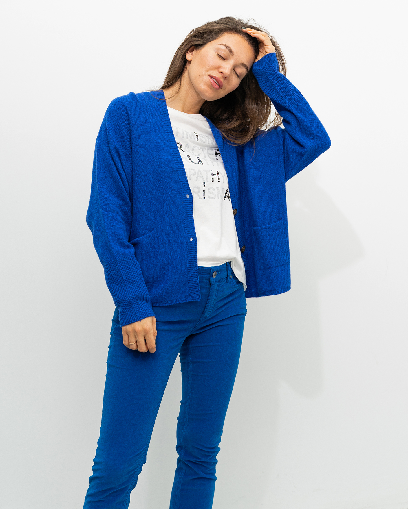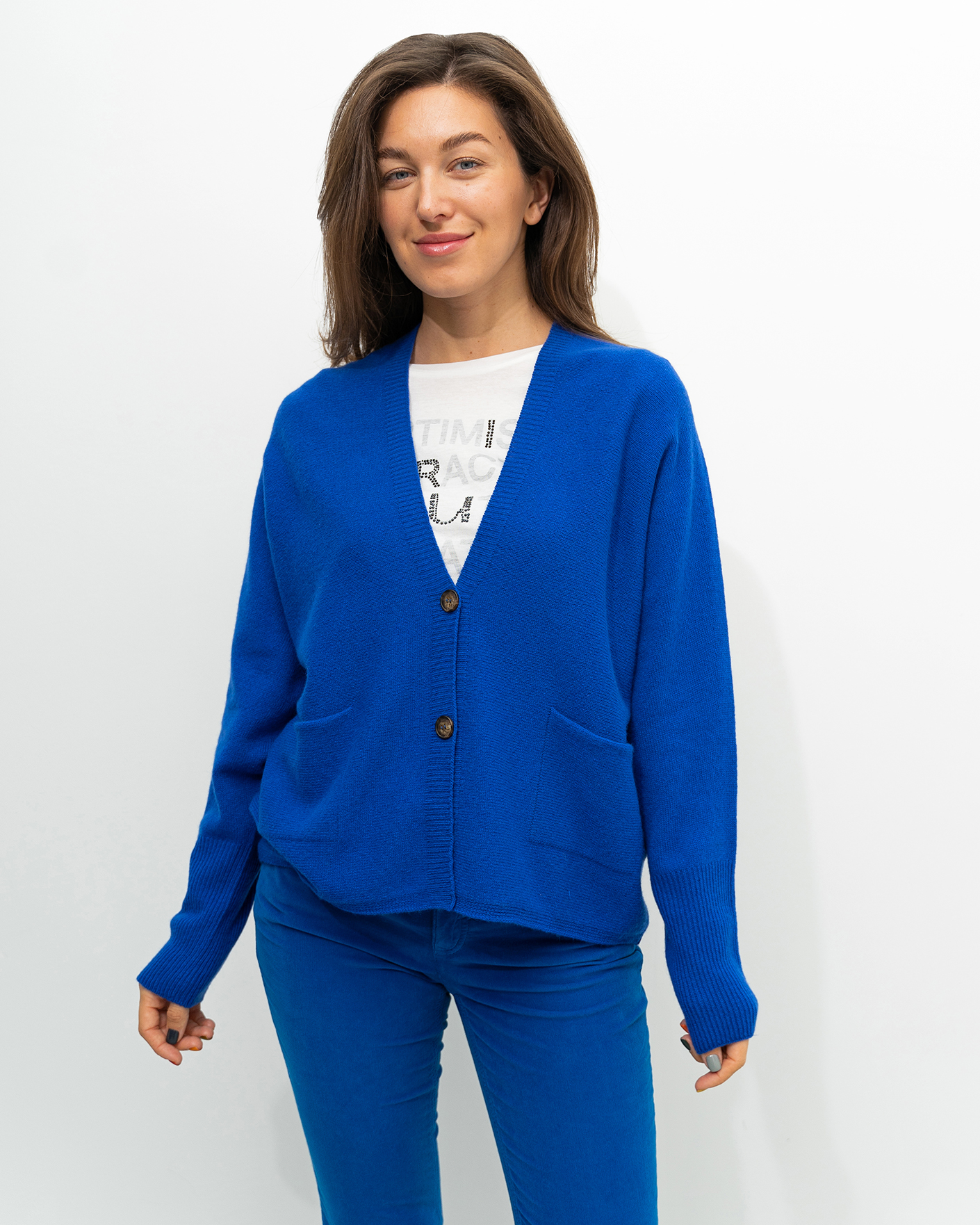Свободный кардиган OUI синего цвета в тонкую горизонтальную структуру. Модель с V-образным вырезом и планкой на контрастные пуговицы. Широкие манжеты на тонкой резинке. Имеются накладные карманы по бокам. Кардиган можно сочетать с футболкой, рубашкой, блузой, тонкой водолазкой, юбкой и брюками.