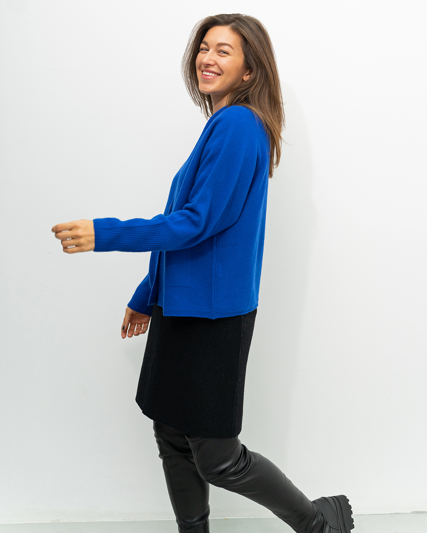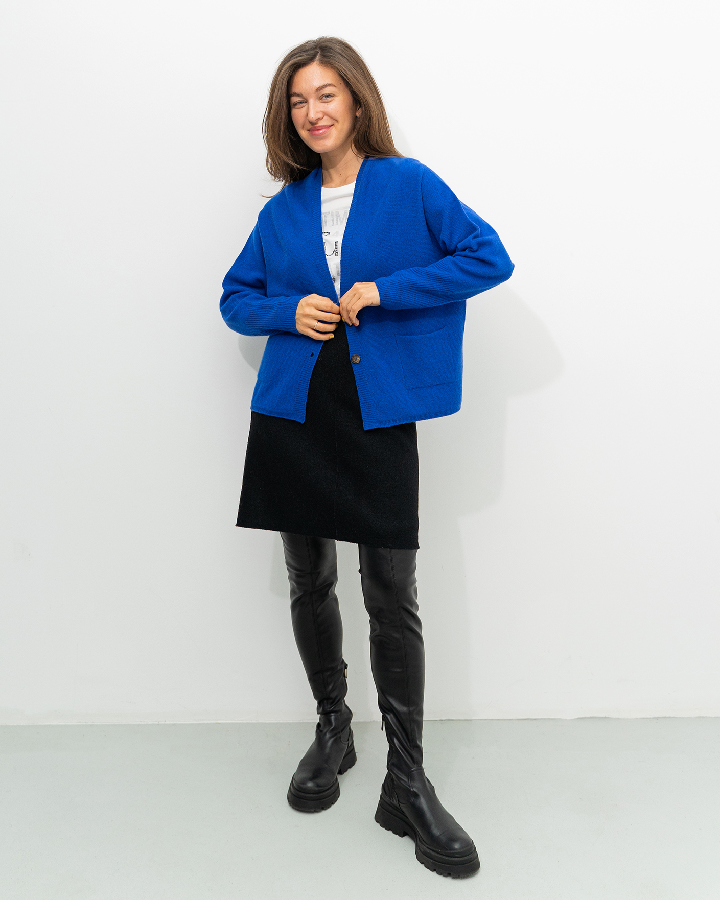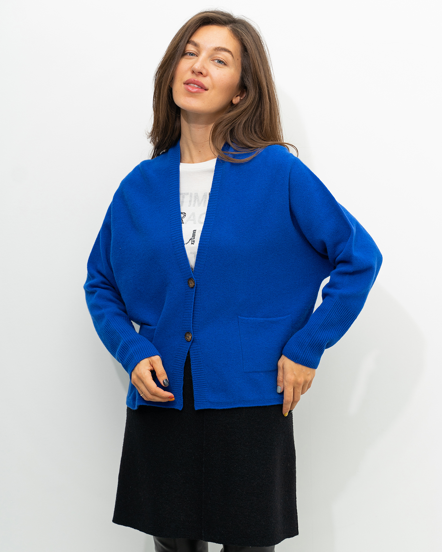 Свободный кардиган OUI синего цвета в тонкую горизонтальную структуру. Модель с V-образным вырезом и планкой на контрастные пуговицы. Широкие манжеты на тонкой резинке. Имеются накладные карманы по бокам. Кардиган можно сочетать с футболкой, рубашкой, блузой, тонкой водолазкой, юбкой и брюками.