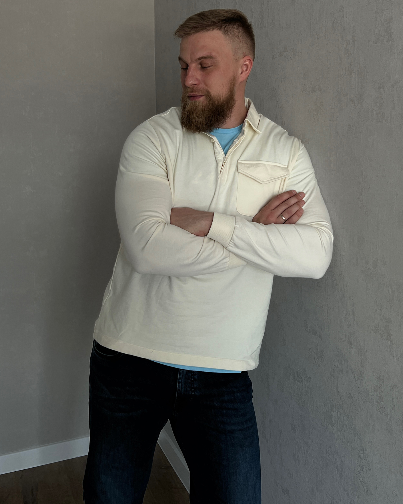Толстовка Pierre Cardin кремового цвета в строчный рисунок. Модель из 100% хлопка с отложным воротником и планкой на скрытые три пуговицы. Имеется накладной карман с клапаном на груди. Манжеты на тонкой резинке. Толстовка отлично впишется в ваш повседневный гардероб.