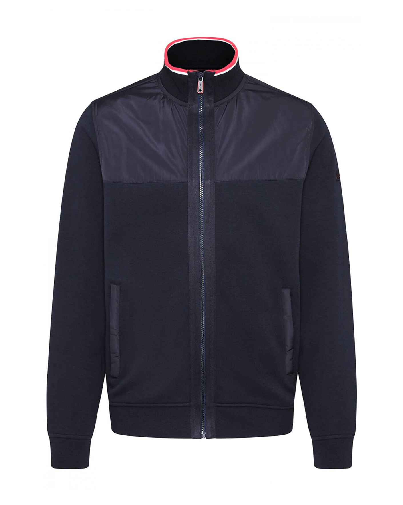 Толстовка Bugatti темно-синего цвета. Хлопковая модель выполнена из комбинированных тканей. Воротник-стойка на ребристой резинке с яркой полосой по краю, застежка и боковые карманы на молнию. Манжеты и низ на резинке. Толстовка отлично впишется в ваш верхний гардероб.