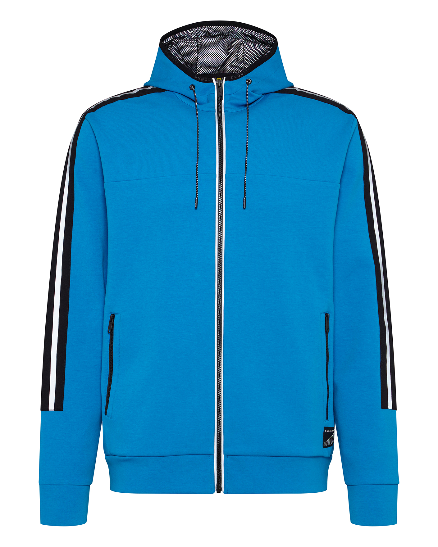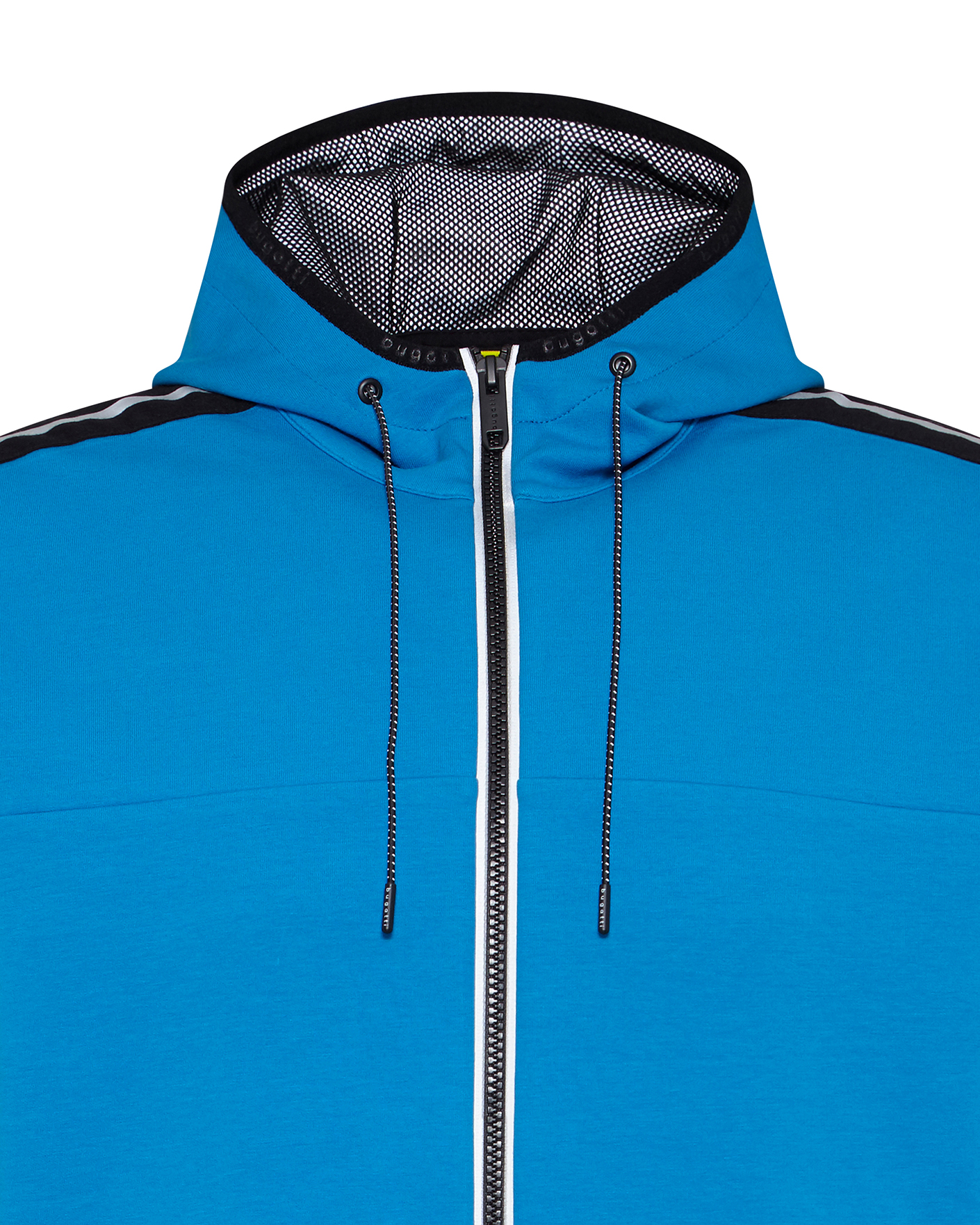 Яркая толстовка Bugatti голубого цвета с контрастными лампасами на рукавах. Хлопковая модель с воротником-стойка, регулируемым капюшоном, застежка и боковые карманы на молнии. Толстовка отлично впишется в ваш гардероб.