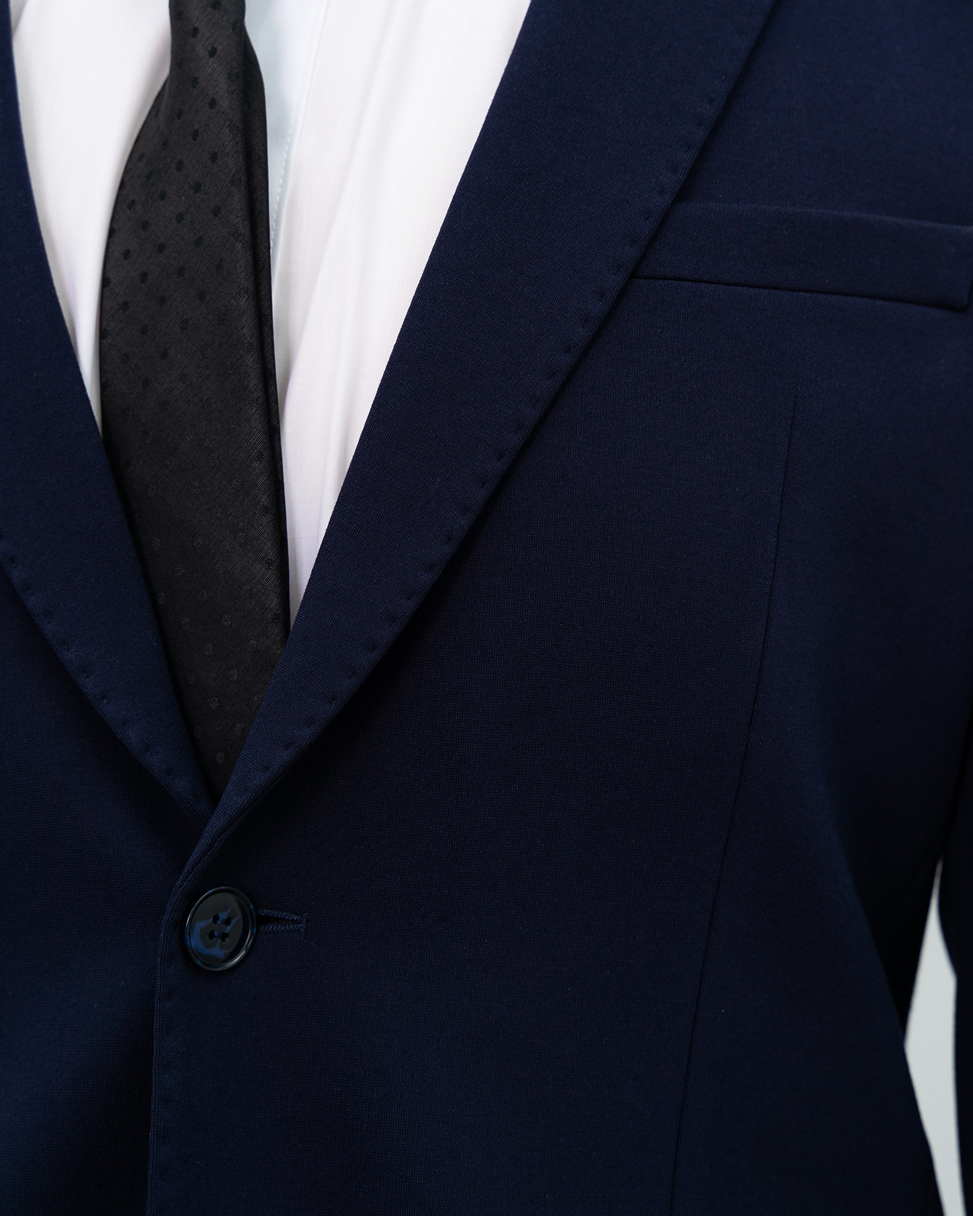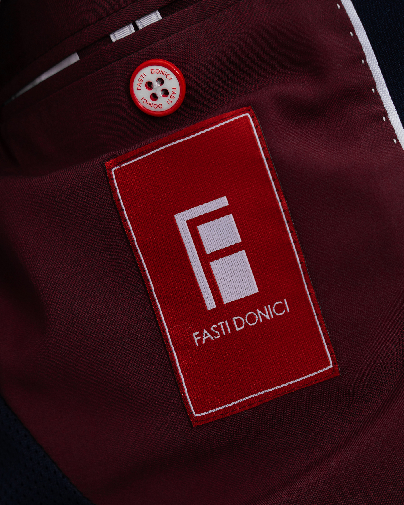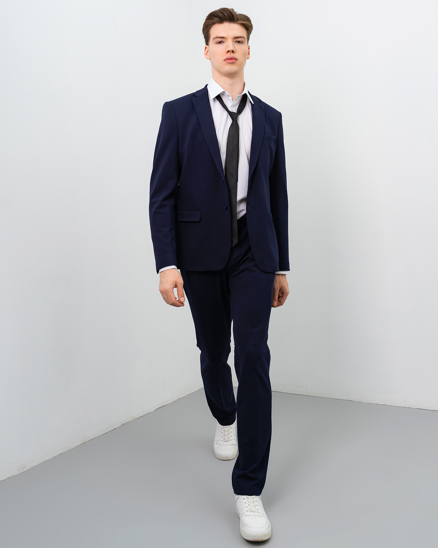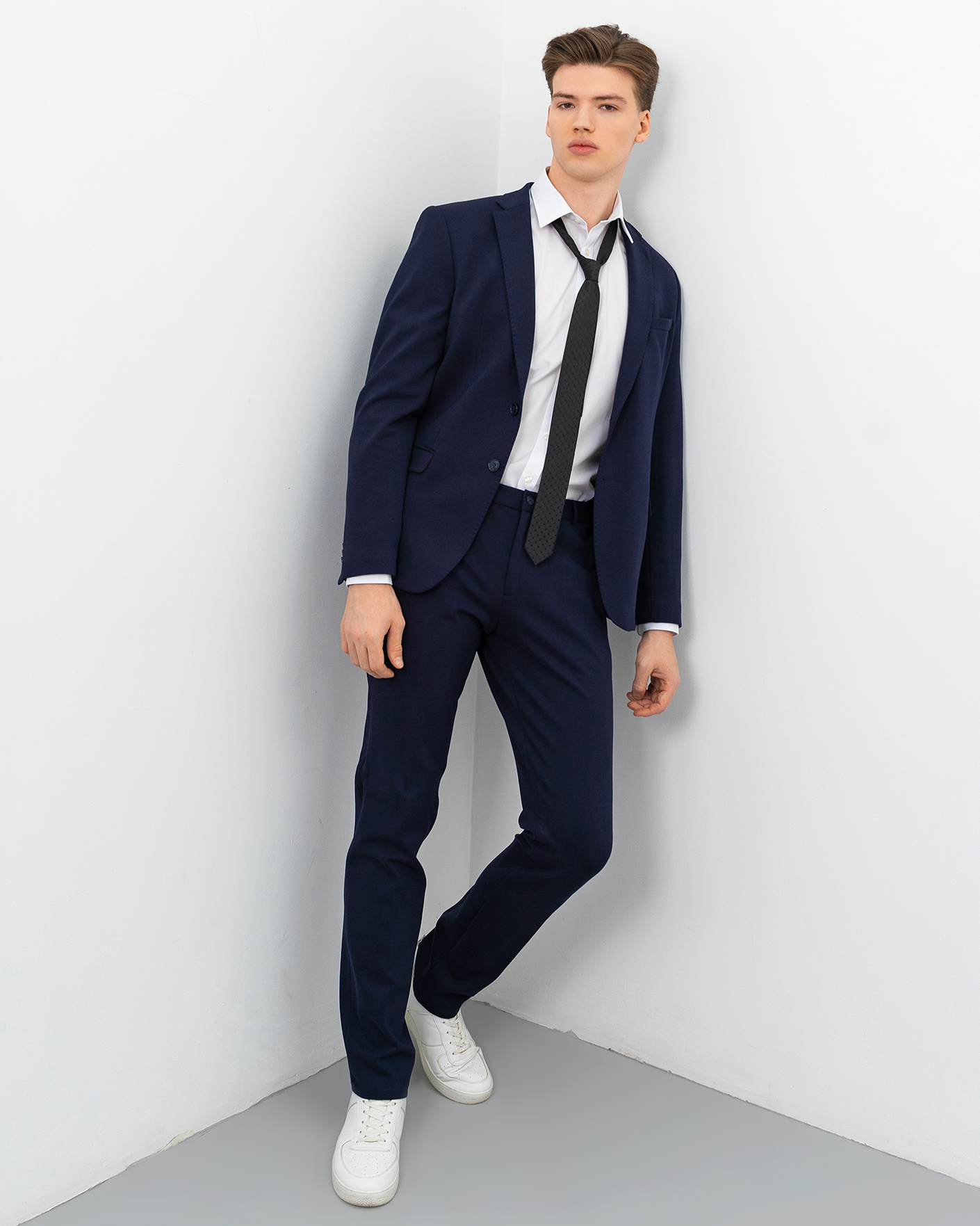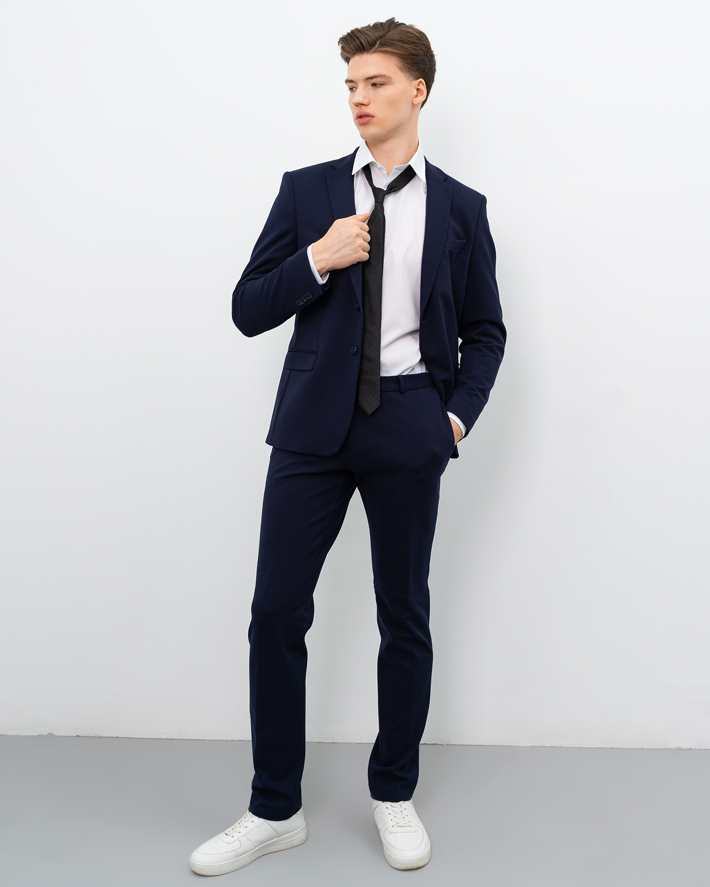 Костюм Fasti Donici темно-синего цвета. Пиджак с лацканами, застежка на пуговицы в тон, врезные карманы с клапанами по бокам, а также декоративная строчка в тон по краю. Брюки-джоггеры на стандартной застежке, врезные карманы по бокам.