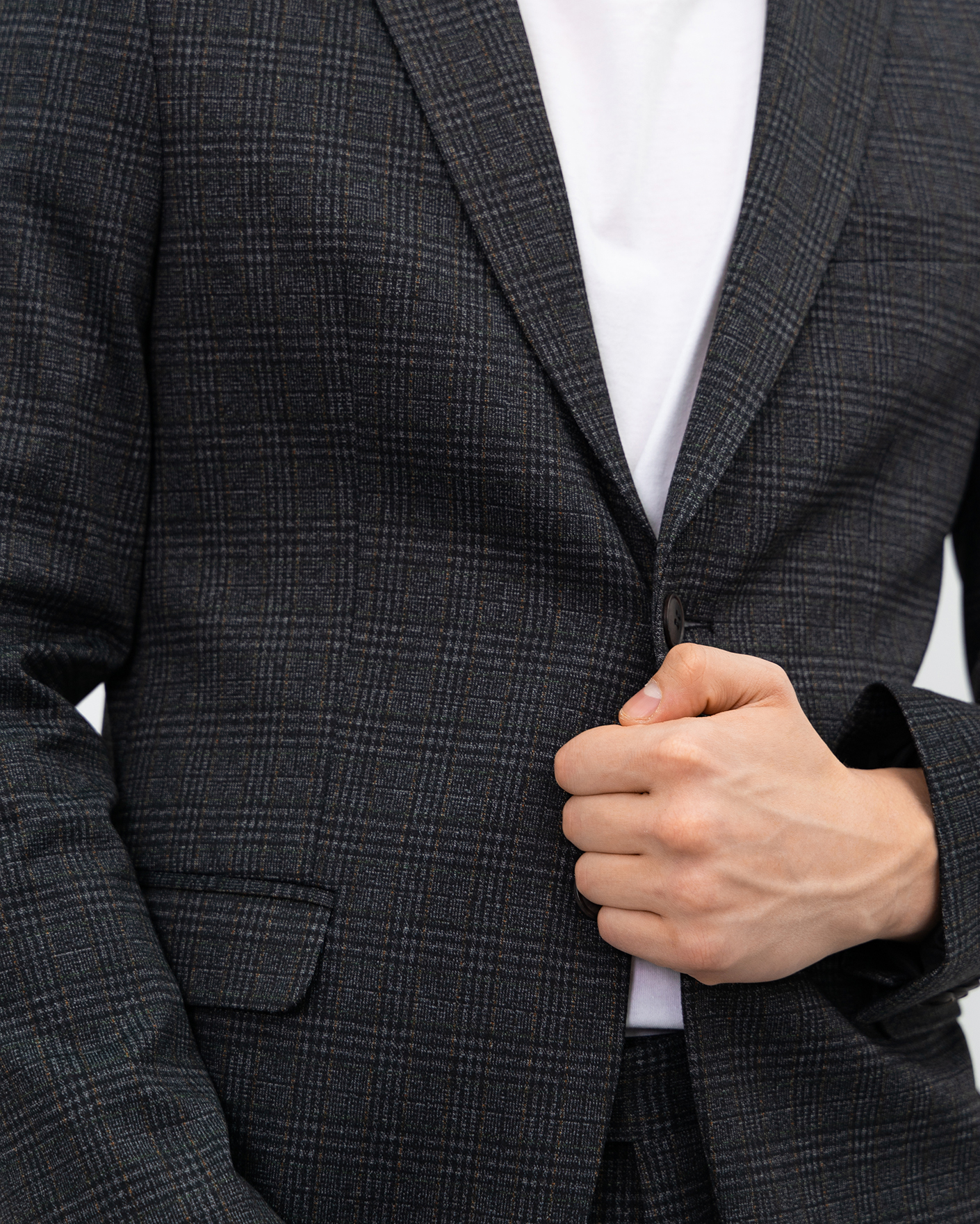 Костюм Fasti Donici коричнево-серого цвета с строчный рисунок и крупную клетку. Пиджак с лацканами, застежка на пуговицы в тон, врезные карманы с клапанами по бокам. Костюм можно сочетать с футболкой, рубашкой, поло, джемпером.
