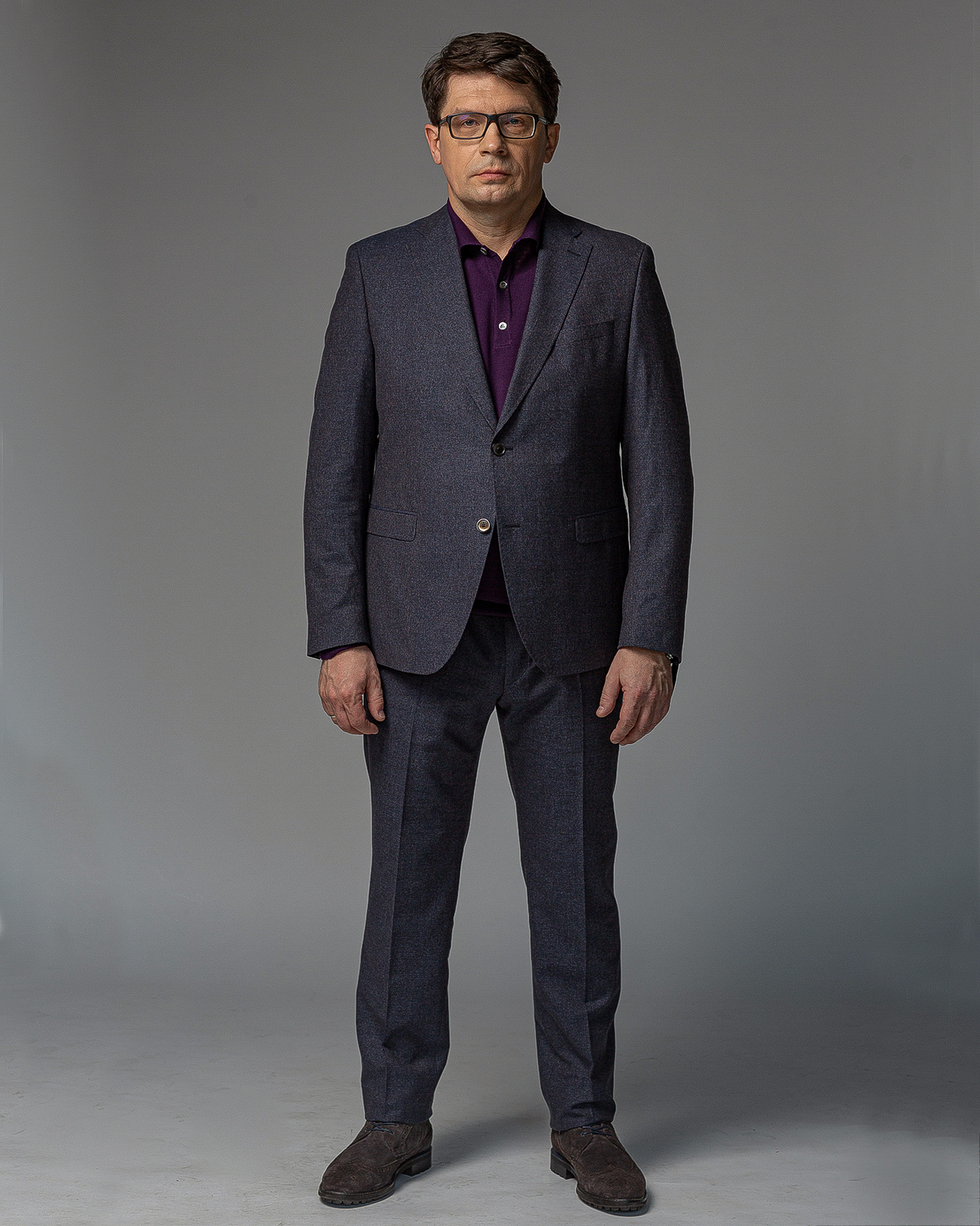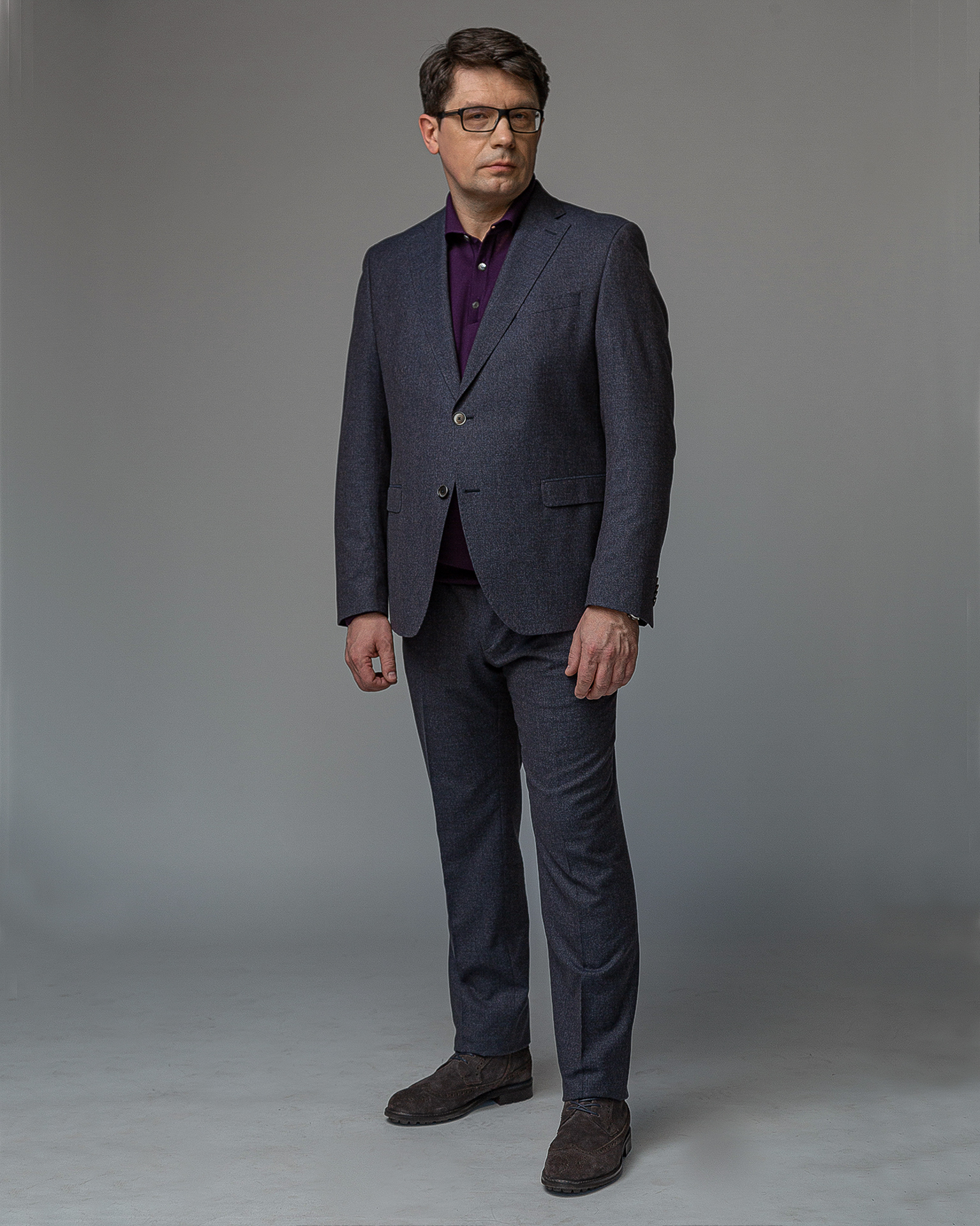 Классический костюм Digel сине-бордового цвета в тонкую клетчатую структуру. Однобортный пиджак с застежкой на пуговицы, имеются два боковых кармана с клапанами и один нагрудный под платок. Брюки с базовой застежкой отлично сочетаются с любым верхом, как рубашкой и пиджаком, так и водоалазкой или свитером.