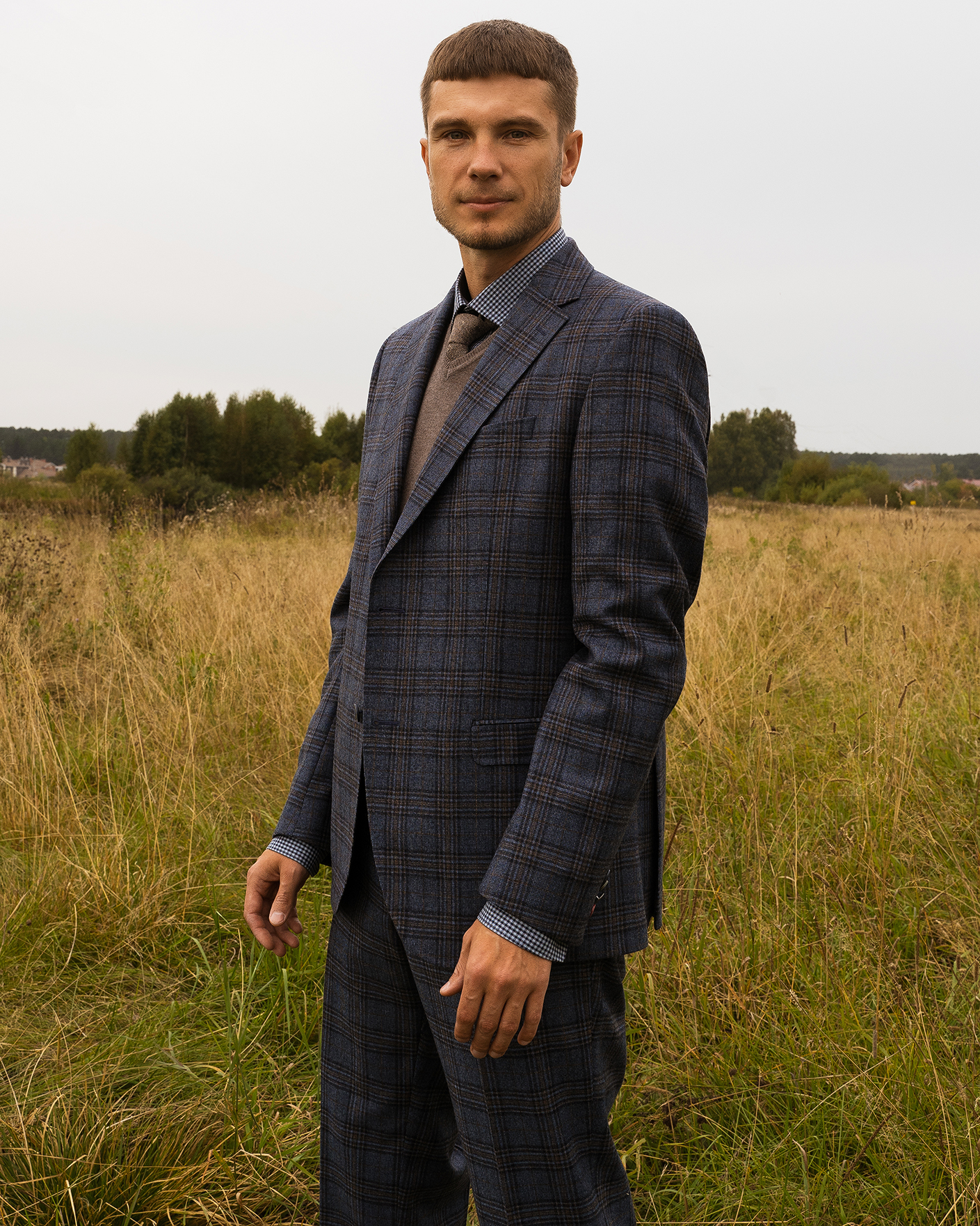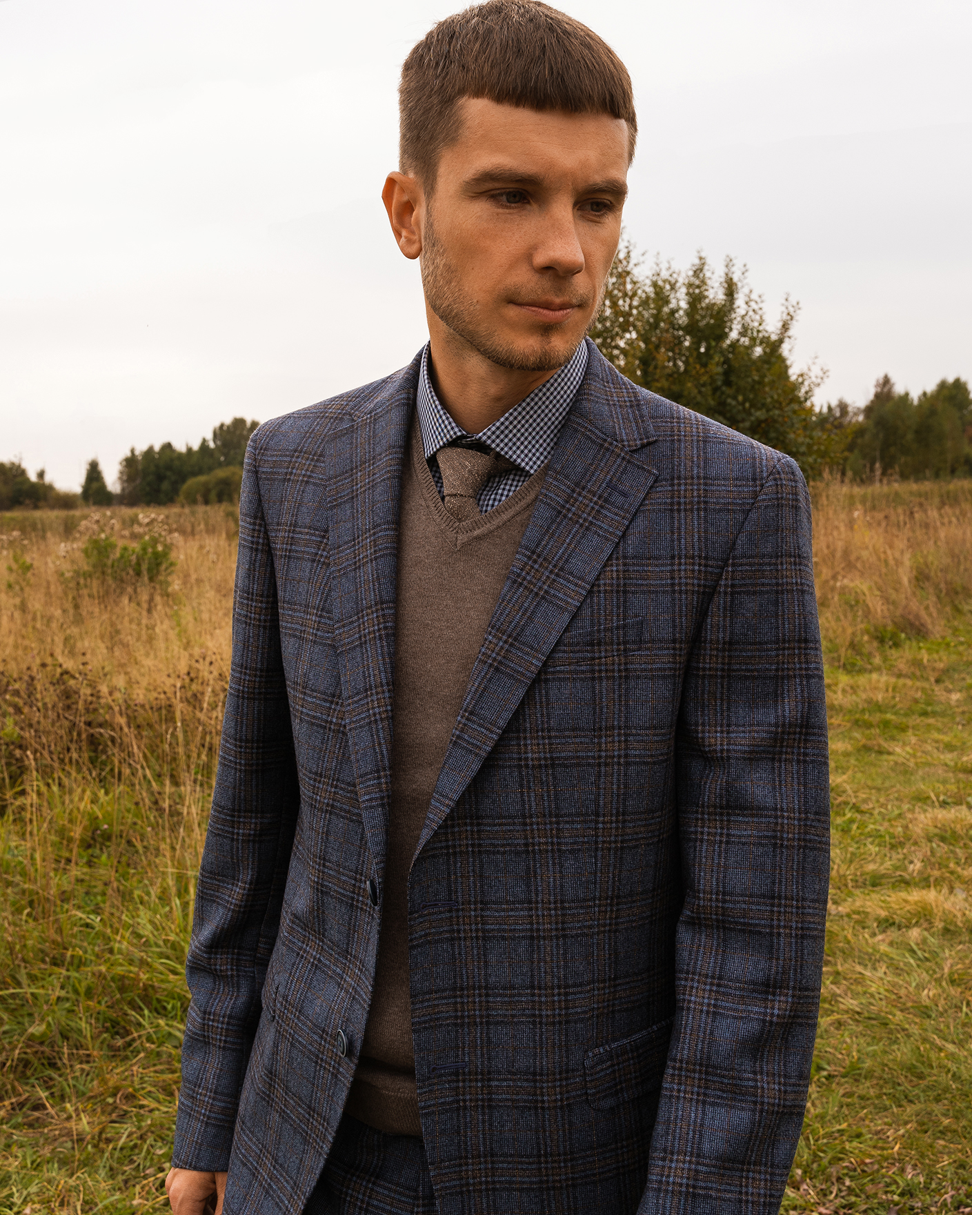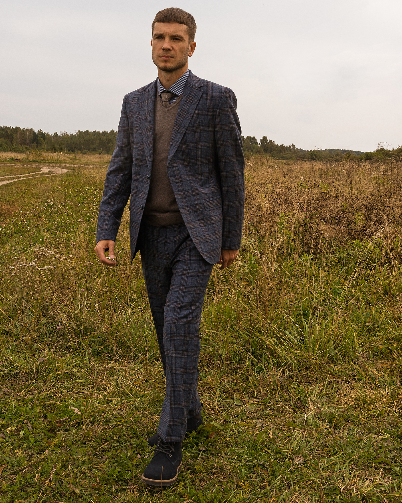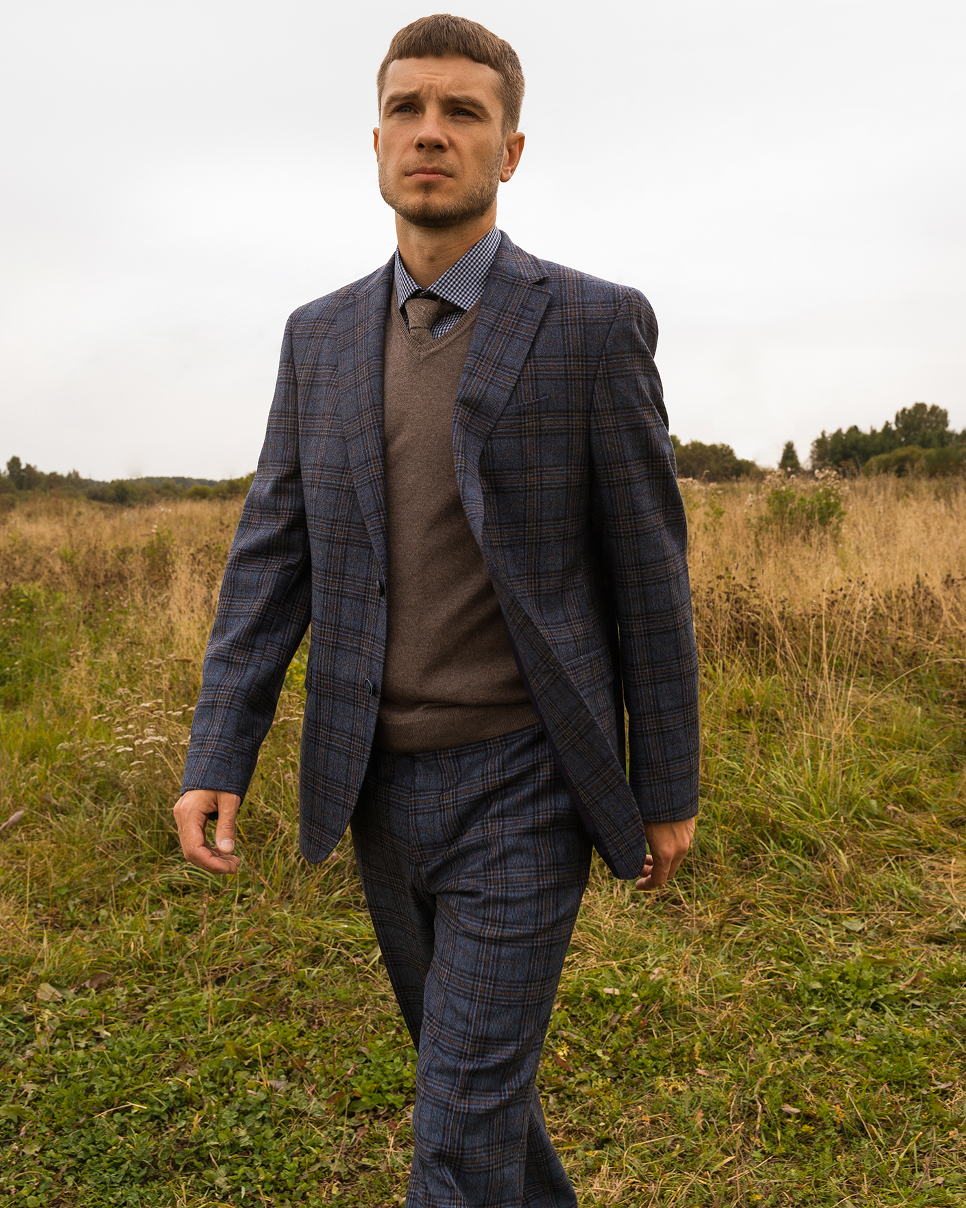 Костюм Digel серо-голубого цвета в крупную клетку. Модель из 100% шерсти. Пиджак с лацканами, застежкой на две пуговицы, имеются врезные карманы с клапанами по бокам и один на груди. Классические брюки со стрелками и базовой застежкой. Костюм можно сочетать с рубашкой, жилетом.