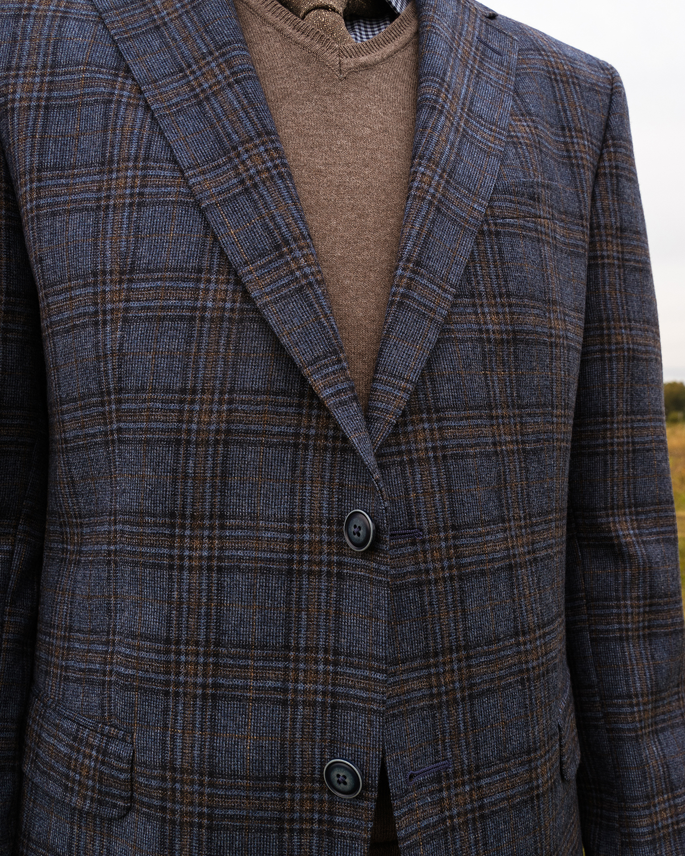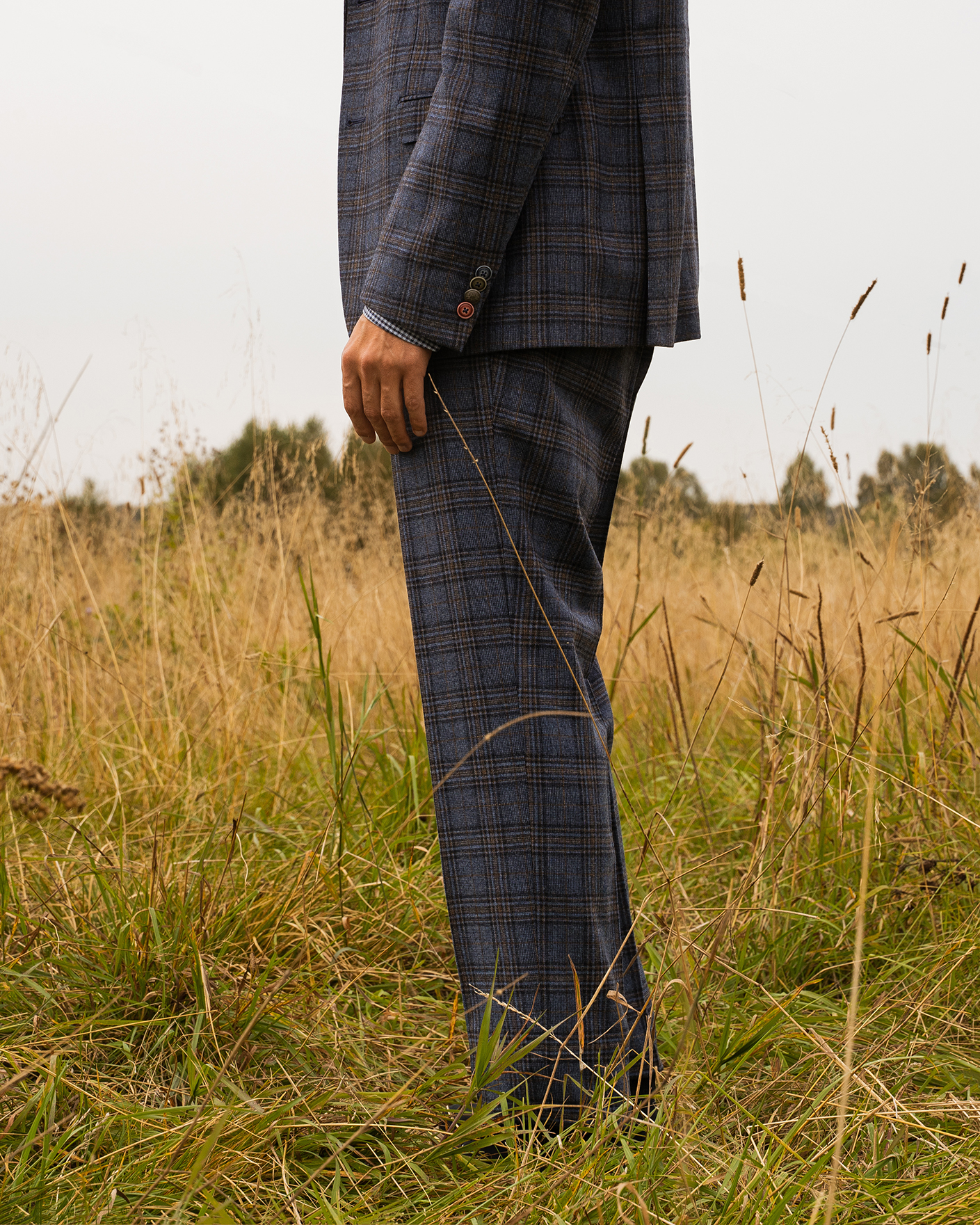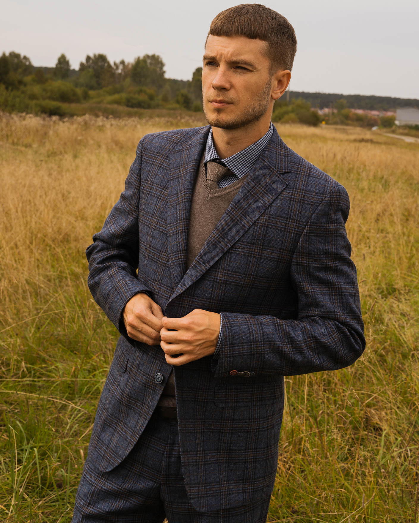 Костюм Digel серо-голубого цвета в крупную клетку. Модель из 100% шерсти. Пиджак с лацканами, застежкой на две пуговицы, имеются врезные карманы с клапанами по бокам и один на груди. Классические брюки со стрелками и базовой застежкой. Костюм можно сочетать с рубашкой, жилетом.