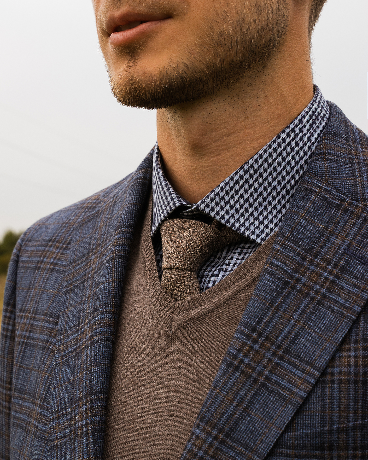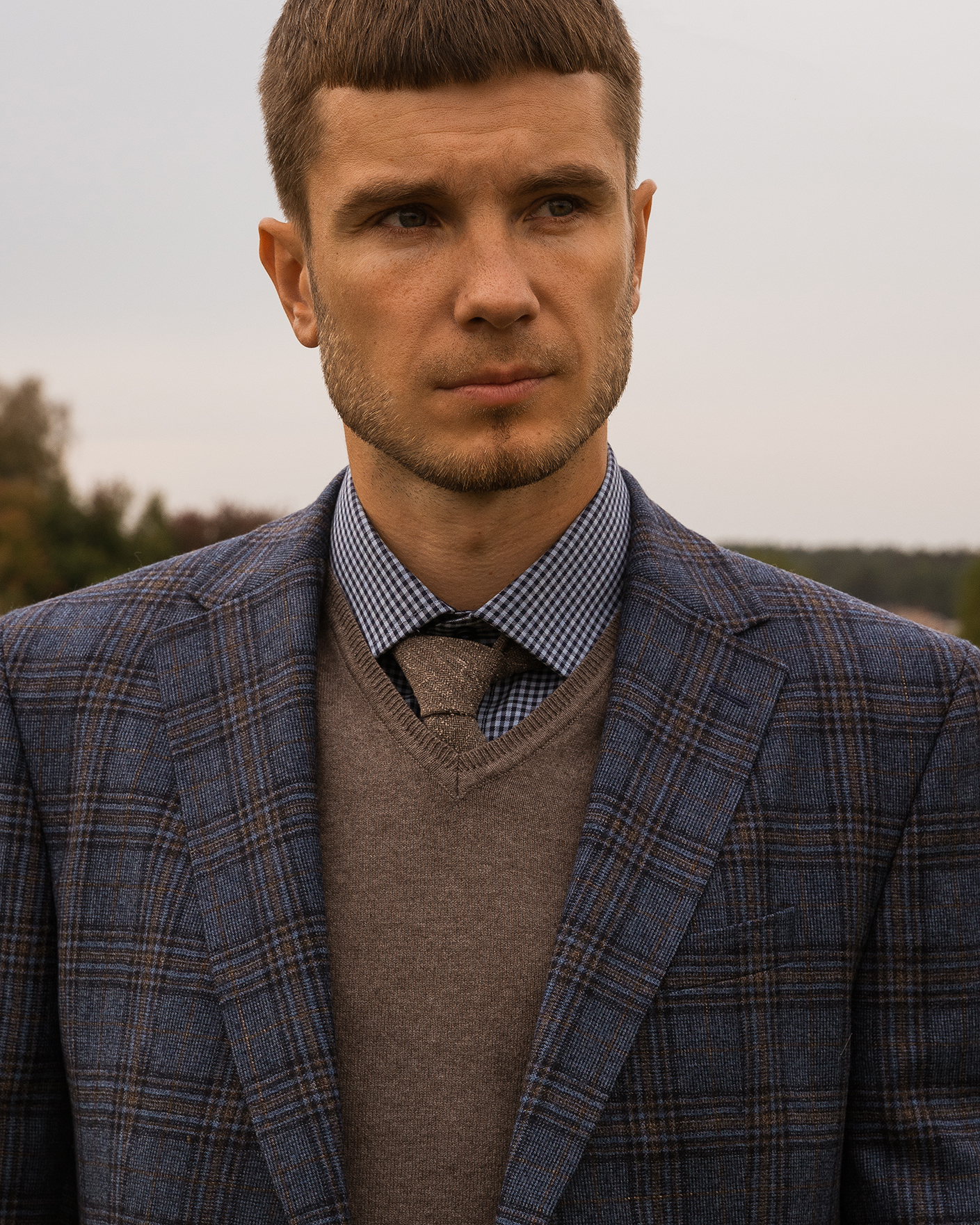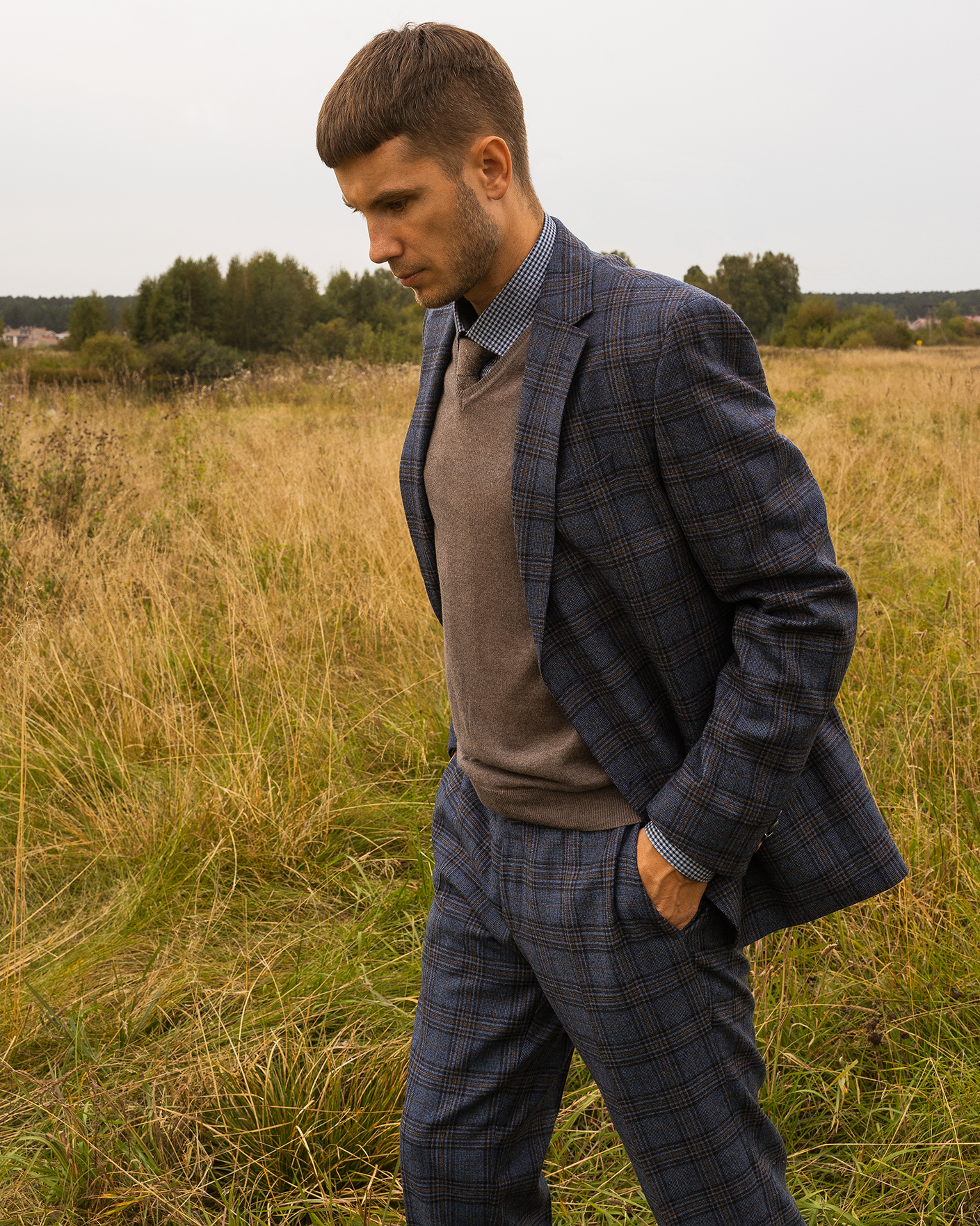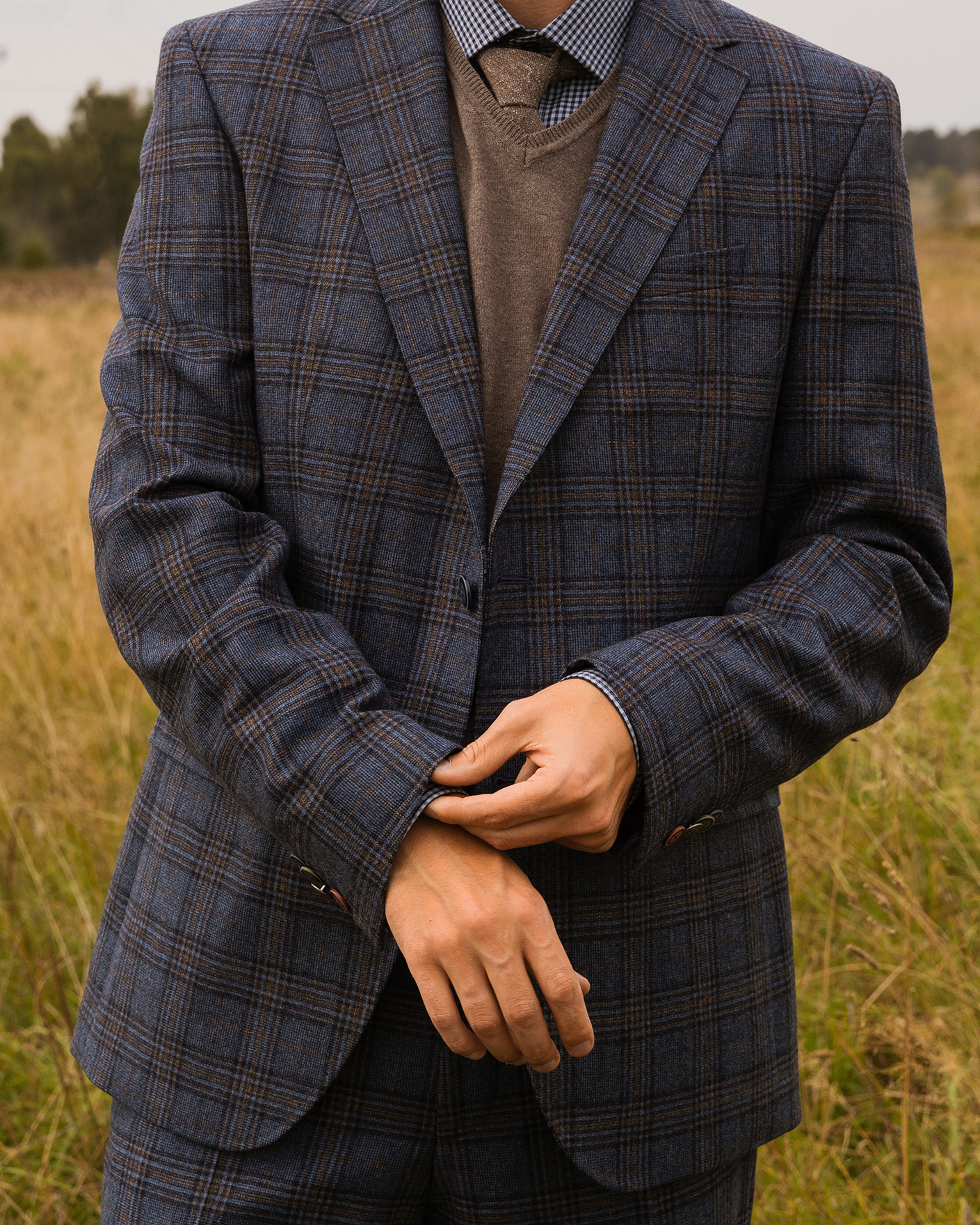 Костюм Digel серо-голубого цвета в крупную клетку. Модель из 100% шерсти. Пиджак с лацканами, застежкой на две пуговицы, имеются врезные карманы с клапанами по бокам и один на груди. Классические брюки со стрелками и базовой застежкой. Костюм можно сочетать с рубашкой, жилетом.
