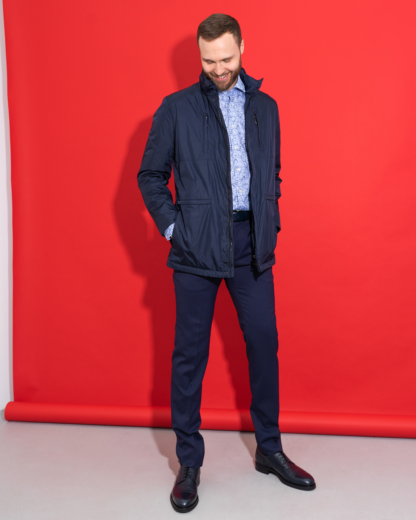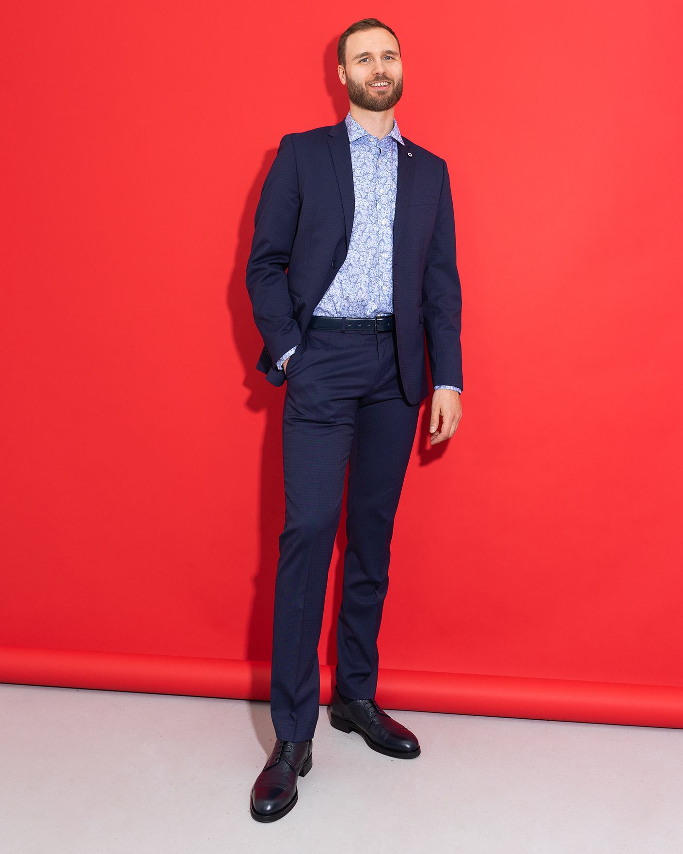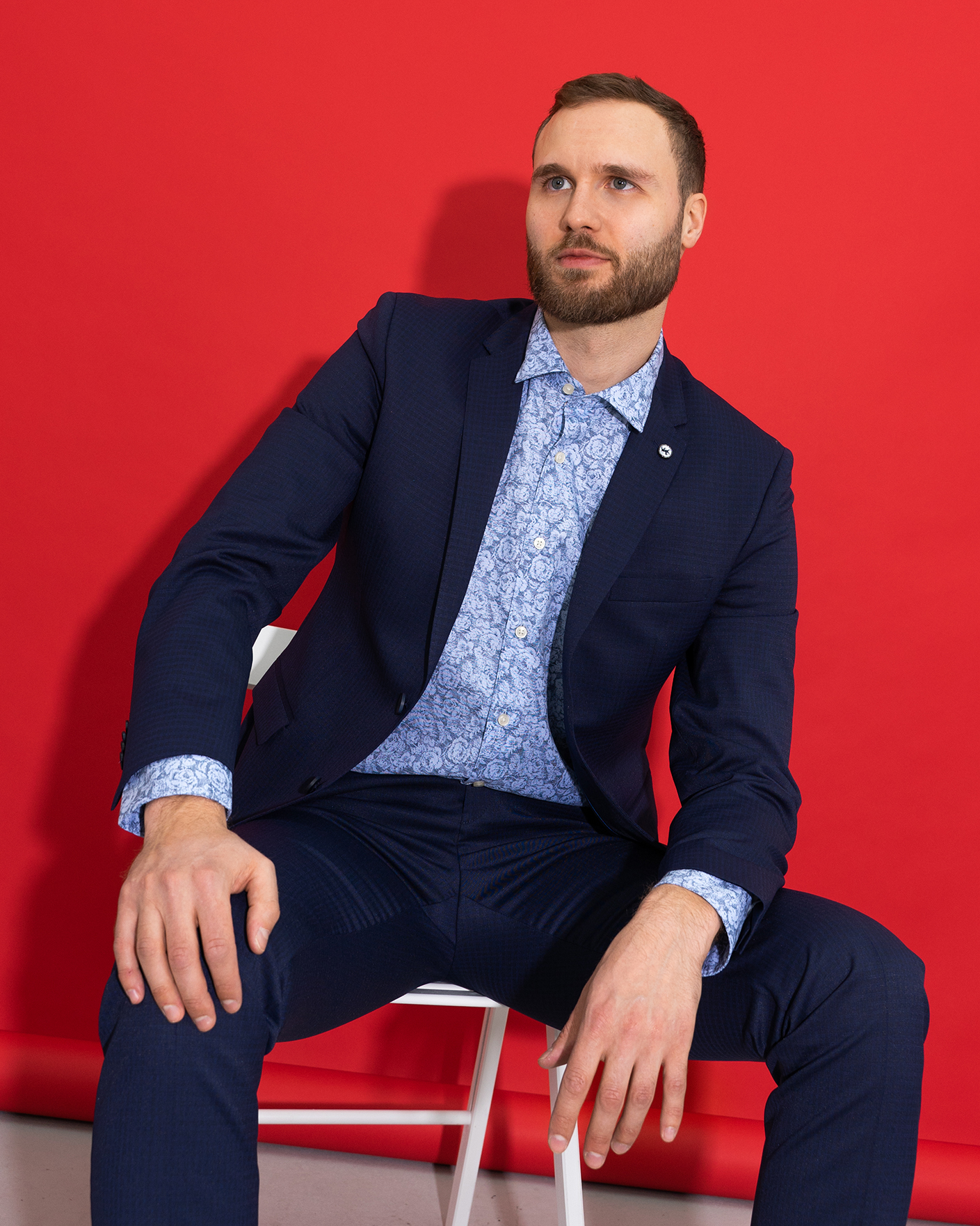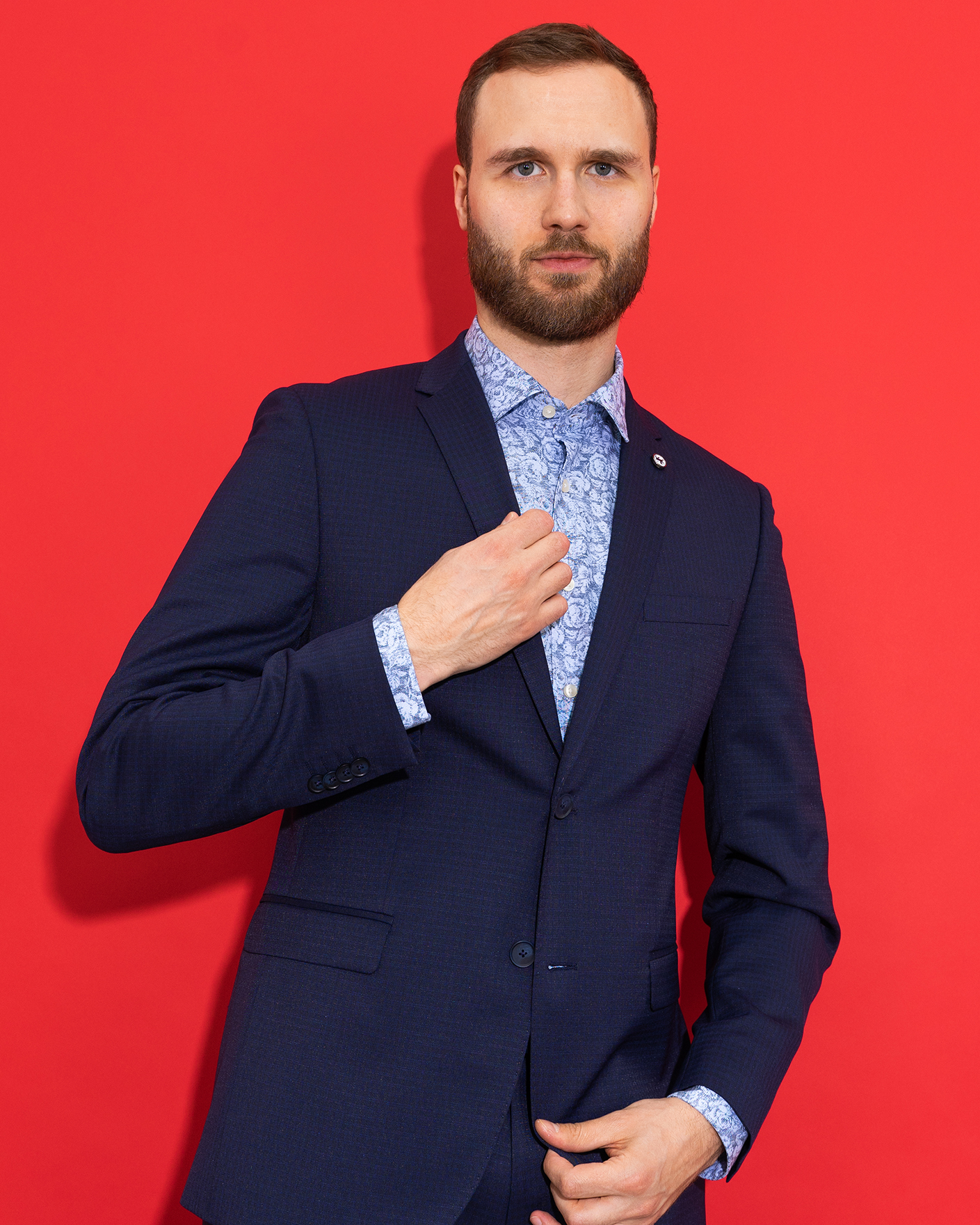 Классический костюм Truvor синего цвета в мелкую клетку. Пиджак с лацканами, застежкой на пуговицы и врезными карманами с клапанами по бокам. Брюки со стрелками, на скрытой застежке и шлейками под ремень. Костюм идеален как для работы в офисе, так и на праздничный вечер.