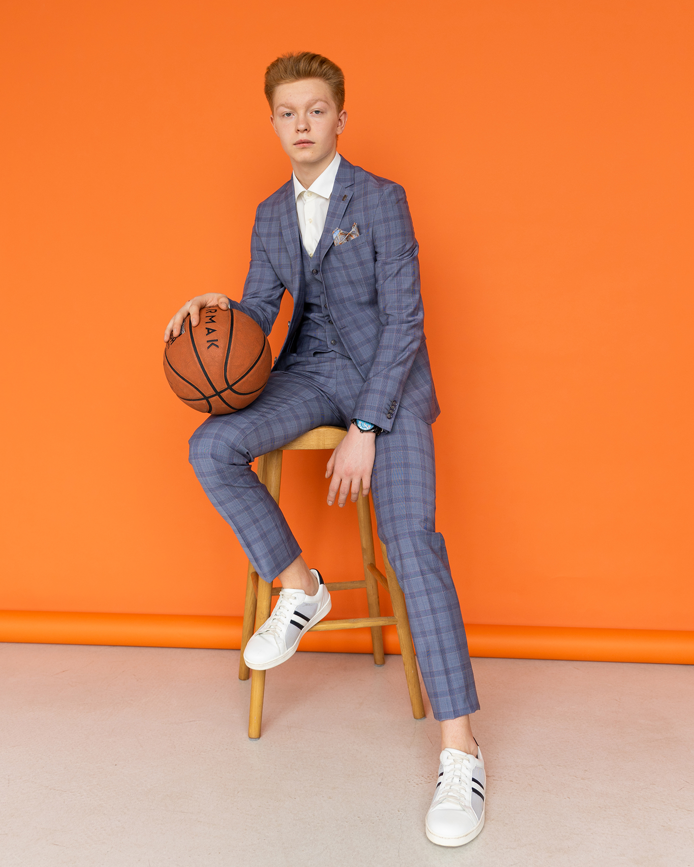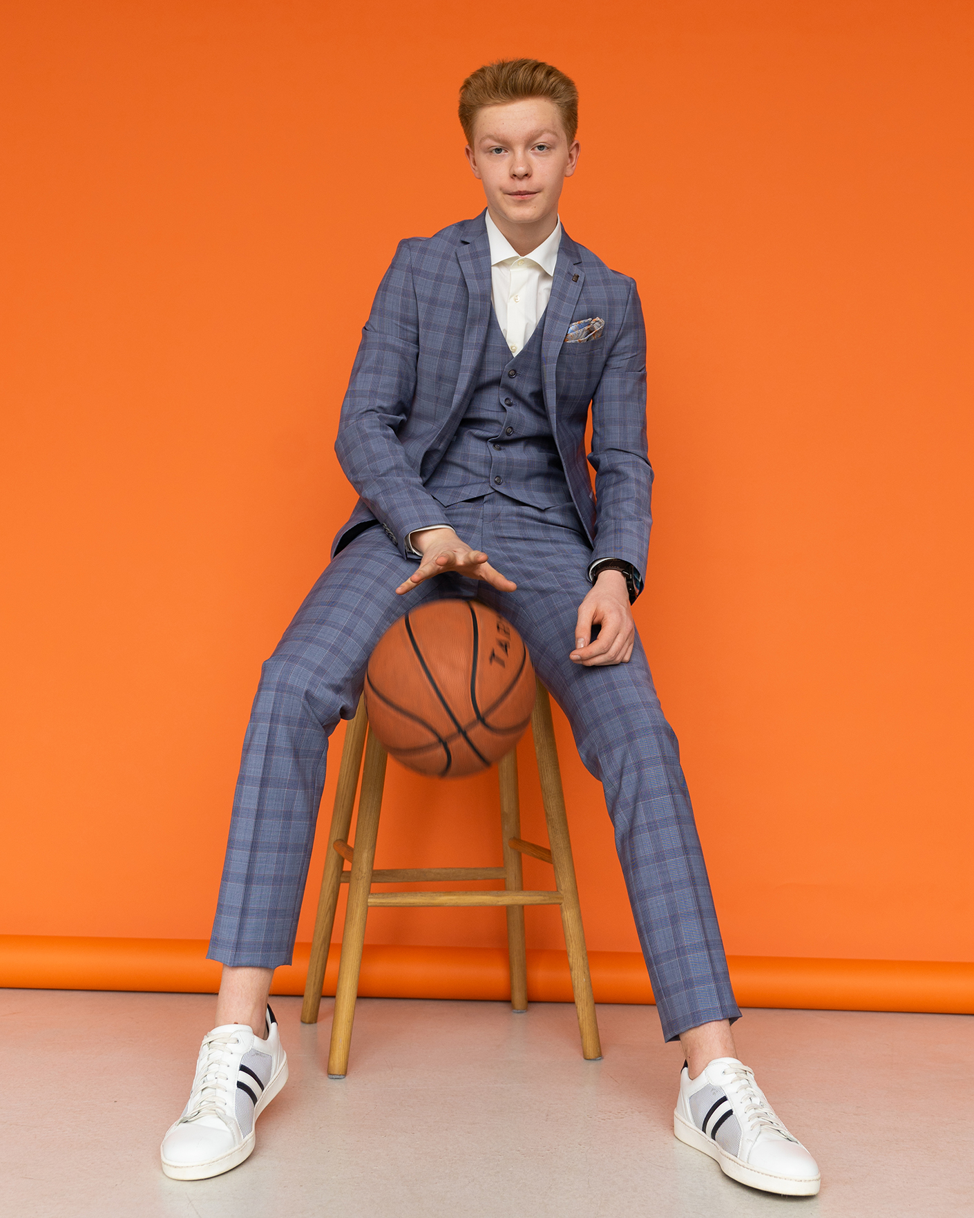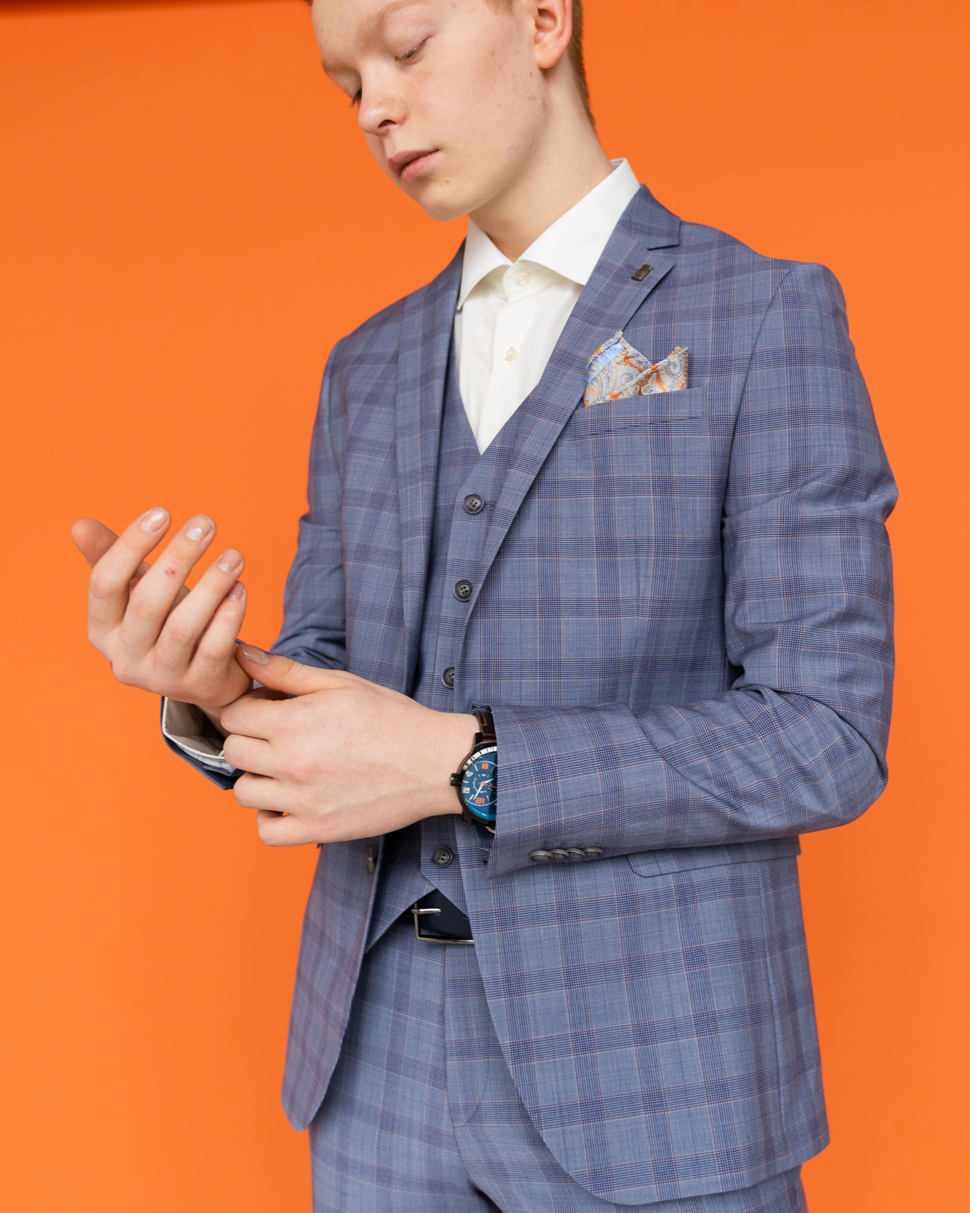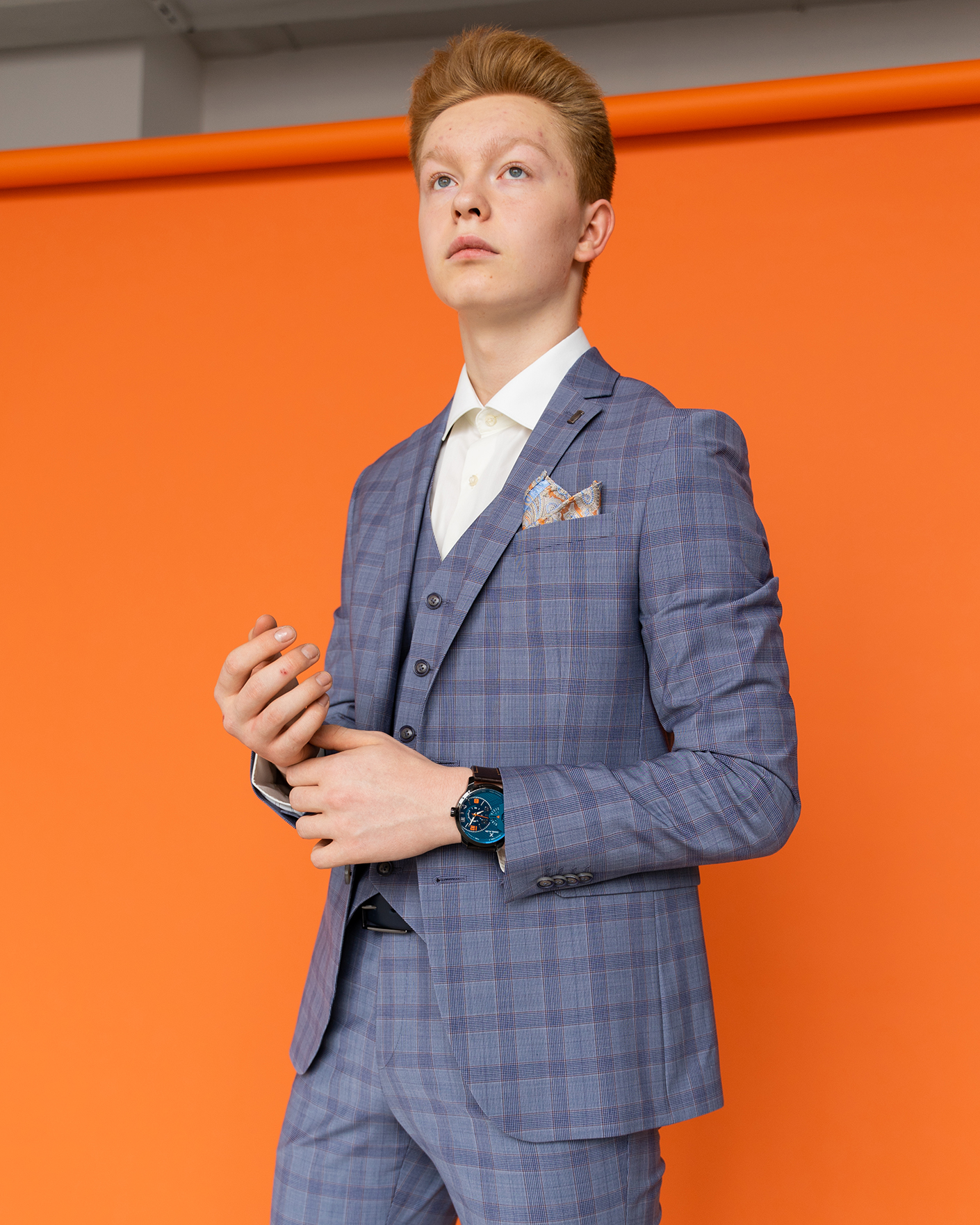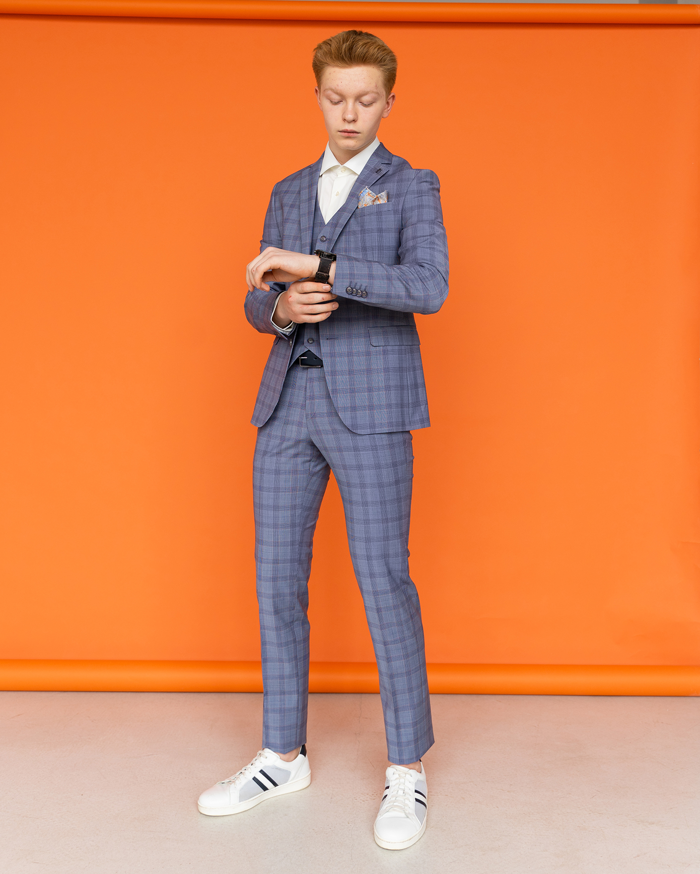 Стильный костюм Lexmer серо-голубого цвета в мультиклетку. Пиджак с лацканами, застежкой на пуговицы, имеются врезные карманы с клапанами по бокам и один на груди. Классические брюки со стрелками на стандартной застежке. Костюм - идеальный выбор на вечернее мероприятие.